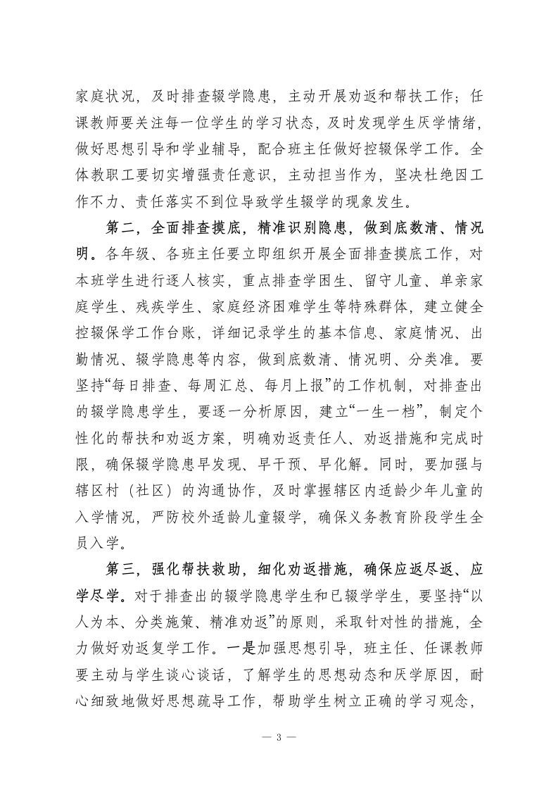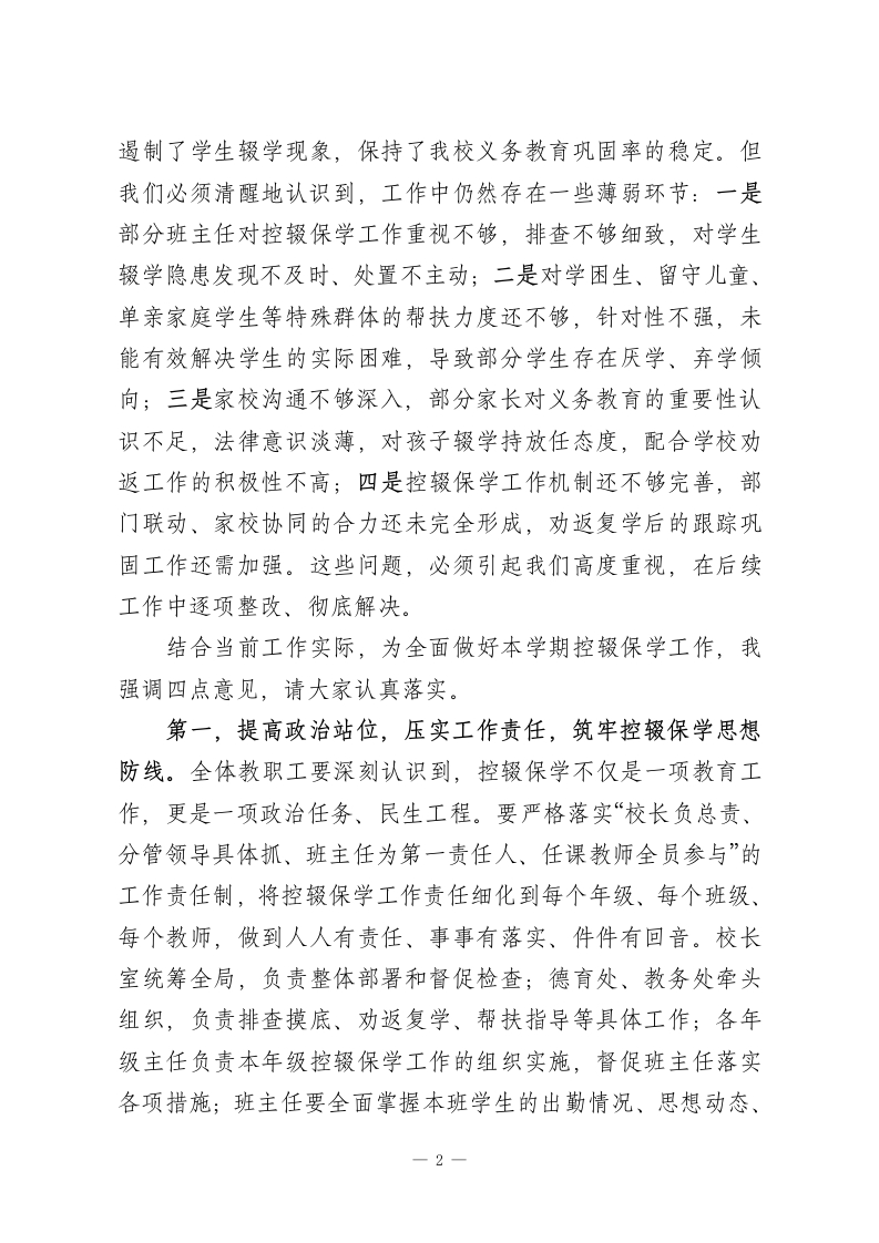 XX中学2026年春季学期控辍保学工作推进会校长讲话稿各位老师、同志们:大家上午好!今天,我们召开2026年春季学期控辍保学工作推进会,主要任务是深入贯彻落实国家、省、市、区关于控辍保学工作的各项决策部署,全面总结我校前期控辍保学工作开展情况,分析当前工作面临的形势和存在的问题,进一步统一思想、提高认识、压实责任、细化措施,全面筑牢控輟保学防线,坚决守住“不让一个学生因贫失学、因困辍学”的底线,确保我校适龄少年儿童全员入学、全程在校、全面发展。控辍保学是教育扶贫的底线工程,是义务教育的法定职责,更是关乎每个孩子未来、关乎家庭希望、关乎社会公平、关乎教育事业高质量发展的民生工程。春季学期是控辍保学工作的关键节点,随着新学期各项工作有序推进,部分学生因学业困难、家庭变故、思想波动等原因,出现辍学隐患,给我们的工作带来了新的挑战。全体教职工必须提高政治站位,深刻认识控輟保学工作的极端重要性和紧迫性,切实增强责任感和使命感,把控辍保学工作作为当前最重要的工作之一,扛在肩上、抓在手上、落在实处。回顾前期控辍保学工作,在全体教职工的共同努力下,我们扎实开展了排查摸底、劝返复学、帮扶救助等一系列工作,建立了控辍保学工作台账,对重点学生进行了跟踪帮扶,有效1