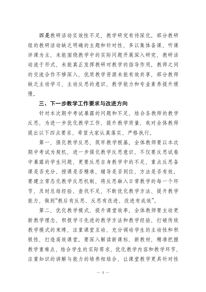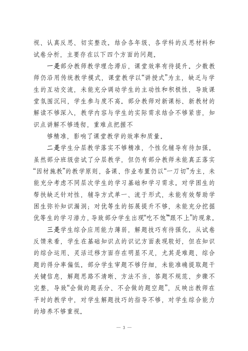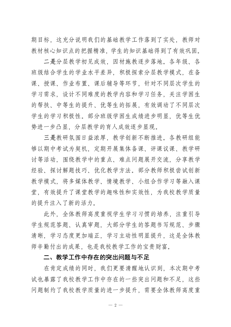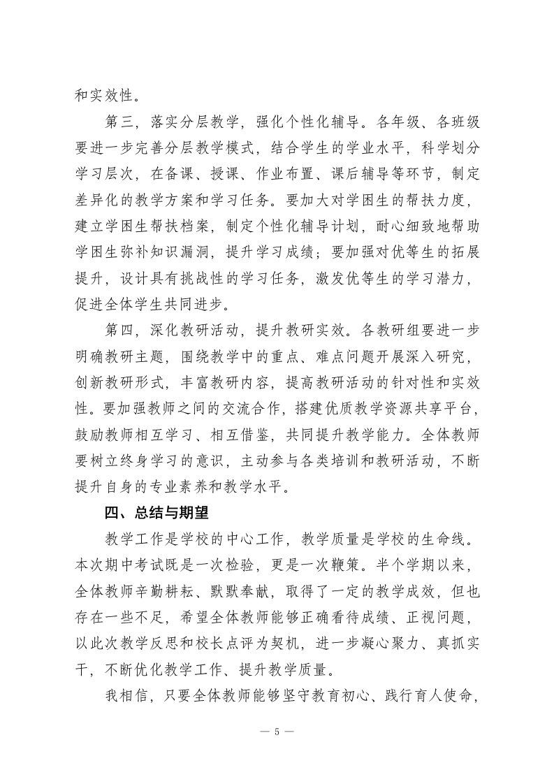XX中学2026年春季学期期中考试后教学反思校长点评各位老师、同仁:2026年春季学期期中考试已圆满结束,这既是对半个学期以来我校教学工作成效的全面检验,也是我们查找不足、优化教学、明确方向的重要契机。考试结束后,各年级组、各教研组、各任课教师均围绕本次考试情况,认真开展了教学反思,梳理了教学中的亮点与不足,提出了切实可行的改进措施。结合全校考试整体情况及各部门、各教师的反思材料,我代表学校,对本次期中考试后的教学工作作如下点评,希望全体教师凝心聚力、查漏补缺,推动我校教学质量再上新台阶。一、本次期中考试整体概况与教学亮点本次期中考试,我校严格按照中考命题标准和教学大纲要求,规范命题、严谨组织、公正阅卷,全面考查了学生对半个学期以来所学知识的掌握情况、能力的提升情况,整体呈现出“亮点突出、短板明显、潜力巨大”的特点。从教学层面来看,我们看到了全体教师的辛勤付出与教学工作的扎实成效,主要亮点体现在三个方面。一是教学常规落实到位,基础教学扎实有效。绝大多数教师能够严格遵守学校教学管理制度,认真落实备课、上课、作业批改、课后辅导等教学常规,做到课前精心备课、课上精准授课、课后及时反馈。从试卷反馈来看,学生基础知识点的得分率普遍较高,尤其是各年级基础题、中档题的正确率达到预1