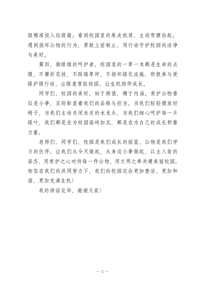 爱护公物,校长在国旗下讲话:以爱护之心,筑美好校园亲爱的老师们、同学们:大家早上好!当晨光洒满校园,我们踏着整洁的道路走进教室,望着崭新的课桌椅、先进的多媒体设备,心中是否涌动着一份珍惜与自豪?近期,校园改建工程圆满收尾,这焕然一新的环境,是学校为同学们创造的优质学习平台,更是我们共同的精神家园。古人云:不以规矩,不能成方圆。《中小学生日常行为规范》明确要求我们爱护公物、杜绝损坏、拾金不昧,这不仅是行为准则,更是衡量一个人道德修养的标尺,是一个民族文明素养的缩影。作为校园的主人,这份美好需要我们共同守护,这份责任需要我们共同担当。在此,我向全体同学提出几点殷切期望:第一,做公物的守护者。请像爱护自己的眼晴一样爱护课桌椅、黑板与讲台,不涂刻、不刮擦、不摔砸,让每一件物品都保持整洁完好;开关门窗轻手轻脚,珍惜班级的多煤体设备,不随意摆弄,共同维护教室的有序环境。第二,做资源的节约者。随手关灯、关电风扇,拧紧水龙头,杜绝长明灯、长流水;爱护电器开关、调速器等设施,发现损坏及时报告总务处,让节约成为一种习惯,让珍惜成为一种美德。第三,做环境的保洁员。不乱扔杂物,不随地吐痰,将垃一1