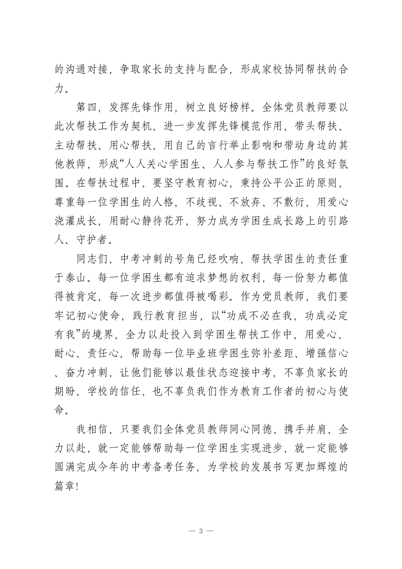 初中校长在党员教师帮扶毕业班学困生动员讲话各位党员教师、同志们:大家好!当前,中考备考已进入冲刺攻坚的关键阶段,每一位毕业班学生的成长与进步,都牵动着我们每一位教育工作者的心。今天,我们齐聚在这里,召开党员教师帮扶毕业班学困生动员会,既是落实立德树人根本任务的具体行动,也是发挥党员先锋模范作用、彰显教育温度的责任担当。在此,我代表学校党支部、校委会,向全体党员教师发出倡议,也提出殷切期望,希望大家以高度的责任感和使命感,投身到学困生帮扶工作中,用爱心、耐心和责任心,为每一位学困生撑起一片成长的天空。同志们,毕业班是学校教育教学成果的集中体现,而学困生的转化与提升,更是衡量我们教育工作成效的重要标尺。在座的每一位党员教师,都是学校教育教学的骨干力量,是立德树人的践行者,更是先锋模范的引领者。当前,部分毕业班学生由于基础薄弱、学习方法不当、心理压力较大等原因,在备考路上遇到了困难,成绩暂时落后,信心有所不足。作为党员教师,我们不能让任何一位学生掉队,不能让任何一份梦想落空。帮扶学困生,不仅是帮助他们弥补学业差距、增强备考信心,更是践行党员初心使命、落实教育公平、彰显教育温度的具体体现,更是我们义不容辞的责任与义务。在此,我向全体党员教师提出四点要求,希望大家严格落实、全力践行。-1