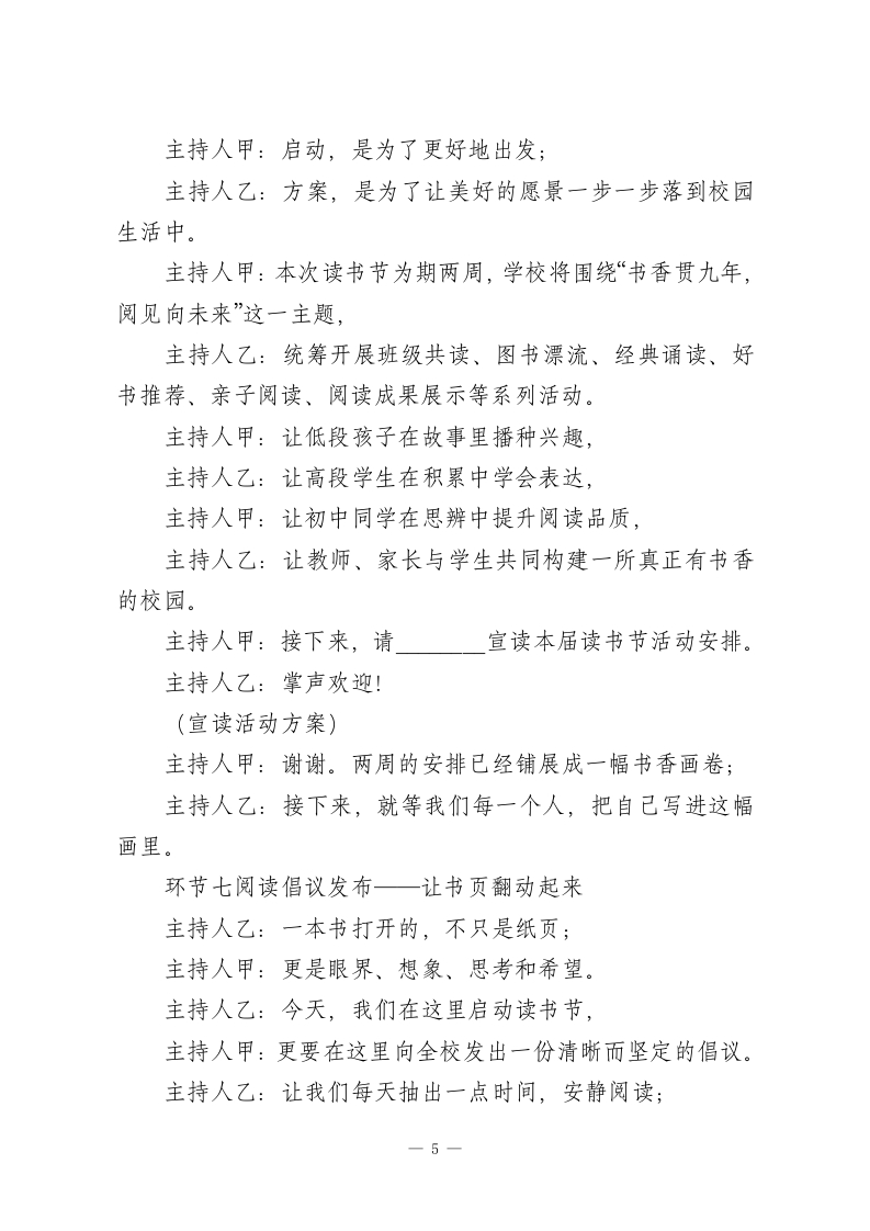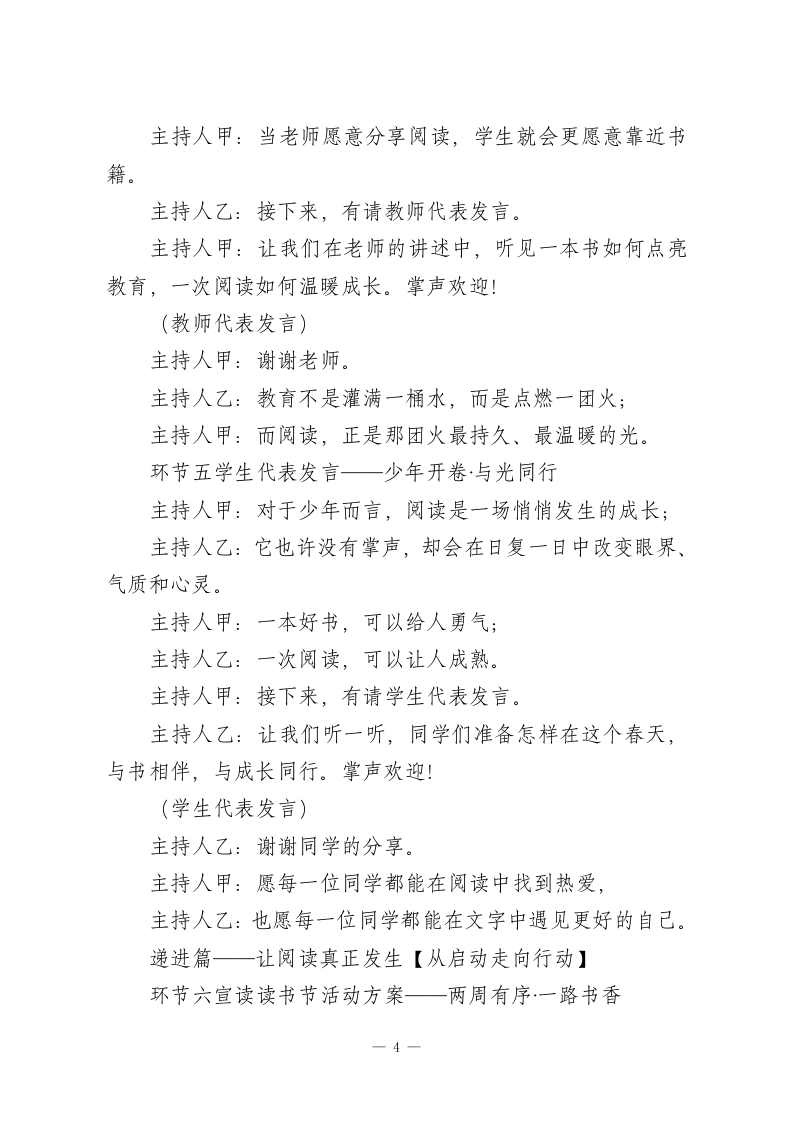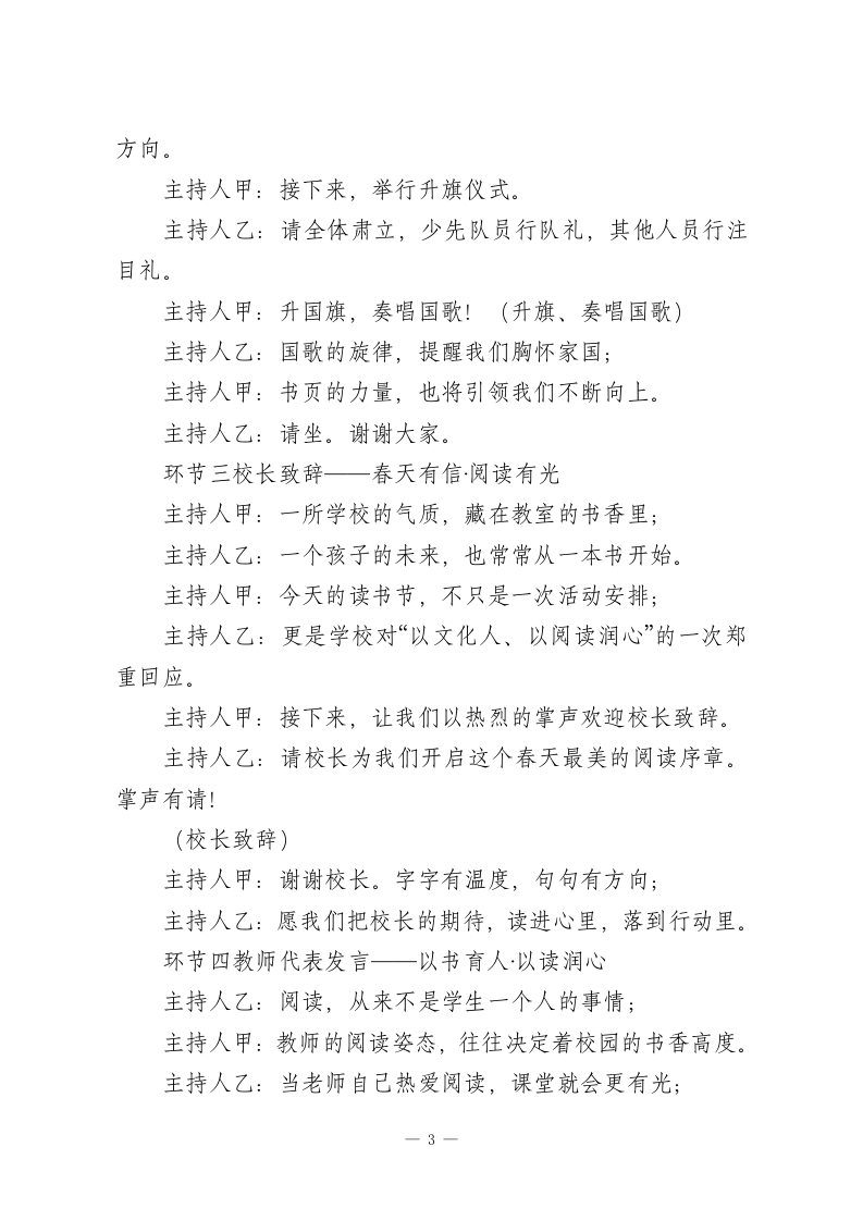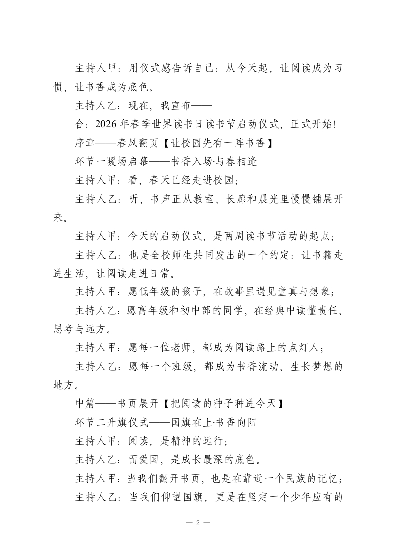 春风有信书香有约一一2026年春季读书节启动仪式主持词主持人:(甲)(乙))地点:学校风雨操场时间:2026年4月20日开篇仪式一以书为约·向春而行主持人甲:四月的校园,风里有花香,晨光里有书声:主持人乙:春天把万物唤醒,也把一颗颗向上的心,轻轻推向更广阔的远方。主持人甲:尊敬的各位领导、亲爱的老师们,主持人乙:亲爱的同学们,合:大家上午好!主持人甲:今天,我们相聚在这里,不只是开启一场活动;主持人乙:更是在开启一段与经典同行、与文字相伴、与成长相遇的旅程。主持人甲:一本书,可以让目光越过山海:主持人乙:一次阅读,可以让心灵变得丰盈。主持人甲:在第31个世界读书日到来之际,主持人乙:在书香校园建设持续推进之时,主持人甲:我们迎来了属于全校师生的春日盛会主持人乙:2026年春季世界读书日暨读书节启动仪式。主持人甲:今天,我们将用书声唤醒春天,主持人乙:用阅读点亮校园,一1