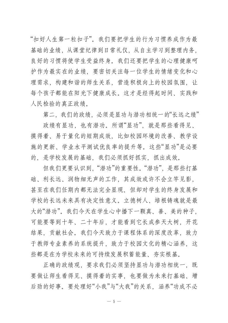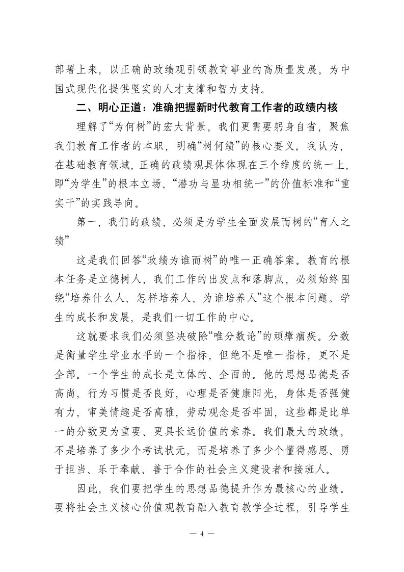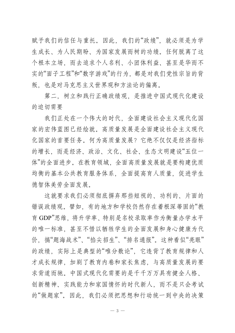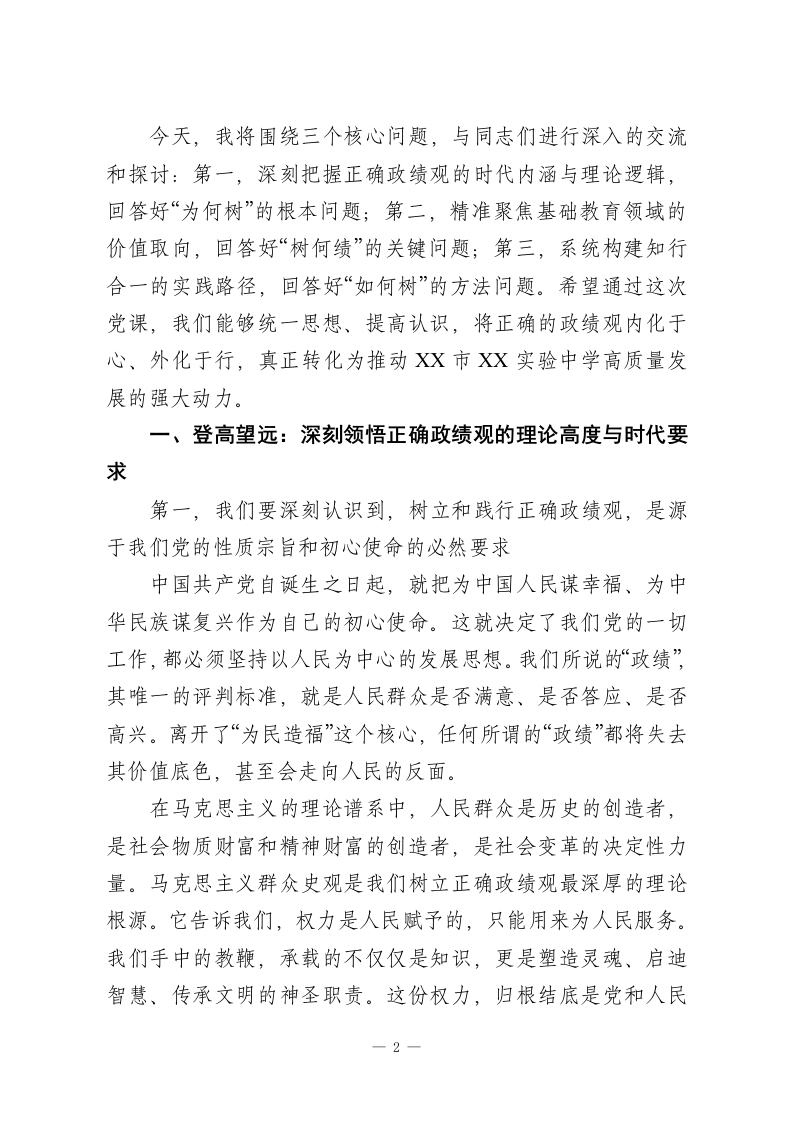 党课:永葆为党育人、为国育才的初心使命,树立和践行新时代教育工作者的正确政绩观同志们:今天,我们第一党支部全体党员齐聚一堂,召开一次意义深远的专题党课。我党课的主题是“永葆为党育人、为国育才的初心使命,树立和践行新时代教育工作者的正确政绩观”。之所以选择在今天,与同志们深入探讨这一课题,是基于我们当前所处的特殊历史方位和面临的时代要求。今年是“十五五”规划的开局之年,也是我们国家向着第二个百年奋斗目标迈进的关键时期。在这样一个承前启后、继往开来的重要时刻,我们每一位党员,特别是奋战在基础教育一线的党员教师,必须对“政绩为谁而树、树什么样的政绩、靠什么树政绩”这一根本性问题,进行一次深刻的自我审视和思想洗礼。政绩观,从来不是一个空泛的理论概念,它是世界观、人生观、价值观的集中体现,是我们党员干部党性修养的“试金石”更是我们的“方向盘”和“指南针”。对于我们教育工作者而言,我们所追求的“政绩”,关系到千家万户的期盼,关系到国家和民族的未来。因此,能否树立和践行正确的政绩观,直接决定了我们能否不折不扣地落实立德树人的根本任务,能否办好人民满意的教育,能否为实现中华民族伟大复兴的中国梦培养出合格的建设者和可靠的接班人。一1