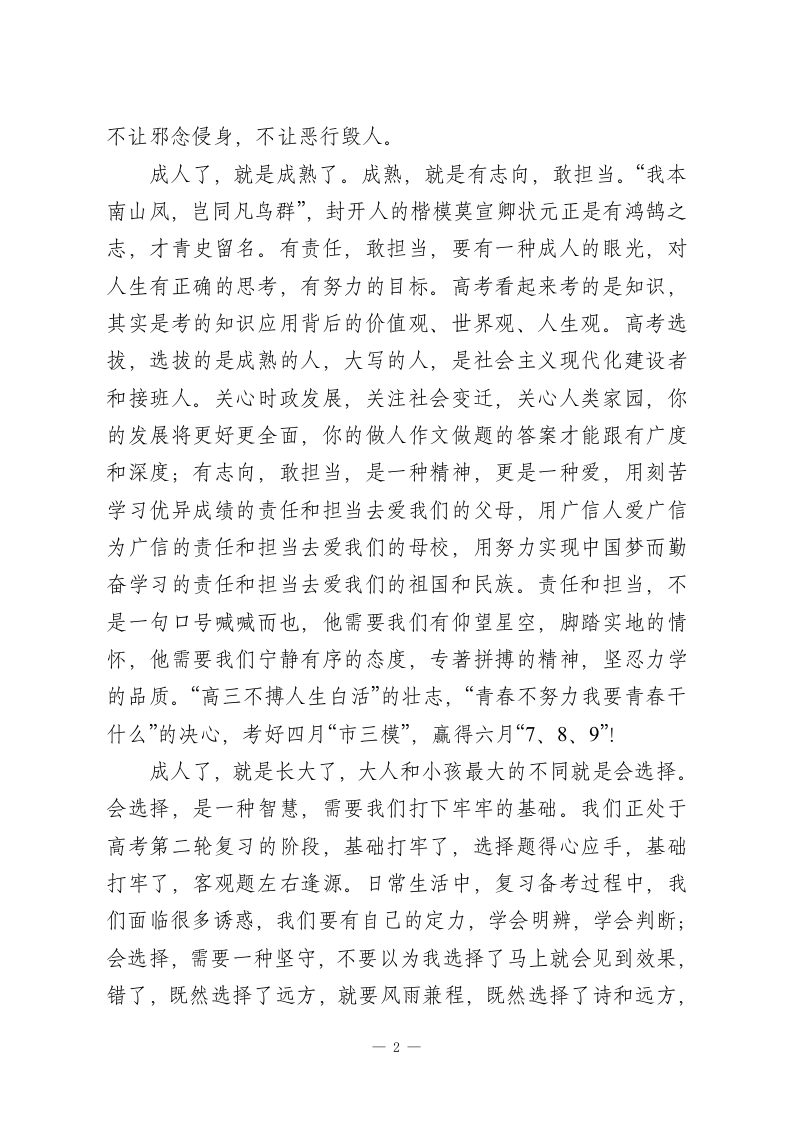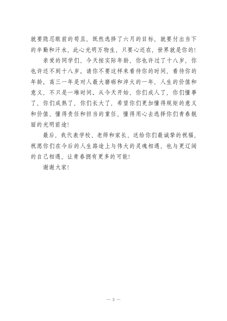 党总支书记、校长在高三成人礼仪式上的致辞:让青春拥有更多的可能尊敬的各位家长、各位来宾,亲爱的老师们、同学们:大家上午好!红日初升,其道大光;十八而至,青春启航。今天,我们齐聚XX校园,隆重举行“沐光而立,十八向阳;青春无恙,未来明亮”高三学子的18岁成人礼。首先,我谨代表学校党总支、行政班子和全体师生,向迈入成人行列的同学们,致以热烈的祝贺!向莅临现场的各位来宾、家长,表示诚挚的欢迎!向默默耕耘的全体高三老师,致以崇高的敬意!现场,看到同学们和父母坐在一起,我有许多的感慨:和父母坐在一起,是一种福啊,是一种温馨啊,是一种温暖,是一种力量,和父母坐在一起,你应该能感受到山的稳重,水的柔情,孟母的智慧,虎妈的期待啊…,同学们,请珍惜和父母坐在一起的机会,成人了,你们将有自已的天空,有自己的精彩世界,和父母在一起的时间会变得更少,弥足珍贵!成人了,就是懂事了。懂事,就是懂规矩。做事有做事的规矩,做人有做人的方圆。在学校在班级要遵守纪律,在社会在集体要遵守秩序。成人和孩子的最大区别,是懂得为我和为人。为我好是本能,为我好同时也要为他人好正能,有正能量的人,是一个有格局的人,是一个大众喜欢的人。懂规矩,要慎微,从小事做起,勿以善小而不为,勿以恶小而为之;懂规矩,要慎独,在自己独处的时候,在父母师长不在身边的时候,1