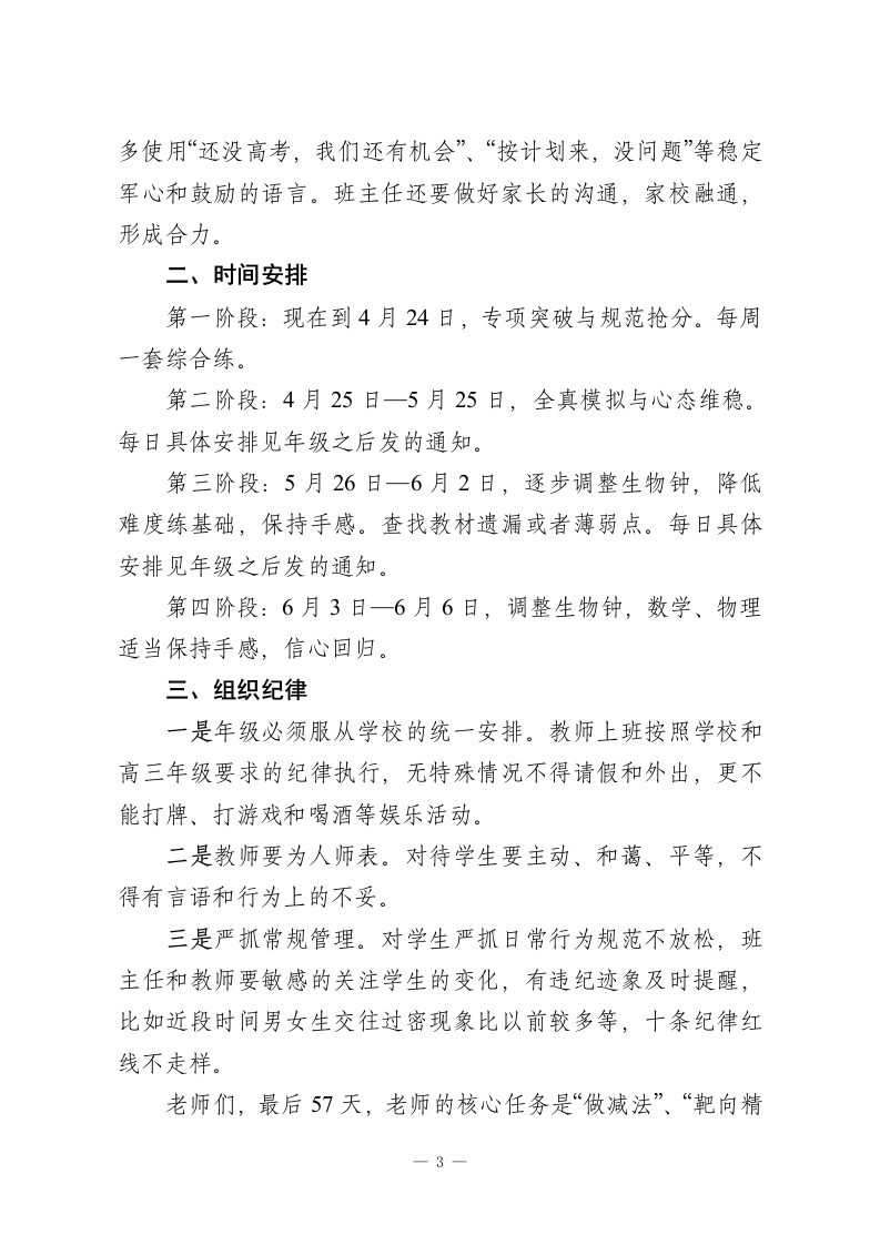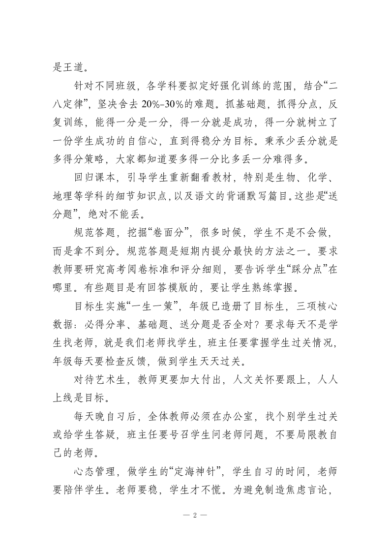 副校长在XX县XX高级中学2026届高考冲刺动员会上的讲话各位老师:大家好!首先,感谢学校对我们年级长期以来一如既往的关心和支持。同时也衷心感谢各位教师密切配合年级组工作,全心投入,紧密团结,不断取得进步,不断创造宏星的辉煌,你们辛苦了!之前的所有复习是对知识的再现和延伸,主要目标是把高考要考的范围进行知识性覆盖。我们教师付出很多,但学生成绩上升不明显,距离高考特控和本科还有一定差距。根据高考规律,现在这个时间段是高考复习中性价比最高的“黄金提分期”。把控得好,提分显著;把控得不好,有些学生成绩还会下滑,还会厌烦复习,不想考试,表现为无助,甚至心理崩溃。5月份前要提升学生复习的主动性和激情,树立学生准备高考的自信心,为5月份进行(全真)综合模拟训练打好基础。一、复习策略总要求:要把复习策略从“全面覆盖”转向“精准打击”,从追求面面俱到,转到帮学生把那些“能拿但还没拿稳”的分数抓回来,同时在应试技巧和心态上给他们兜底。各学科、各位老师,开动脑筋,群策群力,明确学生对象,精准选择内容,计划安排好高频考点“微专题”或需突破的题目,不要再按章节或板块复习,而是按“题型”突破,这是目前复习的核心方法,用“最小努力”换“最大涨幅”。关键是落实,落实才1