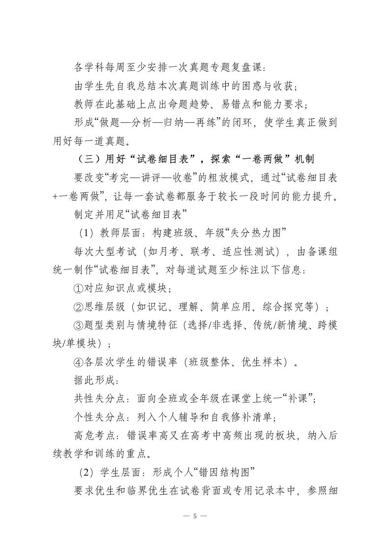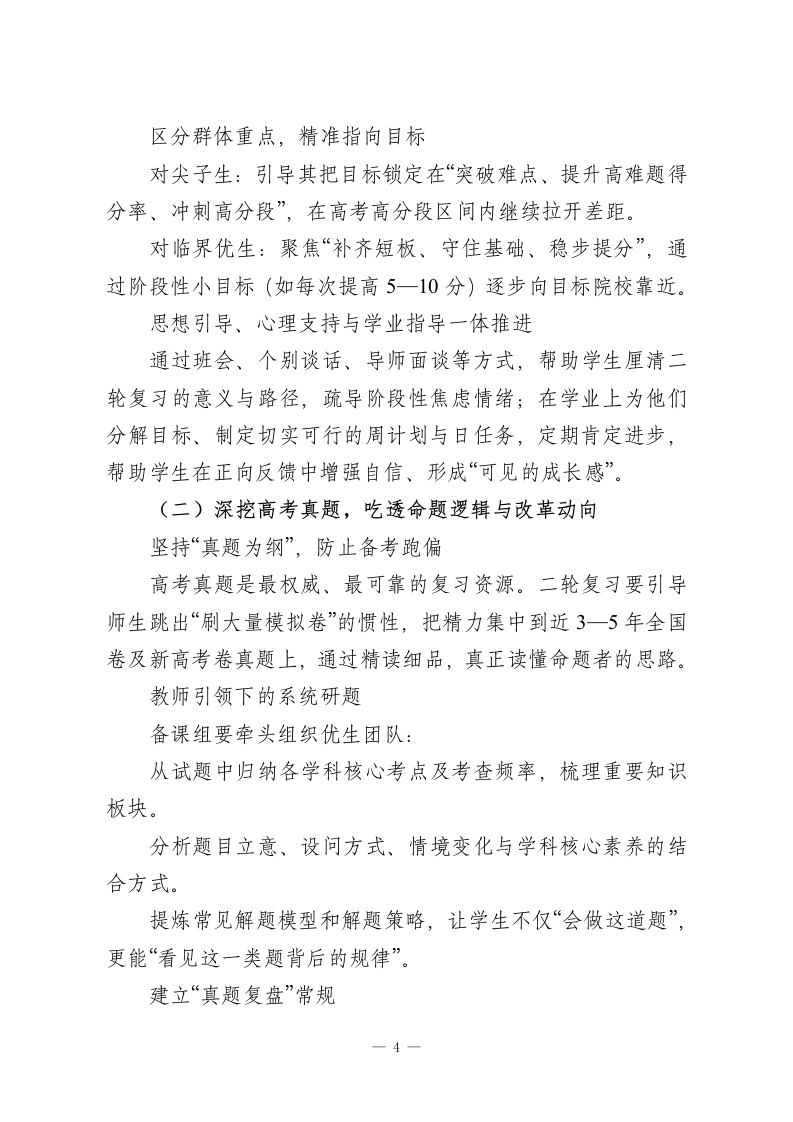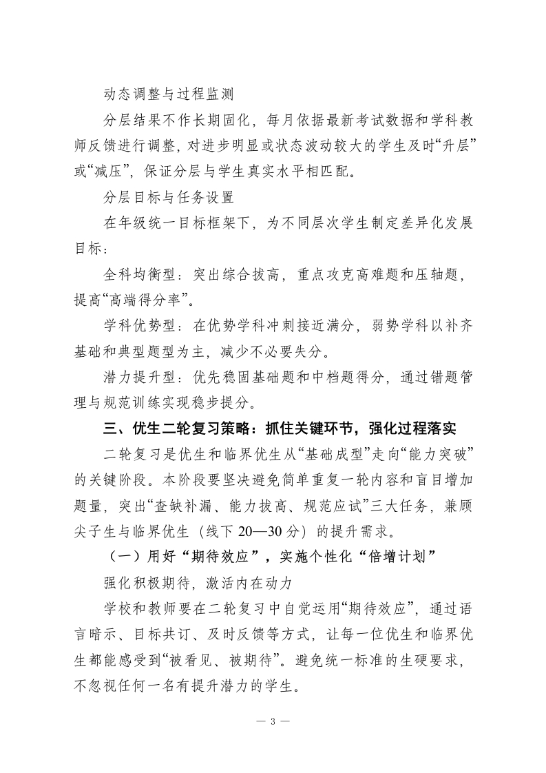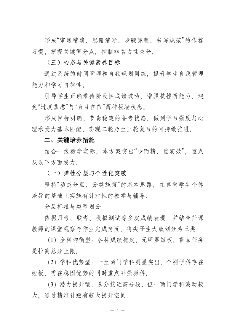 高三尖子生培养实施方案及优生“二轮”复习策略高三尖子生是学校冲刺高分、提升升学质量的关键群体。立足我校生源特点和现有教学基础,本方案坚持“精准施策、高效推进、注重持续”的工作思路,紧紧围绕高考评价导向,在强化知识建构、能力提升的同时,统筹心态调适与节奏管理,避免粗放管理与过度细化并存的弊端,着力帮助尖子生在高考中发挥最大潜能。一、核心目标尖子生培养总体遵循“扬长、补短、强能、稳心”的原则,聚焦以下三方面目标:(一)学业突破目标在巩固学科基础的前提下,进一步完善各学科知识网络,打通章节之间、学科之间的内在联系,形成系统化的知识结构。针对高考高频考点、重难点和易错点进行深度攻坚,解决一轮复习遗留的知识断层和薄弱环节,推动总分突破瓶颈区。为冲击重点高校、双一流高校以及强基计划、拔尖计划等高端升学通道奠定扎实学业基础。(二)应试能力目标通过有计划的限时训练和真题研磨,提升解题速度和准确率,形成稳定、可控的考试节奏。培养学生在复杂情境下进行知识迁移与综合运用的能力,准确把握新题型、新情境的解题路径。一1