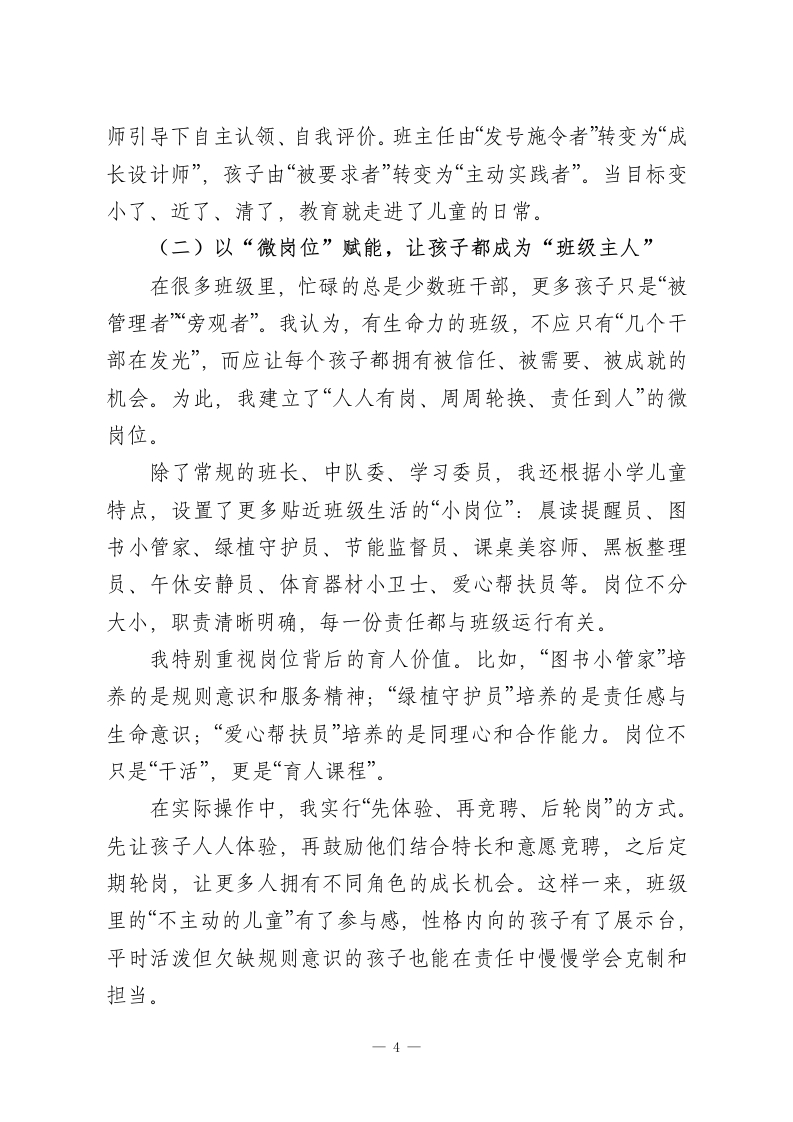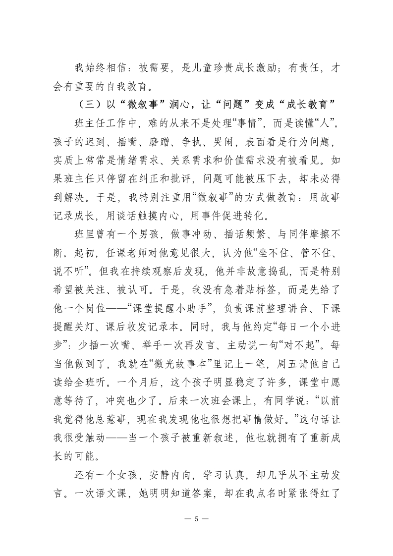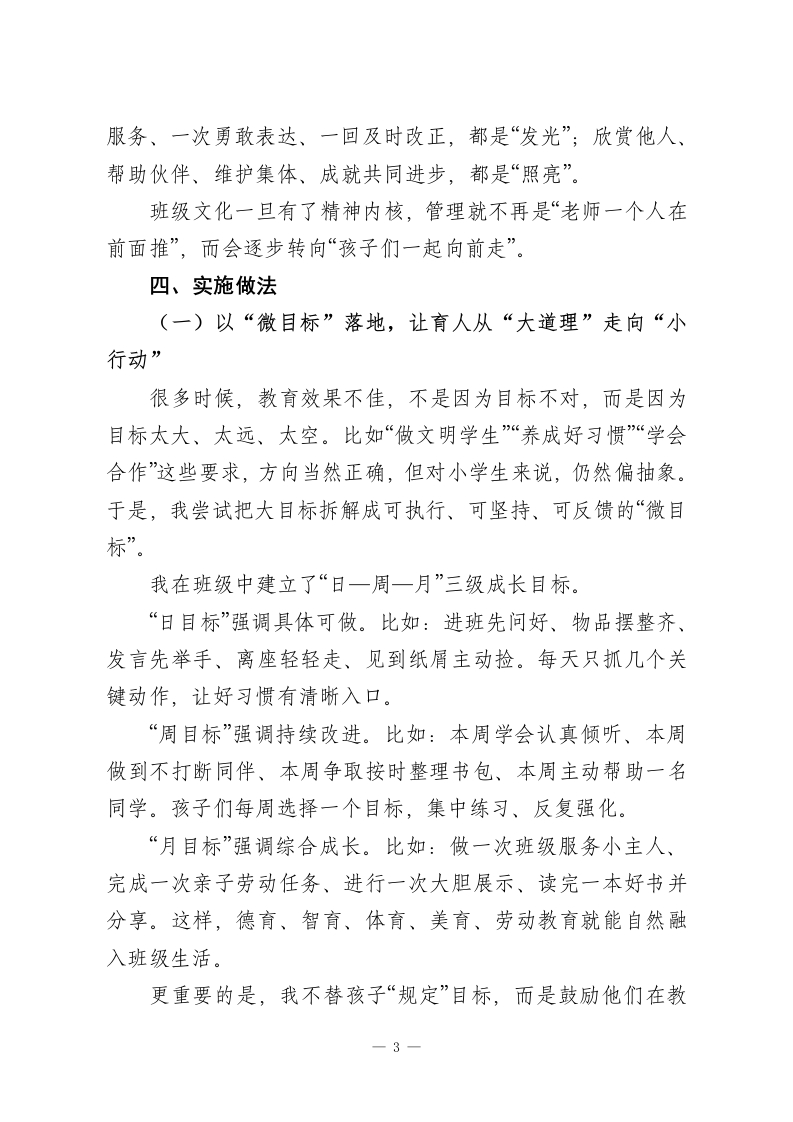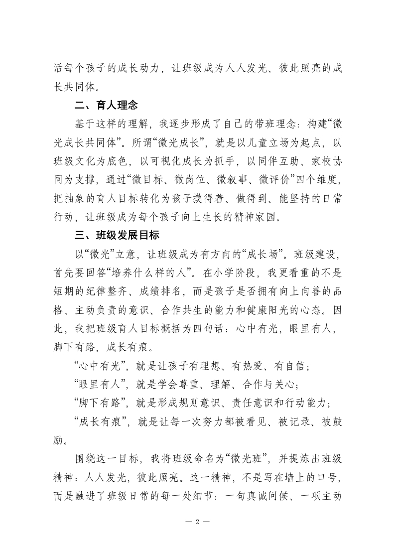 看见每一人,点亮每一天一一“微光成长”带班育人方略有人说,教育是点燃;也有人说,教育是唤醒。于我而言,班主任工作既不是简单的“管理”,也不是被动的“应付”,而是一场面向儿童生命成长的温暖陪伴。班级里的每一个孩子,都像一束正在形成的光:有的明亮外放,有的安静微弱,有的暂时被情绪遮住了锋芒,有的还没有找到属于自己的方向。班主任要做的,不是用同一把尺子丈量儿童,而是帮助每一个孩子看见自己、接纳自己、发展自己,让一束束微光汇聚成照亮彼此的星河。一、班情分析本班是由45名性格迥异、成长节奏不同的学生组成的“微光”集体,学生整体纯真向上、可塑性强,但个体差异与发展不均衡的特点十分突出,贴合小学中低年级班级真实状态。学生在行为习惯上分化明显:部分孩子自律性强、做事有条理,但多数学生存在整理拖沓、课堂自控不足、随意插话等问题;在性格与表达上,外向学生乐于表现却易冲动,内向学生心思细腻、学习认真,却长期不敢主动发言,害怕出错;在班级参与度上,仅少数班干部承担事务,大部分学生缺乏服务意识与主人翁感,处于“被动跟随”状态。学生内心都渴望被认可、被看见,却缺少适配的成长平台:家校沟通多聚焦作业与成绩,对习惯、品格、情绪的关注不足,共育合力较弱。需以小切口、可落地的方式精准引导,就能激1