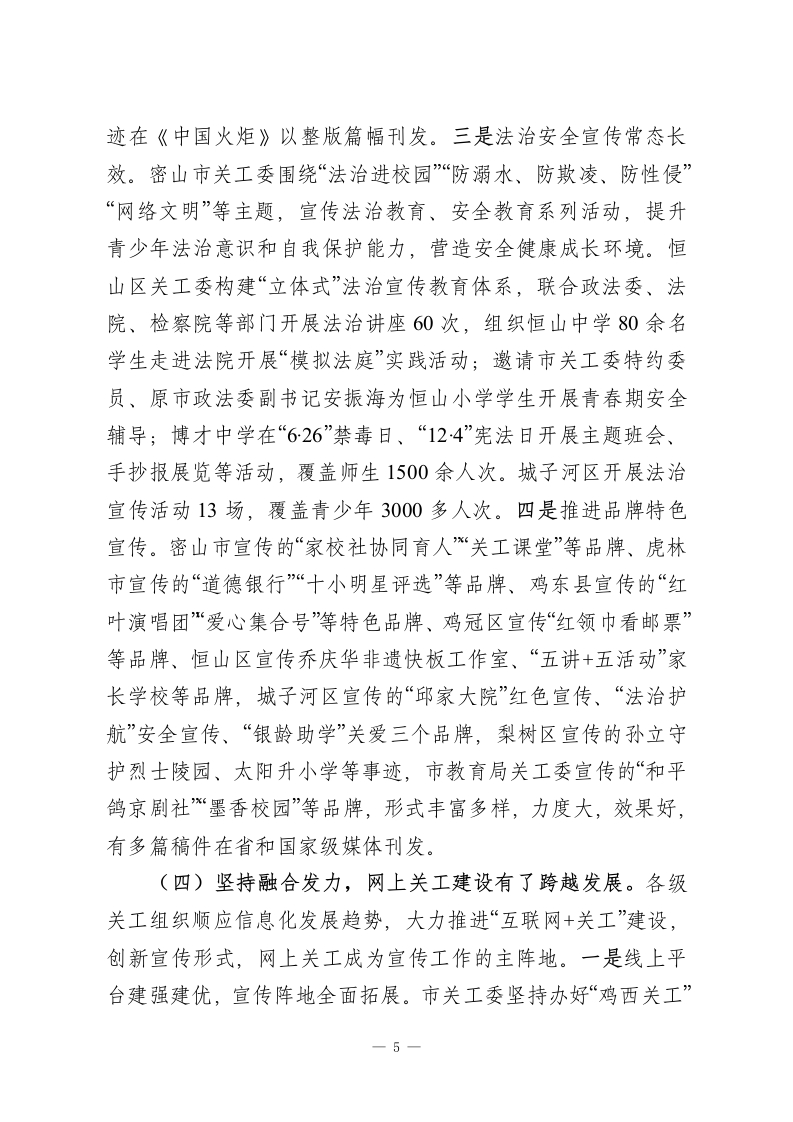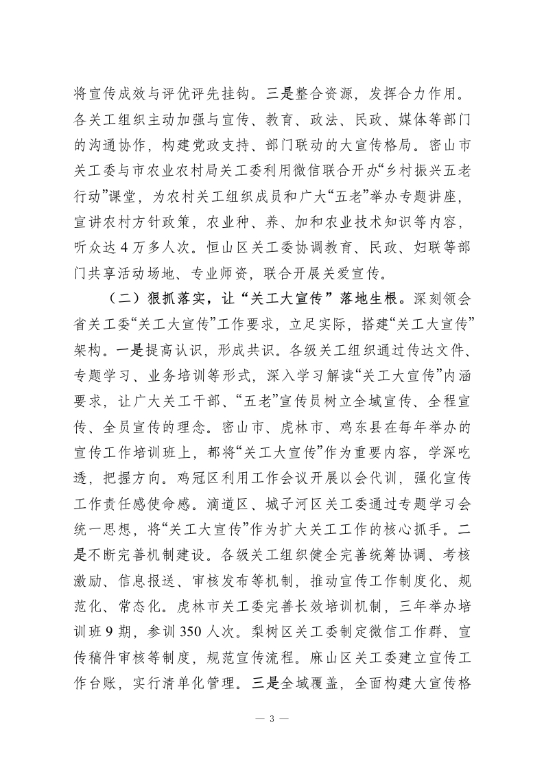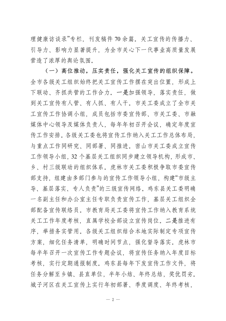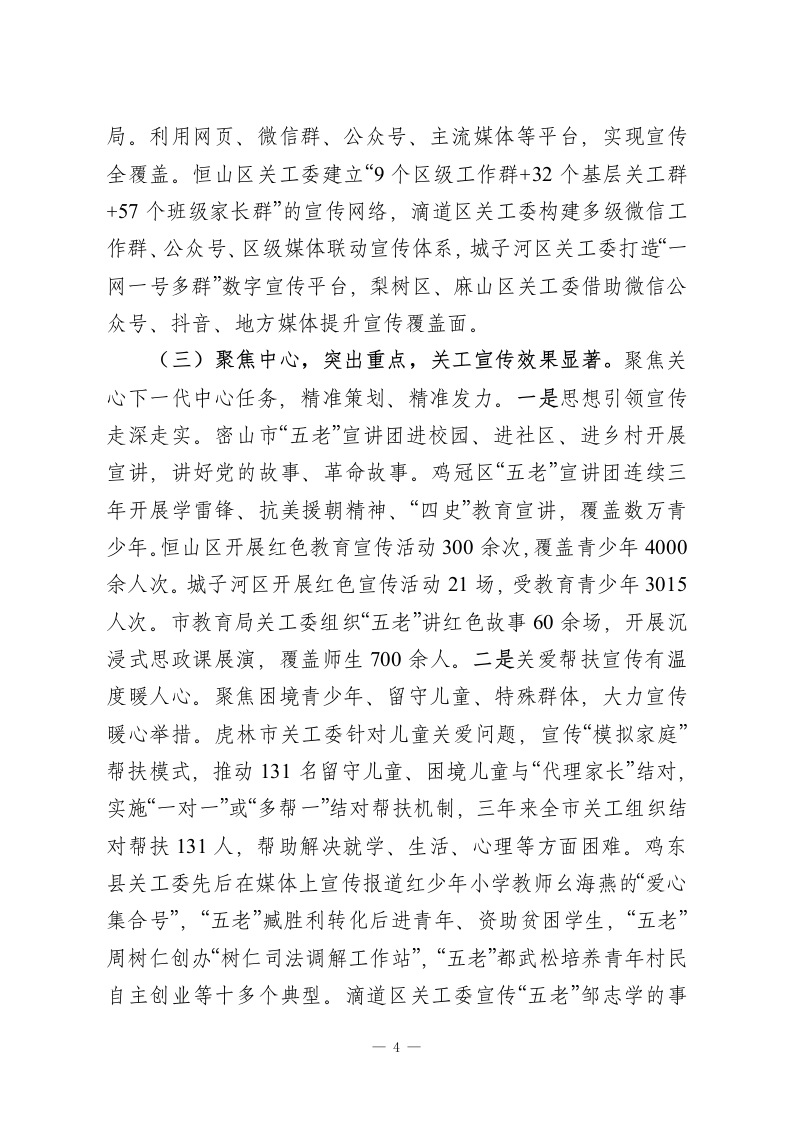 凝心聚力融合创新开创全市关工宜传工作新局面一一在全市关心下一代宜传工作会议上的讲话同志们:今天,我们召开全市关心下一代宣传工作会议,主要任务是深入贯彻落实省关工委“关工大宣传”工作部署,总结2023一2025年全市关工宣传工作取得的进展,部署下一阶段重点工作,进一步提高认识、压实责任,推动全市关心下一代宣传工作再上新台阶,促进关心下一代工作健康发展。下面,我讲两个方面的意见。一、三年来全市关工宣传工作总结过去三年,是全市关心下一代宣传工作守正创新、跨越发展的三年。在市委的坚强领导下,在省关工委的精心指导下,始终坚持以习近平新时代中国特色社会主义思想为指导,把握正确政治方向,紧扣“关工大宣传”要求,统筹谋划,突出重点,在关工宣传上稳步推进,效果明显。2023一2025年,全市关工战线对上对内刊发稿件2048篇,其中在《中国火炬》发稿19篇,在中国火炬网站发稿122篇,在“今日关工事”发稿688篇;在省关工委《双阳红》杂志发稿217件(含图片),省关工委网站发稿229篇,省关工委公众号发稿32篇,省关工委简报发稿38篇;市关工委刊发基层信息382条,公众号发188篇,在鸡西日报连续三年开设“爱心集结号”“十小明星风采”“青少年心