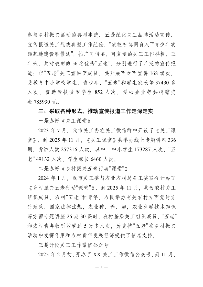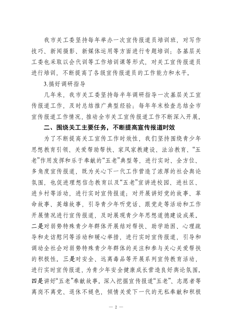 全市关心下一代宣传工作会议经验材料汇编(一)近年来,XX市关工委认真贯彻落实省、XX市关工委关于做好关工宣传工作文件精神,坚持以习近平新时代中国特色社会主义思想为指导,深入学习贯彻习近平总书记关于关心下一代工作的重要指示批示精神,紧扣“立德树人“服务青少年”的根本任务,按照“关工大宣传”理念,把关工宣传工作摆上重要位置,全方位讲好关工故事、传播关工声音,为推动青少年健康成长和关工工作高质量发展营造浓厚的社会舆论氛围。一、提高政治站位,压实宣传工作责任1加强领导、落实责任一是加强领导。市关工委成立关工宣传工作领导小组,常务主任担任组长;各基层关工委成立关工宣传工作领导小组,常务主任担任组长。二是建立组织队伍。市和32个基层关工委都成立关工宣传工作办公室,负责抓好日常关工宣传工作。市关工委组建了32人的宣传报道员队伍;32个基层关工委都成立由关工小组常务副组长组成的宣传报道员队伍,其中:16个乡镇关工委有乡村报道员156名,每一个关工小组都有1名宣传通讯员;16个市直部门关工委有16名宣传报道员:市教育局所属的36所中小学校关工委都安排1名关工宣传报道员。我市关工委成立了由14人组成的“五老”关工宣讲团,32个基层关工委都建立了由“五老”组成的关工宣讲分团。2.抓好培训1