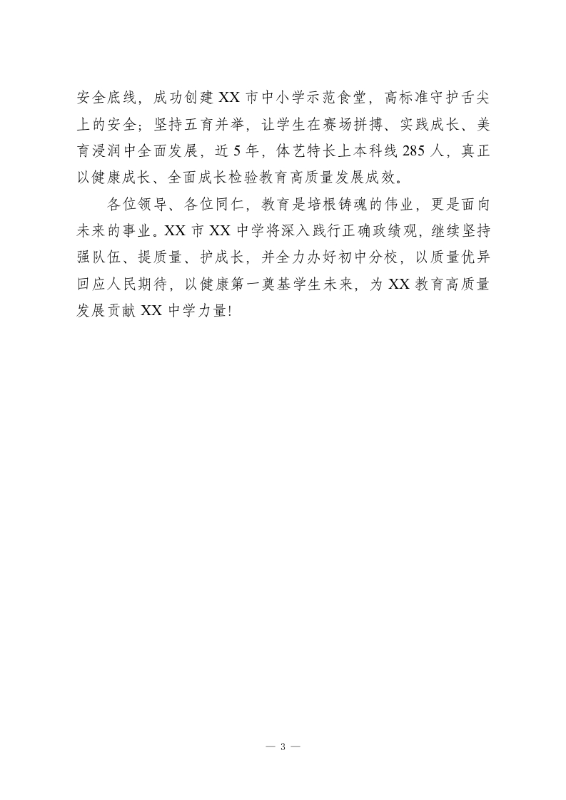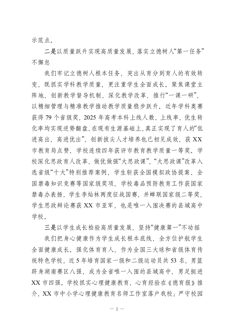 市XX中学党委书记在XX市教育高质量发展大会上发言尊敬的各位领导,各位同仁:大家好!我发言的题目是《深耕质量立校践行健康育人》。今天能在此发言,我倍感荣幸。这份荣幸,源于市委、市政府对教育的高度重视和厚爱,来自教育局的悉心指导和信任。2026年教育部将“健康第一”作为主题,市委、市政府闻令而动、迅速响应,始终坚持教育优先、健康第一,为我们办学治校指明了方向。XX市XX中学对标对表、紧跟步伐,坚守“面向每一个学生,高贵其精神,引爆其潜能”的办学理念,在高质量发展中全力践行“健康第一”的育人追求。围绕“健康第一与高质量发展”的主题,结合办学实践,我以三个“第一”分享探索与体会。一是以队伍建强支撑高质量发展,突出师德师风“第一标准”不放松我们始终把师德师风作为教师建设第一标准,坚持政治引领、师德铸魂、能力强基,常态化开展师德学习、榜样引领、警示教育,引导教师以德立身、以德施教。搭建“青蓝工程”“名师工作室”成长平台,推行“同课异构”校本研修,分层分类赋能教师专业成长。完善激励机制,让实干者实惠、优秀者荣光、奉献者暖心,全力打造有情怀、有担当、有本领的教师队伍。近5年,70余位教师获评省市级师德先进,16人斩获省级教学竞赛奖项,50余人成为XX市骨干教师与学科带头人,一项教育部规划课题获评良好,学校获评XX市三星级职工心理关爱一1