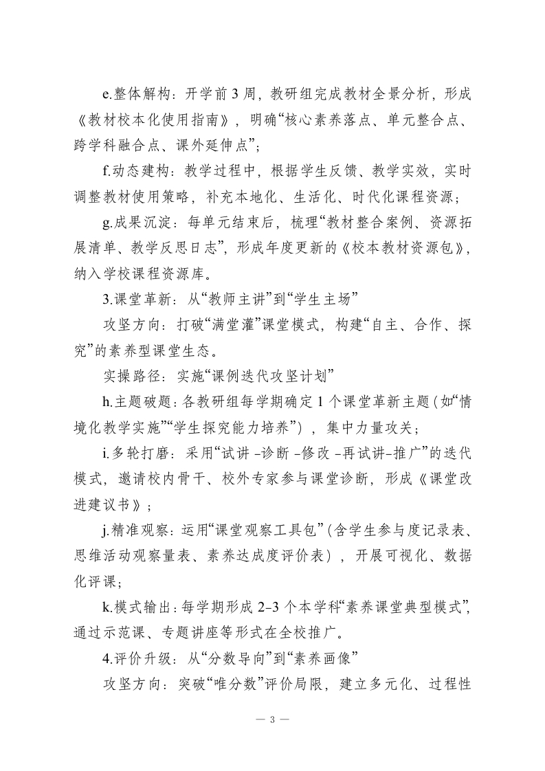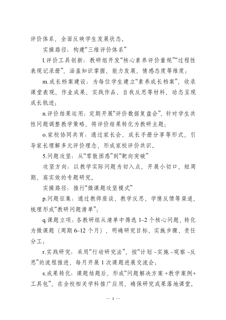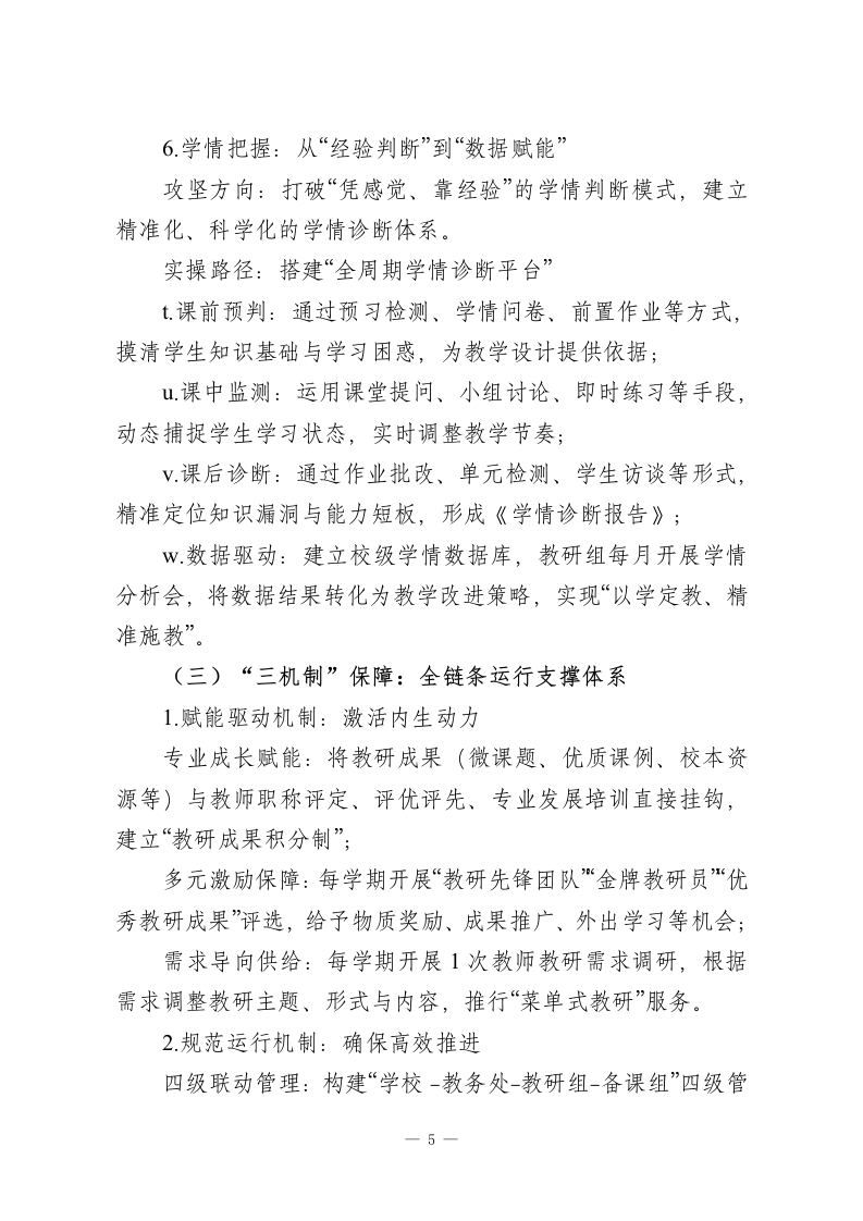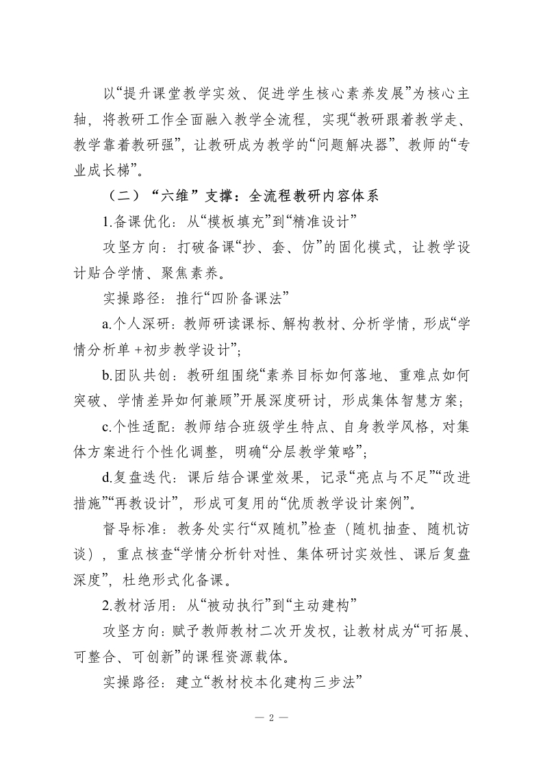 校本教研体系深度建设实施方案一一以“一体六维三机制”赋能教育高质量发展一、核心愿景立足新课程改革要求,锚定教育高质量发展目标,针对校本教研“重形式轻实效、重活动轻落地”的突出痛点,构建“教学研一体化”生态体系,推动教研工作实现“三个转型”:从经验驱动向专业引领转型、从零散推进向系统设计转型、从单向输出向双向赋能转型,让教研真正成为提升课堂品质、促进教师成长、赋能学生发展的核心引擎。二、现存痛点剖析当前校本教研工作仍存在四大亟待破解的问题:1.供需错位:教研内容脱离教学实际,聚焦“表面问题”多、破解“真难题”少,难以回应教师课堂教学迫切需求;2.参与被动:教研活动呈现“少数人主导、多数人旁观”的局面,教师参与缺乏主动性、思考缺乏深度,难以形成共鸣与共创;3体系缺失:教研计划缺乏系统性设计,主题碎片化、流程随意化,难以形成“问题-研究-实践-改进”的完整闭环;4.落地乏力:教研成果停留在“会议记录、论文报告”层面,与课堂教学衔接不紧密,转化应用率低,难以真正服务教学提质。三、体系架构:一体统领、六维支撑、三机制保障(一)“一体”统领:教学研一体化核心主轴1