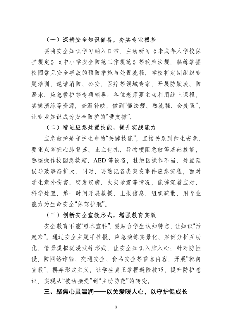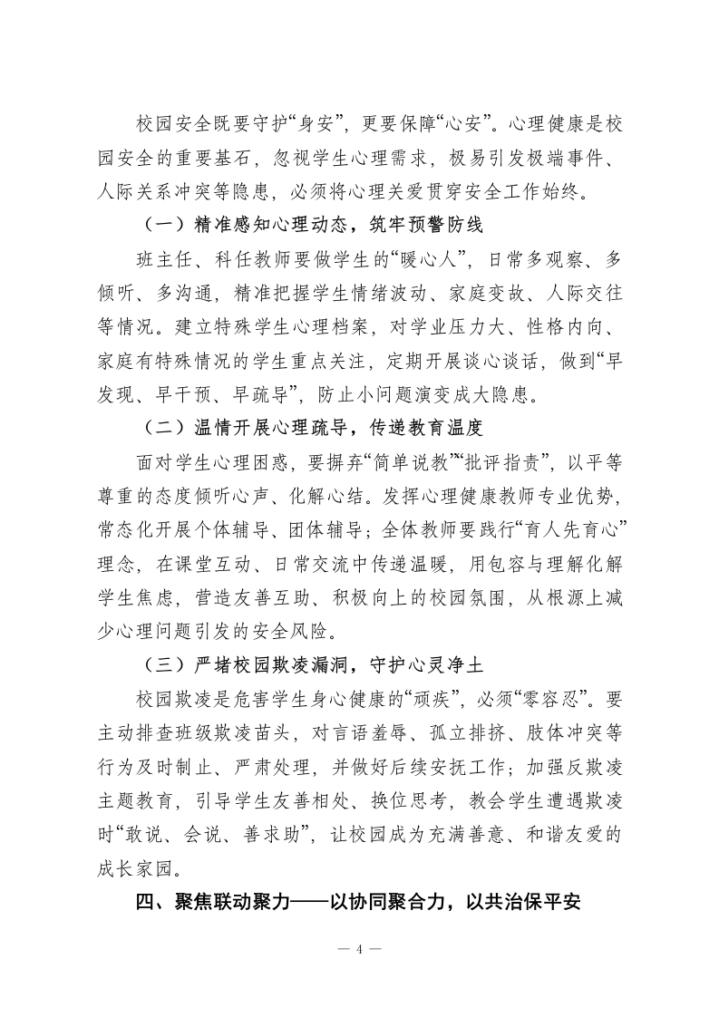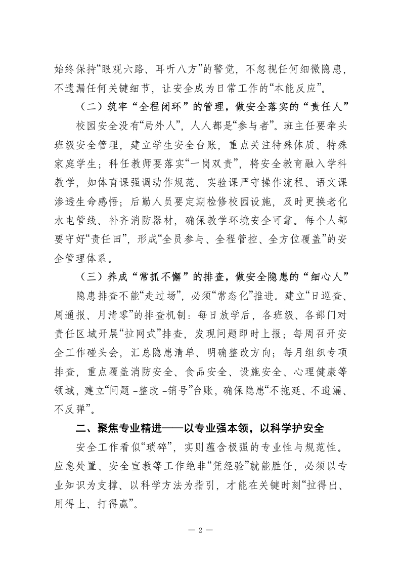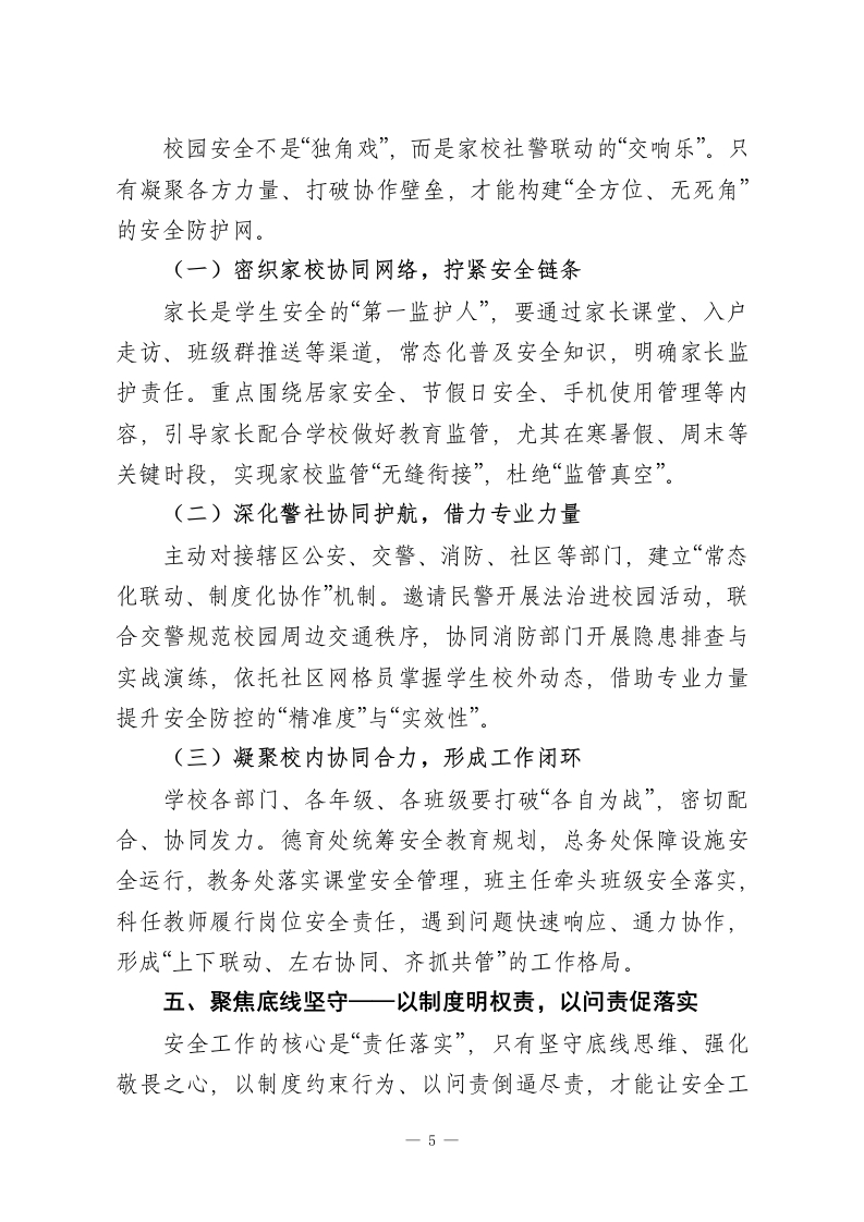校园安全工作总结交流,校长讲话:5个聚焦,筑牢安全屏障,守护成长之路各位老师:大家下午好!“安全是1,其余是0”,校园安全是教育事业发展的前提,是师生幸福生活的保障,任何时候都不能有丝毫麻痹、片刻松懈。近期复盘安全工作,既见证了大家的担当与奉献,也察觉到部分潜在隐患亟待化解。今天,我围绕“五个聚焦”与大家共话安全工作,既是对过往工作的复盘总结,更是对未来防护网的织密加固。愿我们以“时时放心不下”的责任感、“事事紧抓不放”的执行力,共同筑起校园安全的坚固长城,守护每一位师生的平安健康。一、聚焦日常深耕一于细微处筑防线,于常态中守平安安全无捷径可走,平安无侥幸可言。所有岁月静好的背后,都是日复一日的坚守与积累。“小洞不补,大洞吃苦”,日常工作中的每一次叮嘱、每一次巡查、每一次整改,都是守护安全的关键环节。(一)秉持“时时牵挂”的警觉,做安全守护的“有心人”作为教育工作者,我们既是知识的传播者,更是学生安全的“第一责任人”。要把“安全至上”的理念融入血脉、付诸行动:课前2分钟核实学生出勤,及时追踪缺勤学生去向;课间在责任区域定点值守,主动制止追逐嬉闹、攀爬护栏等危险行为;放学后强调路途安全,提醒学生遵守交通规则、结伴而行。要1