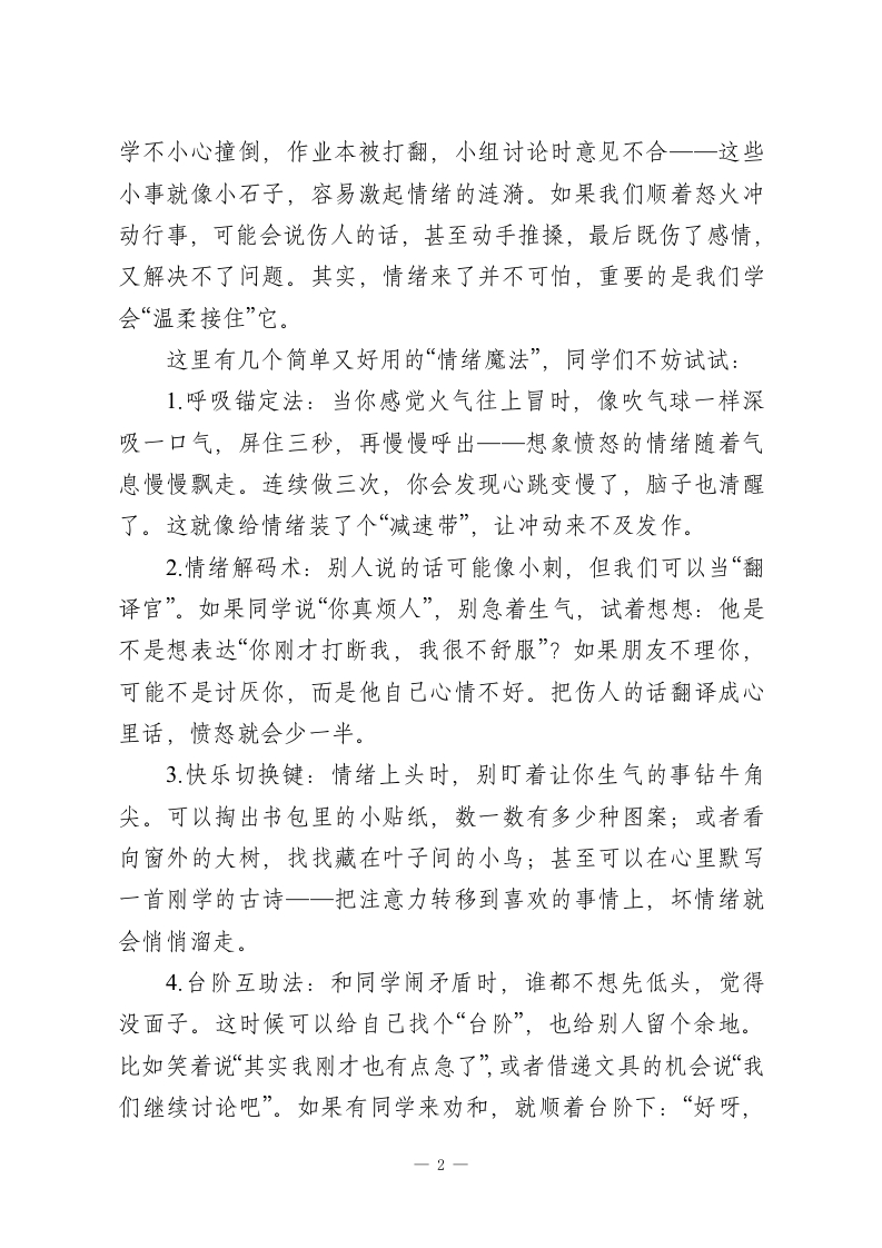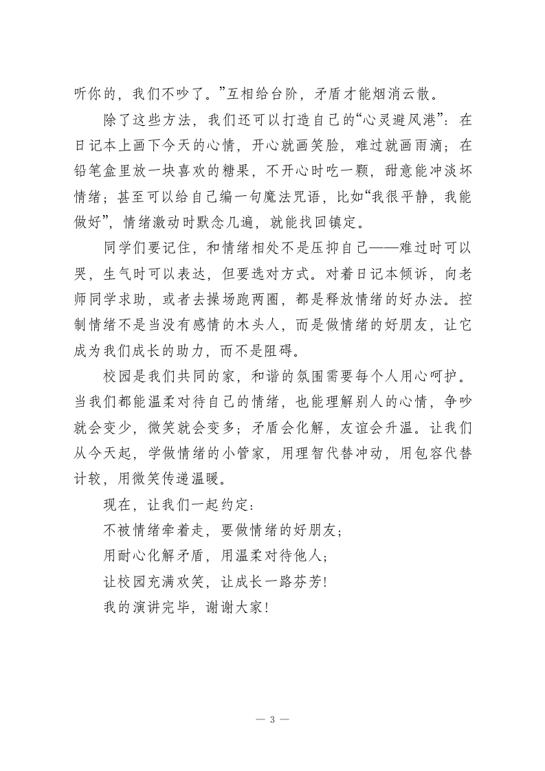 校长在国旗下讲话:与情绪握手,让校园更温柔尊敬的老师,亲爱的同学们:大家好!当晨读的铃声响起,当课间的喧闹传来,当考试的试卷分发到手一一我们的校园时光里,总有各种各样的情绪在悄悄流动:是解出难题的雀跃,是被误解的委屈,是和同学闹别扭的烦躁,也是期待周末的欢喜。这些藏在我们心里的小情绪,就像天气一样变幻无常,今天,我想和大家聊聊:如何与情绪做朋友,而不是被它牵着走。什么是情绪呢?它不是洪水猛兽,而是我们内心的“晴雨表当你熬夜复习却考砸了,鼻尖酸酸的想哭,这是“哀”;当同桌未经允许拿走你的笔记本,你忍不住皱眉生气,这是“怒”;当第一次站上讲台发言,手心冒汗心跳加速,这是“惧”;当收到朋友偷偷塞给你的小零食,嘴角不自觉上扬,这是“喜”。喜、怒、哀、惧四种基本情绪,构成了我们丰富的内心世界。为什么要好好对待情绪?因为情绪就像一面镜子,照见我们的内心,也影响着我们的校园生活。糟糕的情绪会让我们说话带刺,把小矛盾变成大冲突;会让我们上课走神,把简单的题目做错;会让我们疏远朋友,把温暖的关系变冰冷。而懂得和情绪相处的人,总能在沮丧时给自己打气,在愤怒时踩下刹车,在焦虑时找到平静,让校园生活少一点摩擦,多一份舒心。校园里的小摩擦,常常是情绪的“试金石”。体育课上被同1