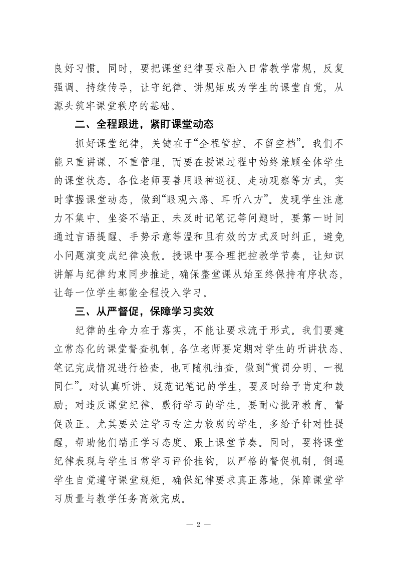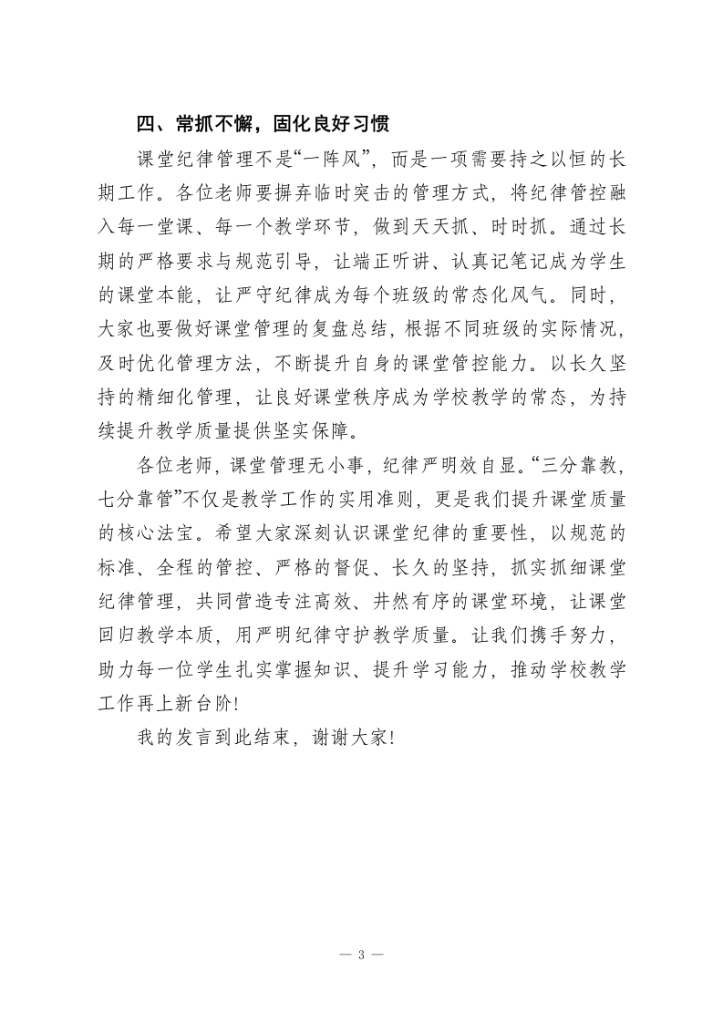 校长在教师会议上发言:课堂纪律管理,“三分靠教,七分靠管”各位老师:大家好!今天我们齐聚一堂,重点探讨一个关乎教学质量的核心话题一一课堂纪律管理。教育界流传的“三分靠教,七分靠管”,相信大家都耳熟能详,这句话深刻揭示了课堂管理与教学成效的紧密关联。课堂是我们教书育人的主阵地,纪律则是保障教学成效的生命线。没有严明的课堂纪律,再精妙的教学设计也难以落地,再高效的教学方法也无法发挥实效。只有牢牢守住课堂纪律底线,规范学生课堂行为,才能营造专注、有序的学习氛围,保障教学任务稳步推进,让每一堂课都实现“学有所获、教有所成”。下面,结合学校教学实际,我对课堂纪律管理提四点希望和要求:一、明确标准,筑牢纪律根基规范课堂行为,首要在于建立统一清晰的纪律标准,让学生知晓“课堂该怎么做、不该怎么做”。各位老师要在开学初或日常教学中,主动向学生明确课堂听讲、笔记记录、坐姿仪态等基础要求,做到标准统一、要求一致。比如,要求学生保持端正坐姿,专注面向讲台与黑板,杜绝趴桌、歪坐、交头接耳等散漫行为;要耐心指导学生掌握笔记规范,跟随教学节奏记录重点知识、核心考点与易错内容,帮助学生养成边听边记的1