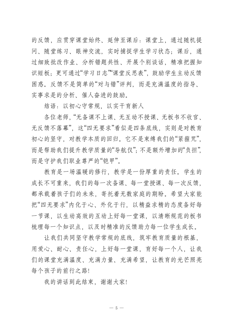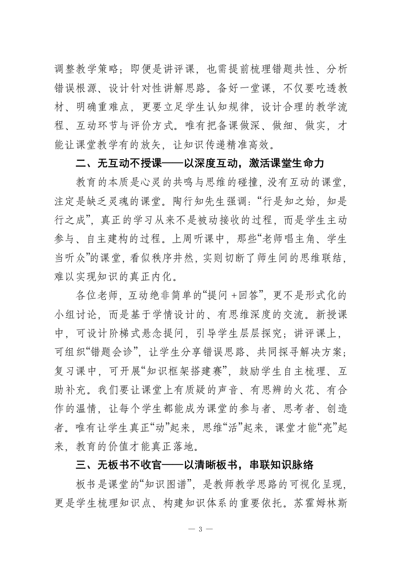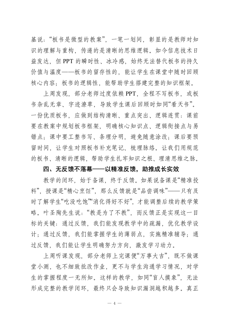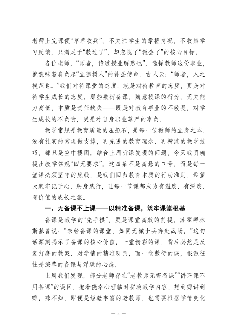 校长在全校教师会上发言:落实“四无要求”,抓实教学常规,育好每一位学生各位老师:大家下午好!每周的教师例会,我不愿过多堆砌事务性安排,只想与大家回归教育的本真一聊聊我们选择三尺讲台的初心,谈谈“教书育人”这四个字的分量。作为深耕一线的教育人,我们都深知:课堂是师生心灵对话的阵地,每一节课都承载着不可复制的成长时光;我们手中的粉笔,不仅书写知识,更托举着无数家庭的期盼与孩子们的未来。这份责任,容不得半点敷衍,更经不起丝毫懈怠。上周,我与教务处的同事们深入各年级、各学科课堂,累计听课近15节。令人欣慰的是,绝大多数老师始终秉持严谨治学的态度,精心备课、用心授课,课堂秩序井然、互动踊跃,孩子们专注的眼神、积极的回应,正是大家教育情怀的最好见证,我由衷为大家感到自豪。但与此同时,少数课堂暴露出的问题也令人揪心:有的老师备课流于形式,甚至未做任何准备便仓促登台,仅凭一本练习册、几张题单随意发挥,课堂缺乏设计逻辑,知识传递零散无序;有的课堂沦为“单向灌输”的独角戏,老师滔滔不绝,学生却被动沉默、眼神游离,看似完成了教学流程,实则未实现真正的知识内化;有的老师全程依赖PPT,从不书写板书,或板书杂乱无章,导致学生课后梳理知识点时无从下手;还有的1