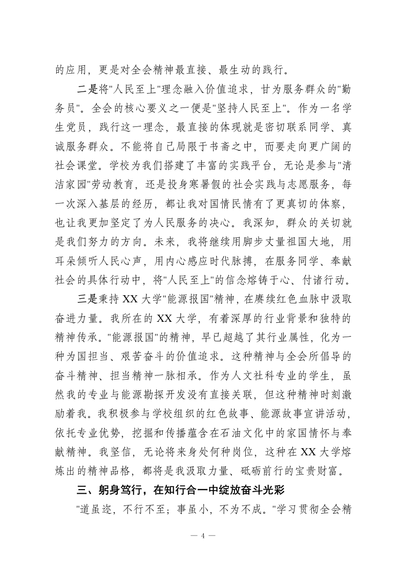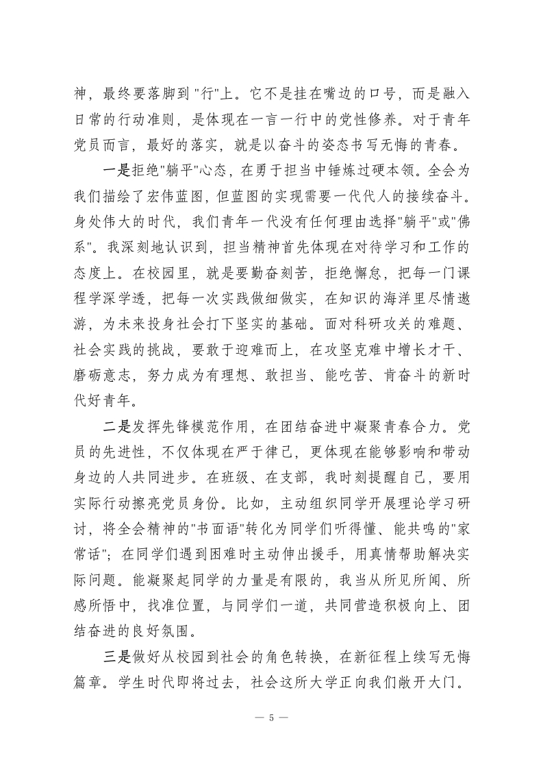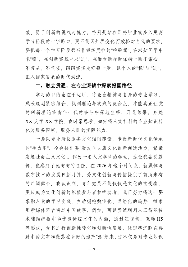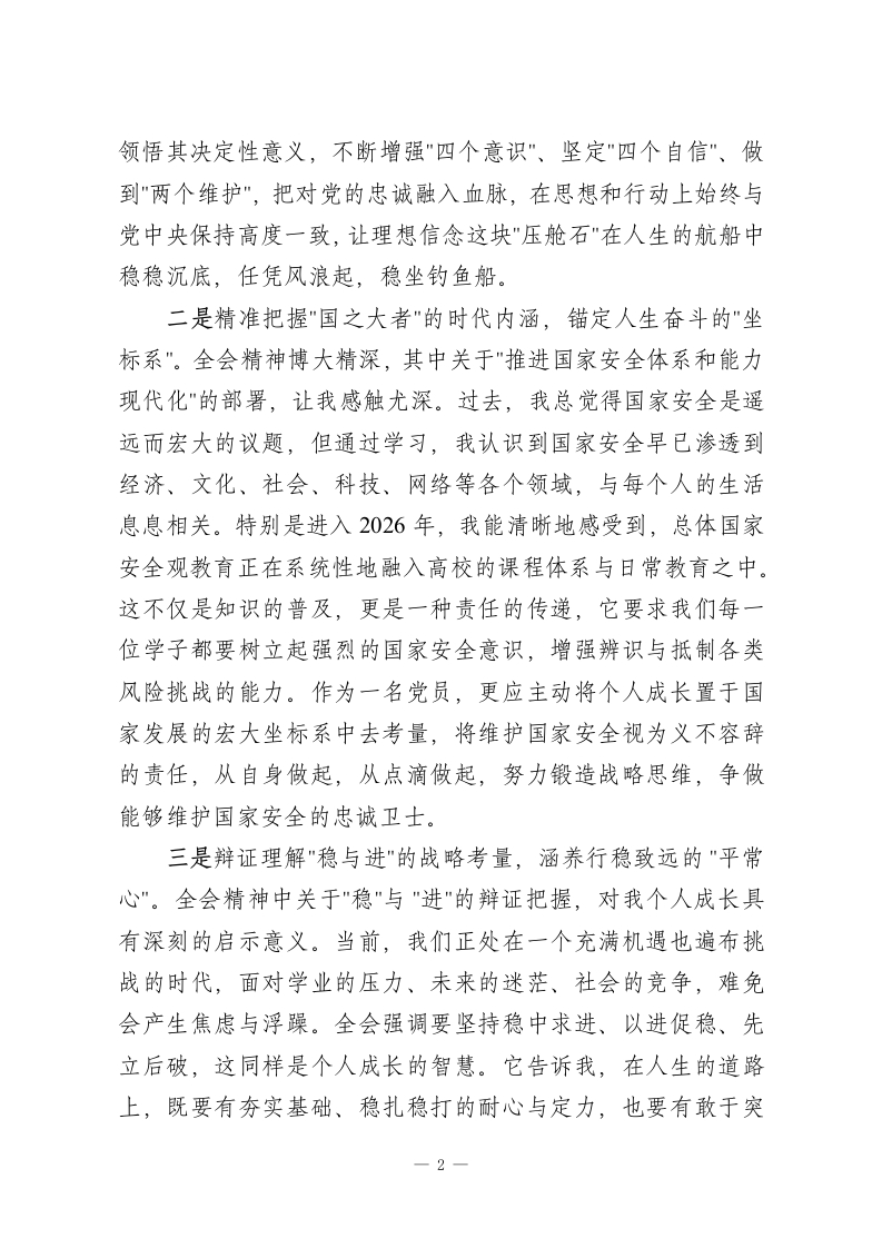 学生党员代表关于学习贯彻党的二十届四中全会精神研讨发言材料尊敬的各位领导、老师,亲爱的同学们:大家好。非常荣幸能有这次机会,站在这里与大家交流学习党的二十届四中全会精神的心得感悟。作为一名青年学生党员,这次系统性的学习,对我而言,既是一次深刻的思想洗礼,更是一次明晰未来方向的精神远航。下面,我结合自身的学习与思考,谈三点不成熟的体会。一、深学细悟,在思想淬炼中校准青春航向理论的深度决定着思想的高度,也标定着行动的精度。学习全会精神,首要在于入心入脑,通过深学细悟,将党的创新理论转化为观察世界、思考问题、规划人生的"望远镜"和"显微镜”,从而在纷繁复杂的时代潮流中,始终保持清醒的头脑与坚定的航向。一是深刻领悟"两个确立"的决定性意义,筑牢理想信念的"压舱石"。全会擘画的"十五五"时期发展蓝图,系统科学,催人奋进。从经济发展到科技创新,从民生保障到社会稳定,每一项部署都彰显了党中央高瞻远瞩的战略眼光和治国理政的卓越智慧。学习过程中,我愈发深刻地认识到,今日中国取得的一切成就,最根本的保证就在于坚持党的全面领导。全会强调,”两个确立"是新时代取得一切成就最根本的保证,这绝非一句空洞的口号,而是写在神州大地上的生动现实。作为一名青年党员,就是要将这种思想认同内化为矢志不渝的政治信仰,深刻—1