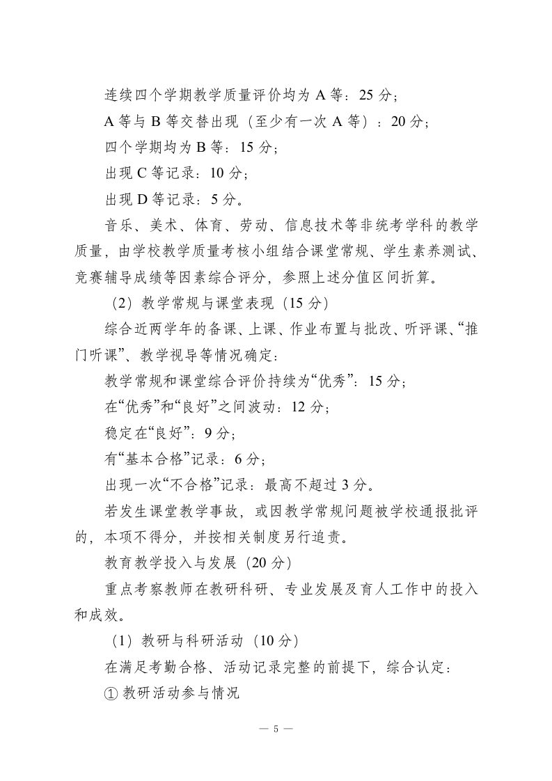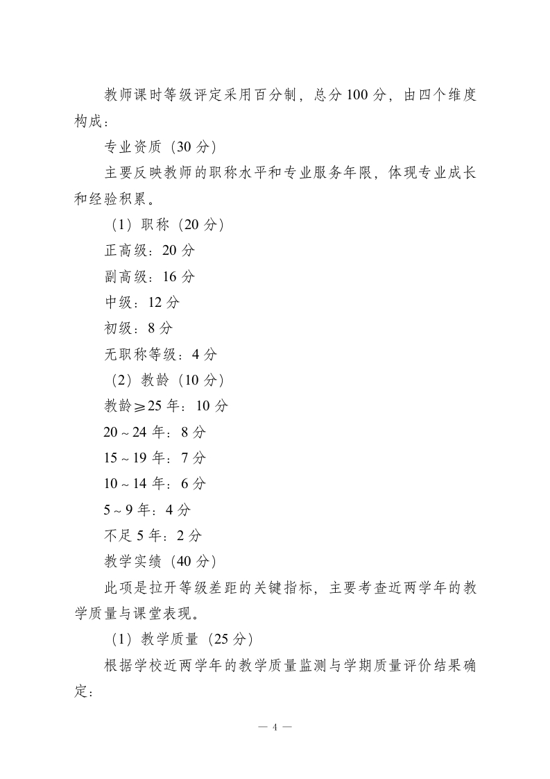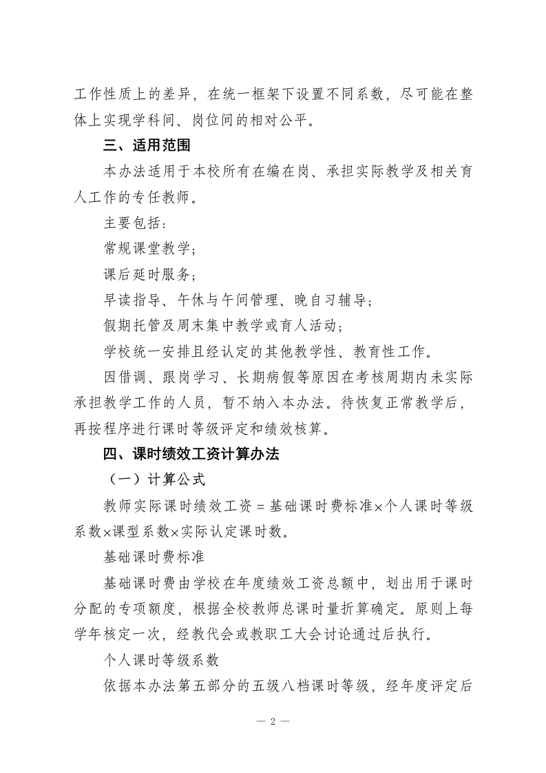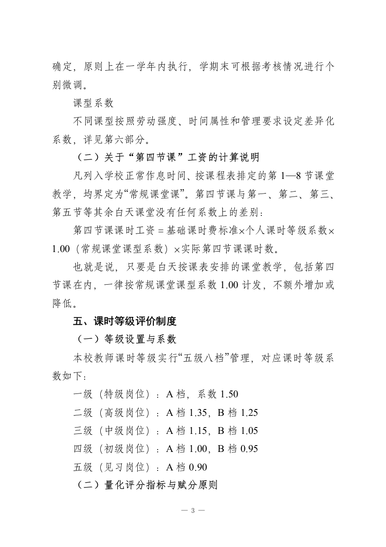学校教师课时工资评级方案(2026年修订版)一、指导思想为落实《深化新时代教育评价改革总体方案》和《关于进一步深化义务教育学校绩效工资制度改革的意见》精神,立足学校实际,构建以课时为核心、兼顾质量与贡献、体现“多劳多得、优绩优酬”的教师课时绩效分配机制,充分调动广大教师教书育人、立德树人的积极性和创造性,特制定本办法。二、基本原则(一)以劳计酬与以绩论酬相结合以教师实际承担的教学与育人工作量为基础,同时突出教学质量、教研科研和综合贡献的权重,适度拉开收入差距,保证“多干不吃亏、干好有奖励”。(二)公平公开与量化可查同步评价标准事先公示,程序民主规范,评分量化细化,结果可追溯、可核查,杜绝“人情分*“暗箱操作”,让教师对自己的课时等级“心里有数、结果看得懂、过程信得过。(三)相对稳定与动态调整并行课时等级在一个学年内总体保持稳定,同时设置学期末微调机制,对教学质量、师德师风或其他业绩出现明显变化的教师及时调整等级,防止“一评定终身”。(四)突出差异与统筹平衡兼顾充分考虑不同学段、学科和课型在劳动强度、时间付出和-1