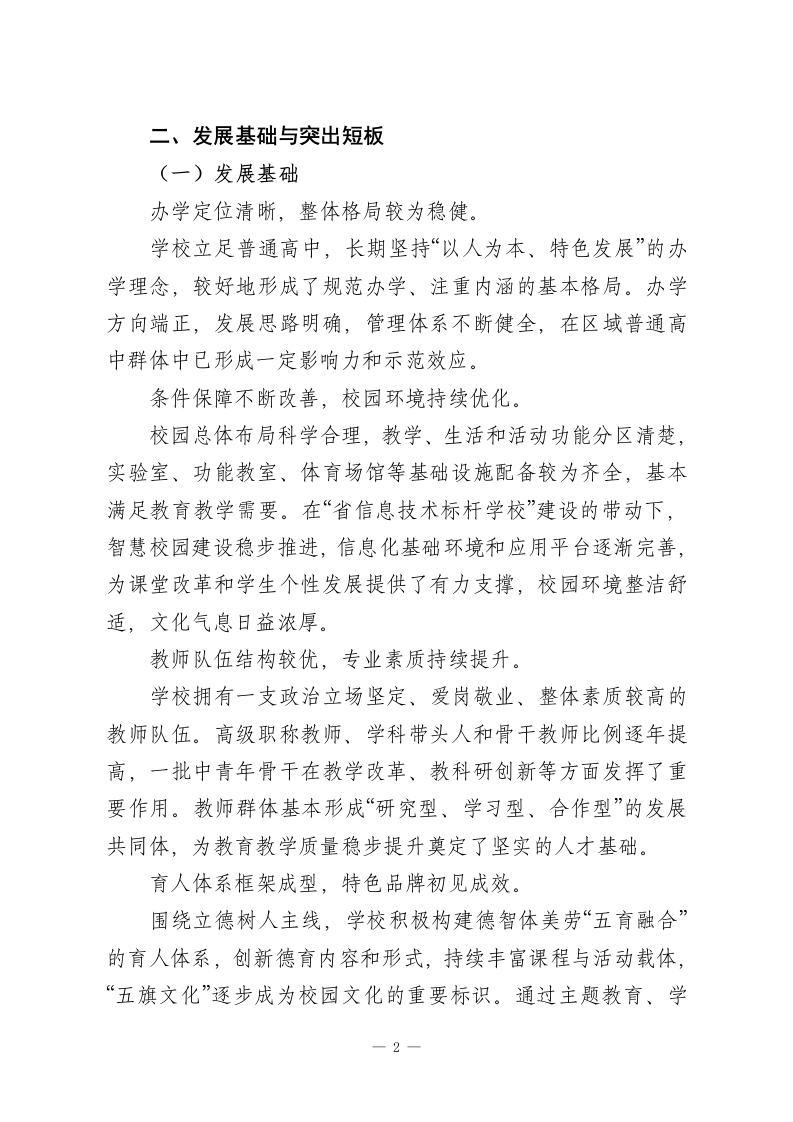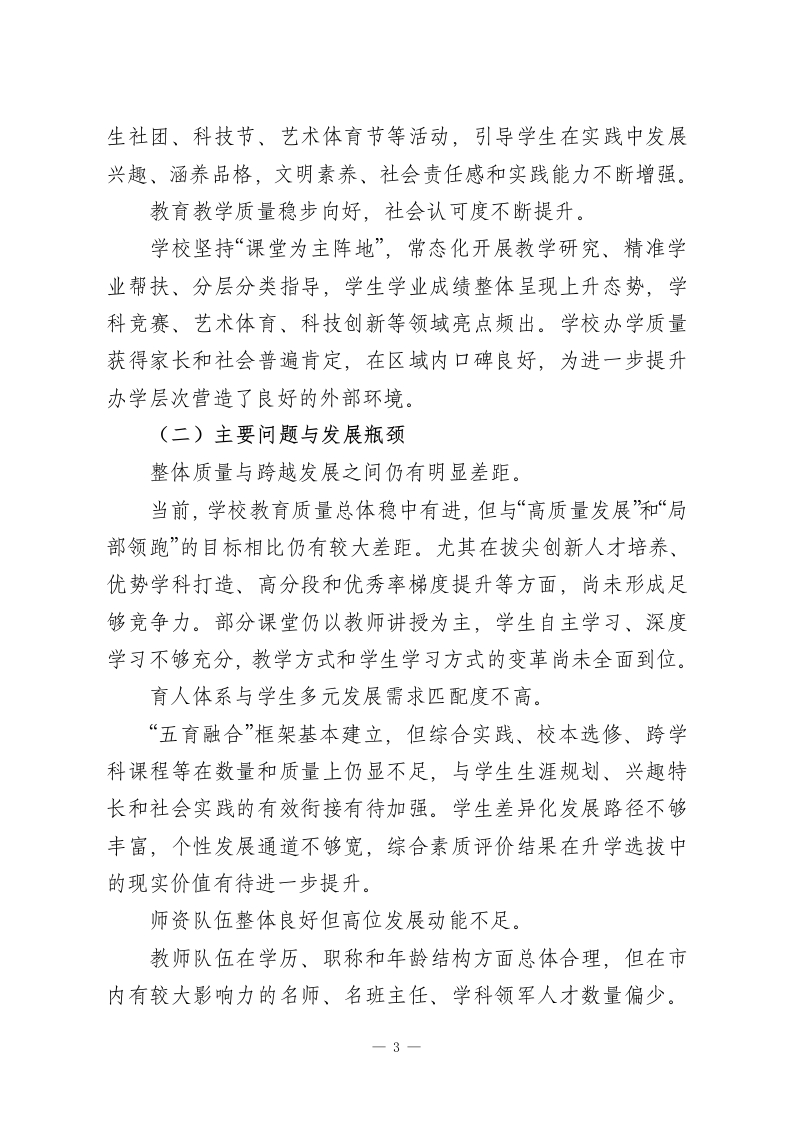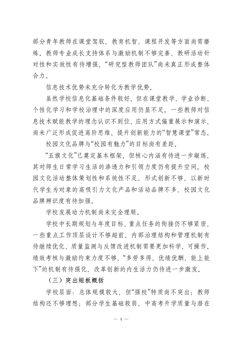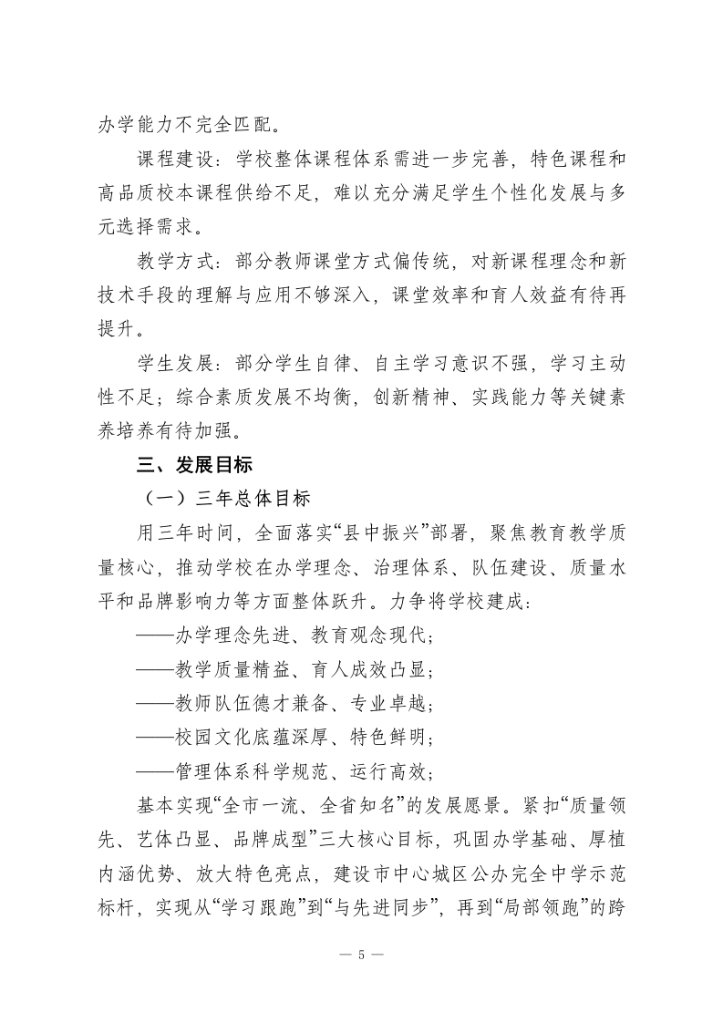 学校教学质量提升三年攻坚方案!10000字深度版!为贯彻落实教育部等六部委《县域普通高中振兴行动计划》精神,全面落实区委、区政府关于我校高质量发展的新要求,进一步发挥市示范高中、省信息技术标杆学校的辐射引领作用,学校决定用三年时间集中开展“教育教学质量提升攻坚行动”。本方案以“四力”提升(校园更有魅力、师生活力更足、办学实力更强、发展动力更旺)为主线,对未来三年的工作目标、任务举措和保障机制作出系统谋划。一、指导思想坚持…的全面领导,牢牢把握社会主义办学方向,全面贯彻党的教育方针,落实立德树人根本任务,服务“县中振兴”战略,努力培养一大批可堪大用、能担重任的社会主义建设者和接班人,确保党的事业后继有人、社会主义现代化强国建设人才充沛。紧紧围绕“教育教学质量提升”这一核心任务,突出内涵建设和特色发展,坚持“为学生终身发展奠基、为教师专业成长铺路”的办学宗旨,持续深化教育教学改革与实践探索,厚植“五旗文化”育人底蕴,健全“五育并举”的全面育人格局。积极构建学校、家庭、社会协同育人机制,推动三方同向发力、同频共振,以提升校园魅力、激发师生活力、增强办学实力、汇聚发展动力为着力点,为学校高质量发展注入持久内驱力,努力办好人民满意的教育。一1