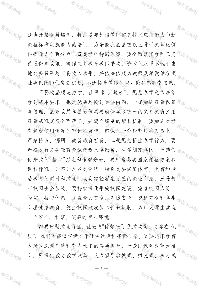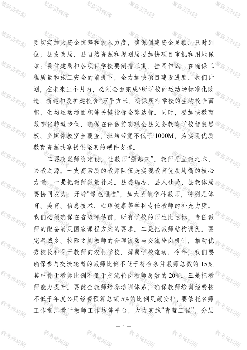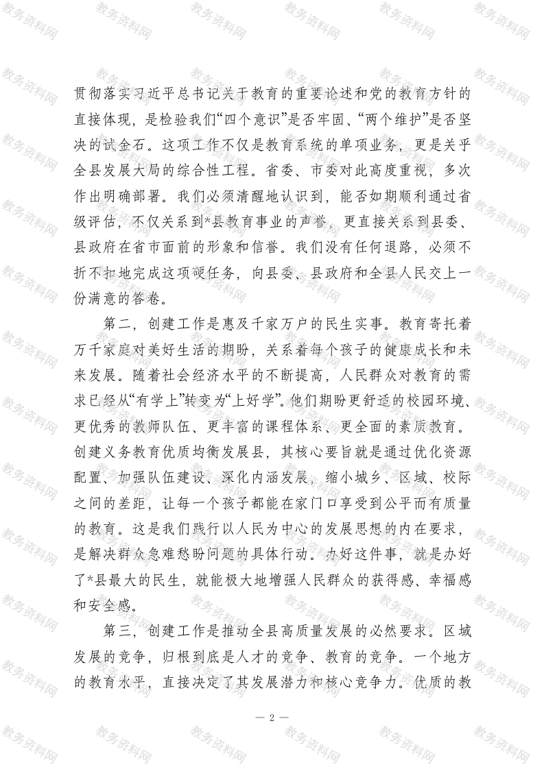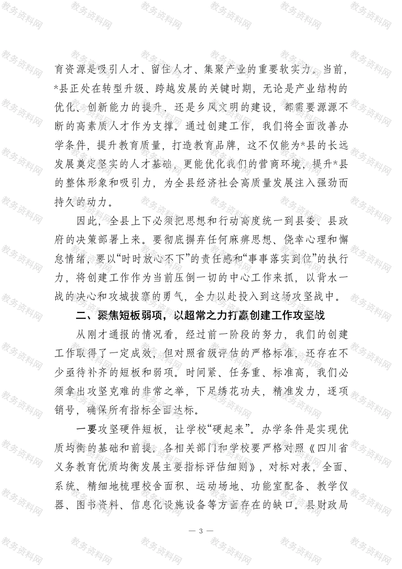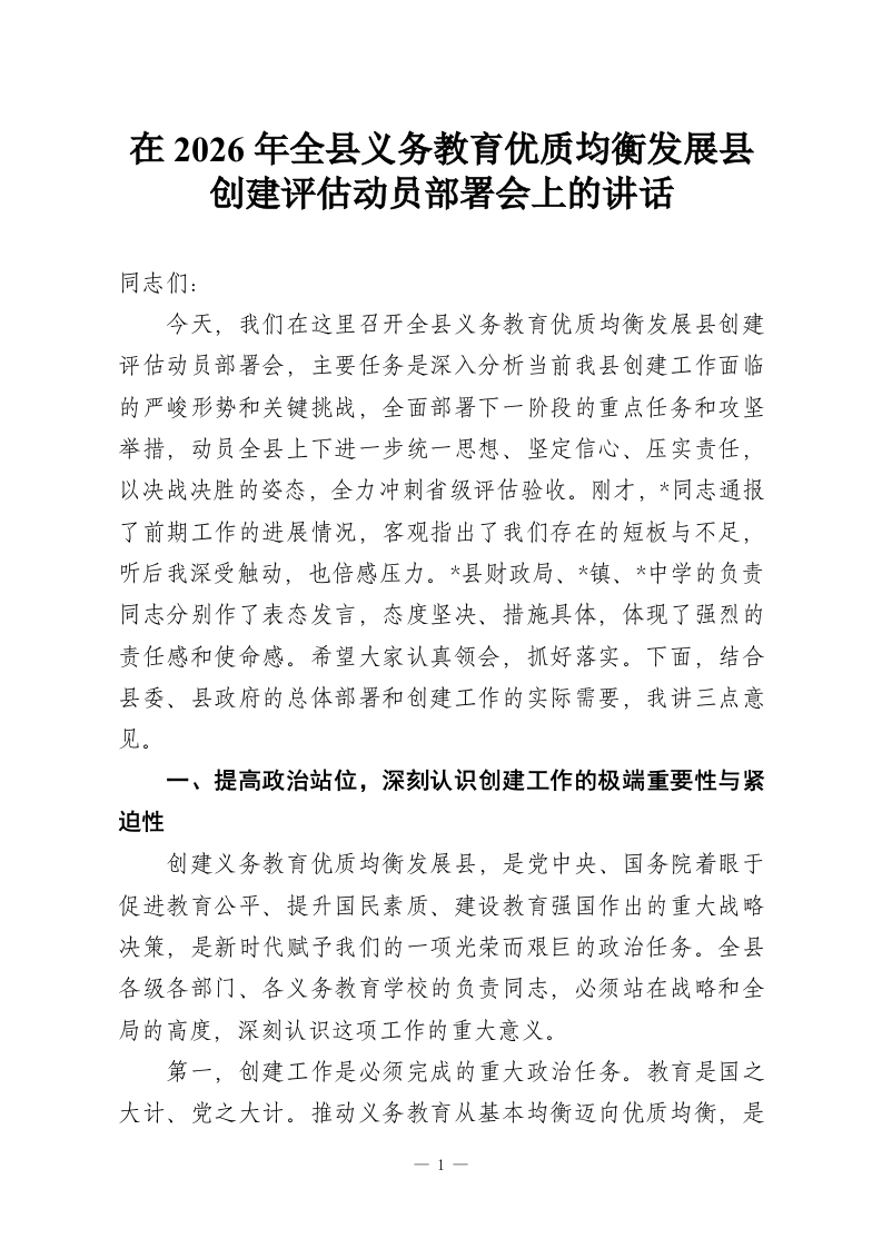 在2026年全县义务教育优质均衡发展县创建评估动员部署会上的讲话同志们:今天,我们在这里召开全县义务教育优质均衡发展县创建评估动员部署会,主要任务是深入分析当前我县创建工作面临的严峻形势和关键挑战,全面部署下一阶段的重点任务和攻坚举措,动员全县上下进一步统一思想、坚定信心、压实责任,以决战决胜的姿态,全力冲刺省级评估验收。刚才,*同志通报了前期工作的进展情况,客观指出了我们存在的短板与不足,听后我深受触动,也倍感压力。*县财政局、*镇、中学的负责同志分别作了表态发言,态度坚决、措施具体,体现了强烈的责任感和使命感。希望大家认真领会,抓好落实。下面,结合县委、县政府的总体部署和创建工作的实际需要,我讲三点意见。一、提高政治站位,深刻认识创建工作的极端重要性与紧迫性创建义务教育优质均衡发展县,是党中央、国务院着眼于促进教育公平、提升国民素质、建设教育强国作出的重大战略决策,是新时代赋予我们的一项光荣而艰巨的政治任务。全县各级各部门、各义务教育学校的负责同志,必须站在战略和全局的高度,深刻认识这项工作的重大意义。第一,创建工作是必须完成的重大政治任务。教育是国之大计、党之大计。推动义务教育从基本均衡迈向优质均衡,是1
