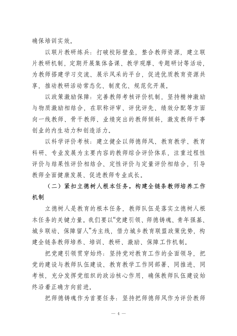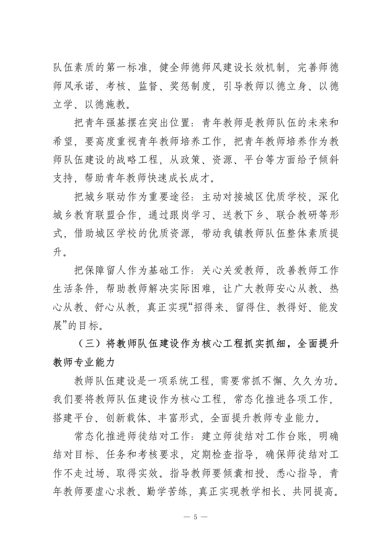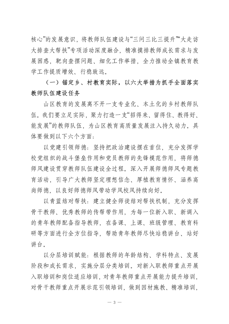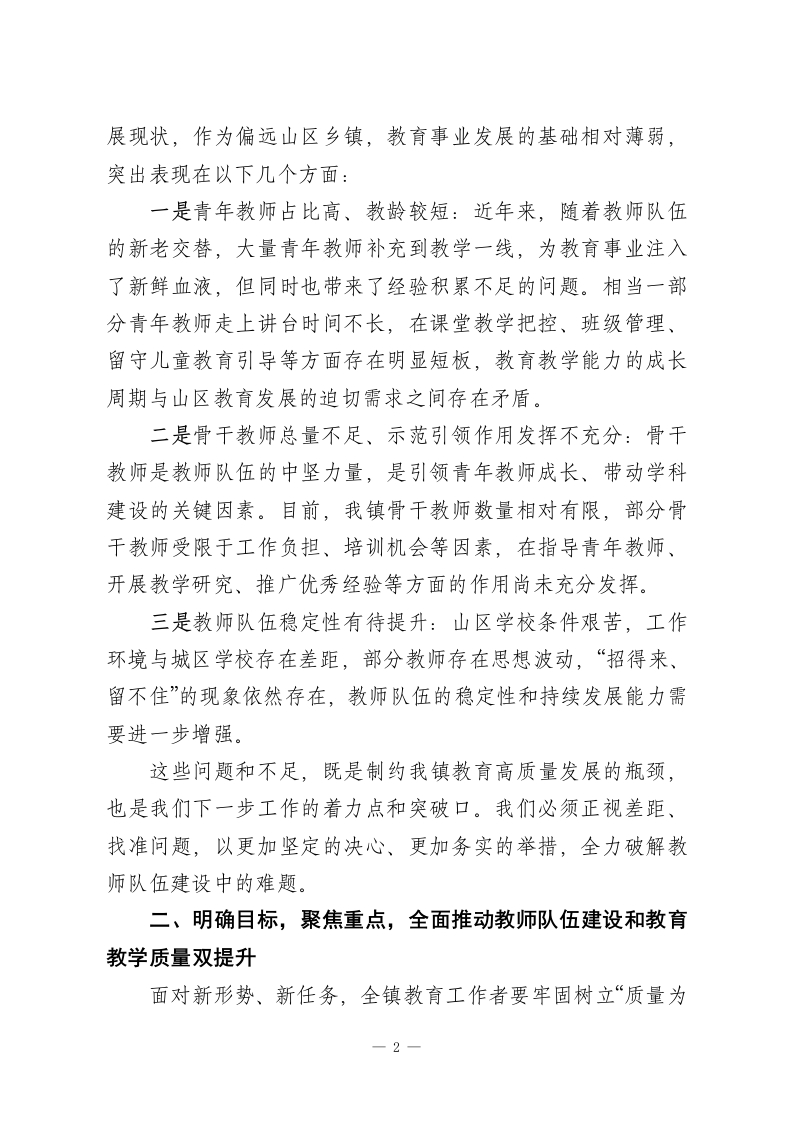 在XX镇教师队伍建设暨质量提升工作会上的讲话同志们,各位老师,各位校园长:今天,我们在此隆重召开全镇教师队伍建设暨质量提升工作会,与全镇各校、各幼儿园的校(园)长及教师代表齐聚一堂,共商教师队伍建设大计,共谋教育质量提升良策。本次会议的主要任务是深入学习贯彻上级关于教育工作的决策部署,集中学习《XX区XX镇教师队伍建设工作方案》,全面复盘分析上学期教学质量情况,客观剖析我镇教育发展现状,研究部署下一阶段教师队伍建设和教育教学质量提升的重点工作,进一步统一思想、凝聚共识、明确方向,奋力推动全镇教育事业高质量发展。一、回顾成绩,正视差距,切实增强推动教育高质量发展的责任感与紧迫感过去一个学期,全镇教育战线上的同志们辛勤耕耘、默默奉献,教育教学工作取得了阶段性成效。刚才,我们对教学质量优秀的教师进行了表彰,优秀教师代表立足学科实际,分享了教学经验、交流了育人心得,充分展现了我镇教师队伍爱岗敬业、追求卓越的精神风貌。在此,我代表镇教育组向受到表彰的优秀教师表示热烈祝贺,向长期以来扎根山区、默默奉献的全体教育工作者致以崇高敬意和衷心感谢。成绩值得肯定,但问题更需正视。我们必须清醒地认识到,我镇教育发展仍然面临诸多困难和挑战。客观剖析我镇教育发1
