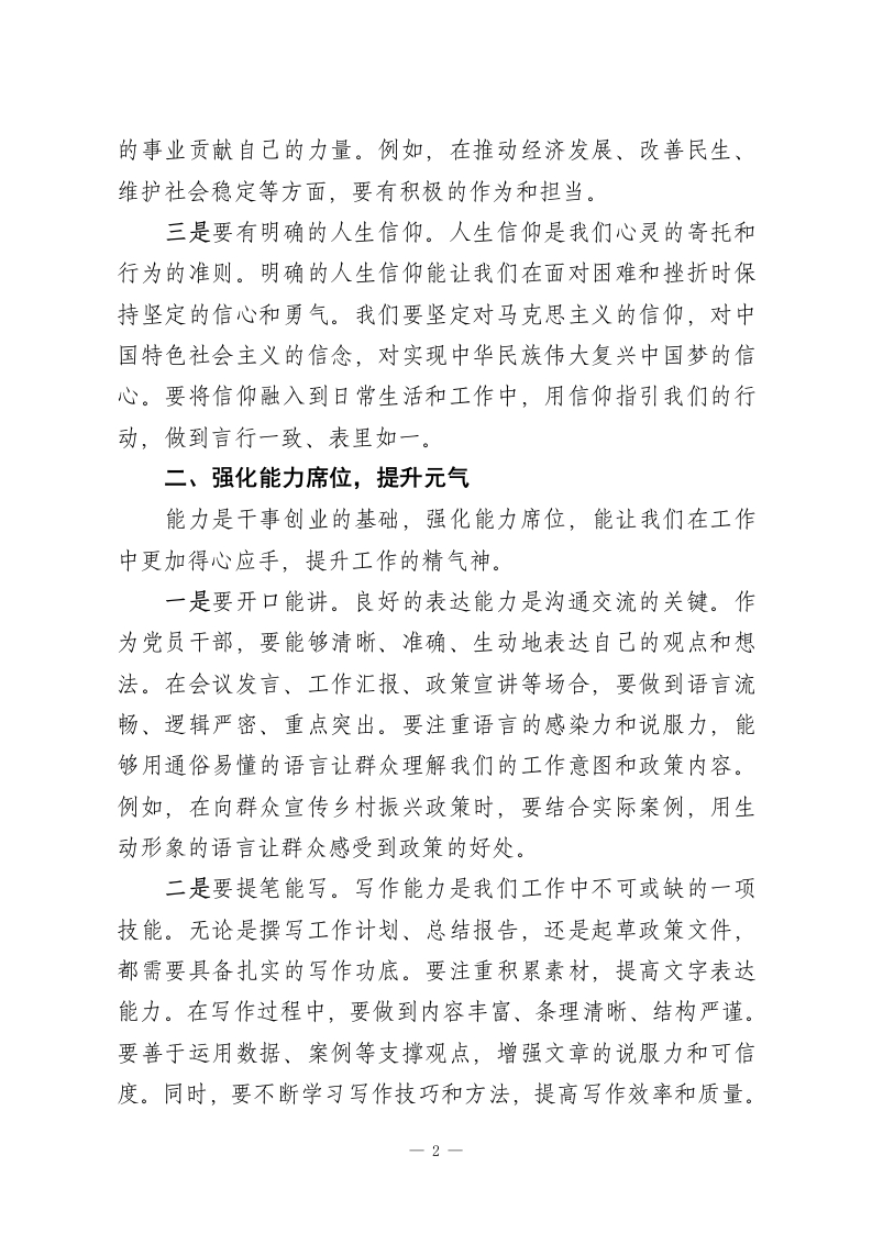 在党校培训动员会上的讲话提纲同志们:党校是党员干部锤炼党性、提升能力的重要平台。此次培训,是在复杂多变的时代背景下,为大家提供的一次宝贵学习契机。希望大家珍惜时光,学有所获。下面,我围绕党性修养能力提升等方面提几点要求。一、强化理想信念,昂扬志气理想信念是共产党人精神上的“钙”,没有理想信念,理想信念不坚定,精神上就会“缺钙”,就会得“软骨病”。在新时代,强化理想信念,能让我们在纷繁复杂的环境中保持清醒,昂扬奋斗志气。一是要有坚定的党性原则。党性原则是党员的立身之本。坚定的党性原则要求我们时刻保持政治上的清醒和坚定,始终与党中央保持高度一致。在大是大非面前,要旗帜鲜明地捍卫党的立场,不被错误思潮所左右。比如,面对网络上的不实言论和不良信息,要敢于发声、敢于斗争,维护党的形象和声誉。在日常工作中,要严格遵守党的纪律和规矩,自觉按照党的组织原则办事,不搞特殊化,不搞个人主义。二是要有远大的理想抱负。“志不立,天下无可成之事。”远大的理想抱负是我们前进的动力源泉。作为党员干部,要将个人的发展与国家的命运紧密结合起来,树立为实现中华民族伟大复兴的中国梦而奋斗的远大理想。要以国家富强、民族振兴、人民幸福为己任,在各自的岗位上努力拼搏,为党和人民1