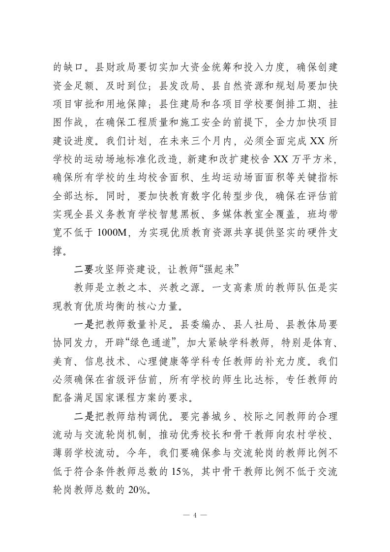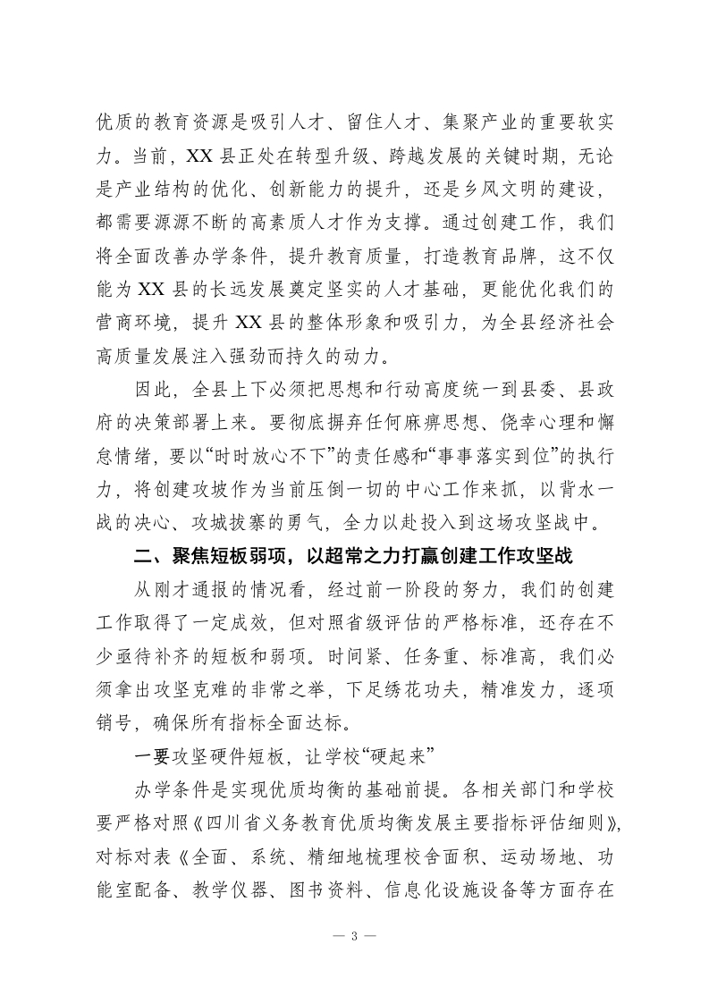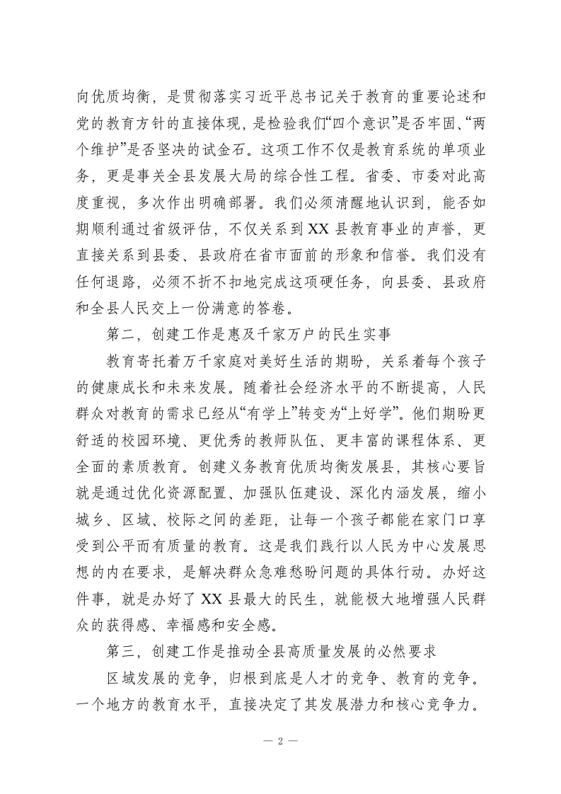 在全县义务教育优质均衡发展县创建评估动员部署会上的讲话同志们:今天,我们在这里召开全县义务教育优质均衡发展县创建评估动员部署会,主要任务是深入分析当前我县创建工作面临的严峻形势和关键挑战,全面部署下一阶段的重点任务和攻坚举措,动员全县上下进一步统一思想、坚定信心、压实责任,以决战决胜的姿态,全力冲刺省级评估验收。刚才,XX同志通报了前期工作的进展情况,客观指出了我们存在的短板与不足,听后我深受触动,也倍感压力。XX县财政局、X镇、XX中学的负责同志分别作了表态发言,态度坚决、措施具体,体现了强烈的责任感和使命感。希望大家认真领会,抓好落实」下面,结合县委、县政府的总体部署和创建工作的实际需要,我讲三点意见。一、提高政治站位,深刻认识创建工作的极端重要性与紧迫性创建义务教育优质均衡发展县,是党中央、国务院着眼于促进教育公平、提升国民素质、建设教育强国作出的重大战略决策,是新时代赋予我们的一项光荣而艰巨的政治任务。全县各级各部门、各义务教育学校的负责同志,必须站在战略和全局的高度,深刻认识这项工作的重大意义。第一,创建工作是必须完成的重大政治任务教育是国之大计、党之大计。推动义务教育从基本均衡迈一1-