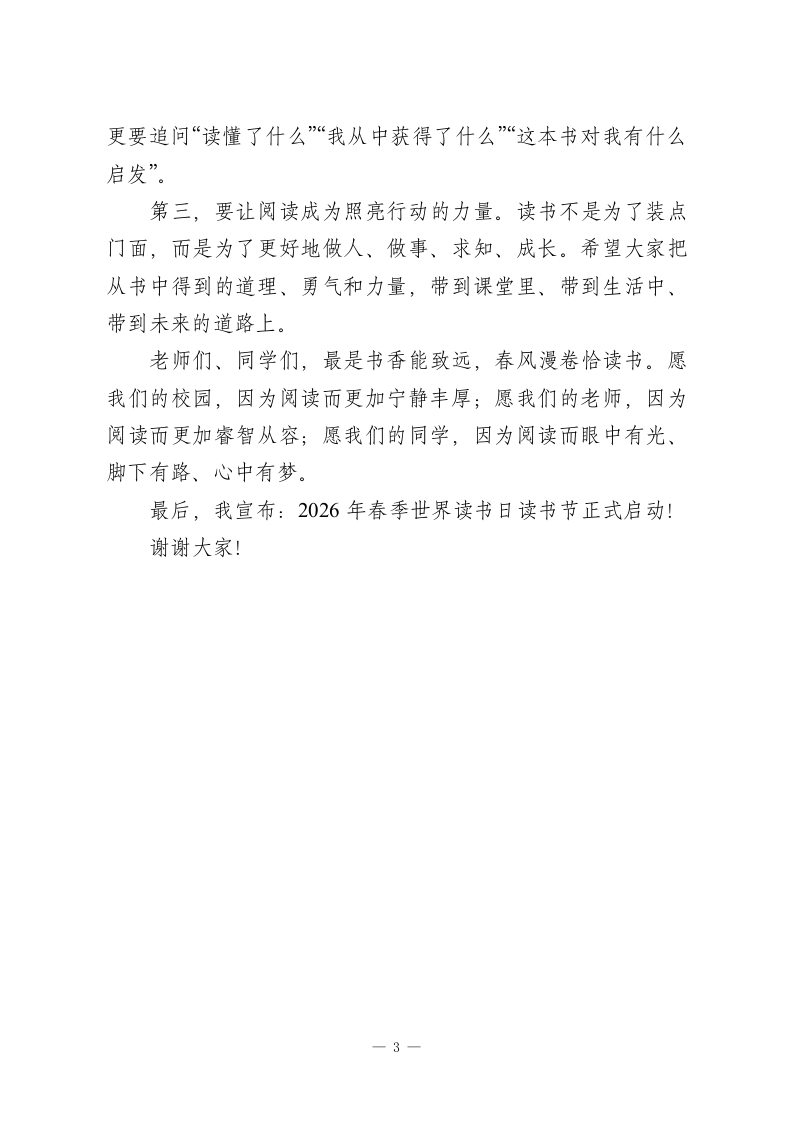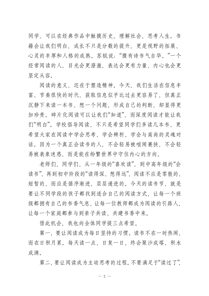 在书香中涵养气象一一2026年春季读书节启动仪式校长致辞尊敬的老师们、亲爱的同学们:大家上午好!四月的校园,春意正浓;四月的书页,也正等待我们轻轻翻开。在第31个世界读书日到来之际,我们相聚在这里,举行学校2026年春季读书节启动仪式。首先,我代表学校,向积极筹备本次活动的老师们表示衷心感谢,向热爱阅读、坚持阅读的同学们致以美好祝愿。书籍,是文明薪火相传的重要载体。一个人精神世界的丰盈,往往始于阅读;一所学校文化气质的形成,也离不开阅读。“立身以立学为先,立学以读书为本。”这句话告诉我们,读书从来不是一件可有可无的小事,而是一个人成长成才的重要根基。对于一所学校而言,阅读不仅关系到学生知识的积累,更关系到思想的启迪、品格的养成和精神的拔节。今天我们启动读书节,不是为了让阅读只停留在某一个节日、某一场活动中,而是希望借助这样的仪式,向全校师生传递一个清晰的信号:阅读,应当成为一种生活方式;书香,应当成为校园最鲜明的气质。真正有生命力的学校,不仅有整洁优美的环境,有奋发向上的风貌,更应当有安静阅读的身影,有润泽心灵的文字,有在书页间不断生长的思想。对于同学们来说,阅读的意义,首先在于开阔眼界。一本书,就是一个世界。低年级的同学,可以在童话与故事中认识真善美,在绘本与诗歌中感受语言的趣味;高年级和初中部的1