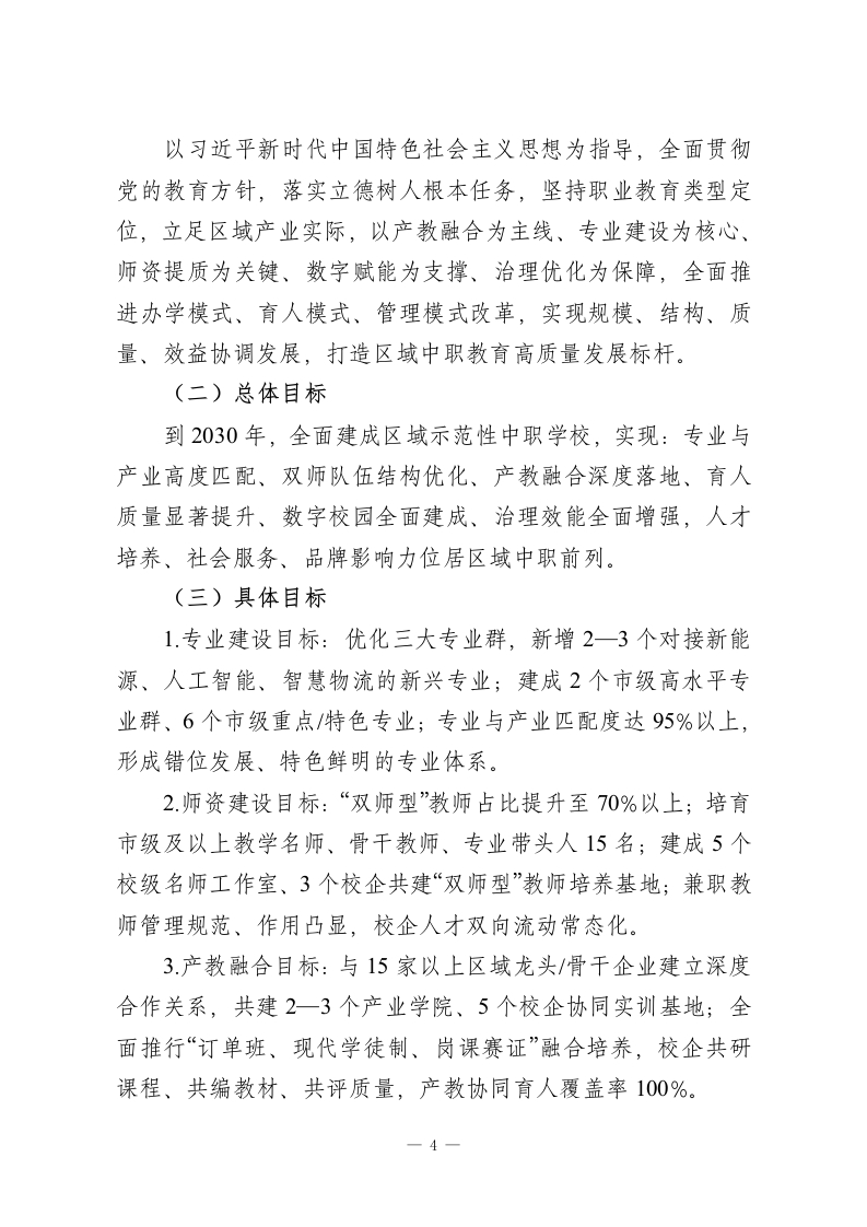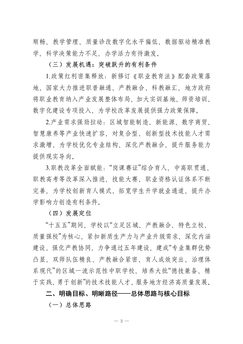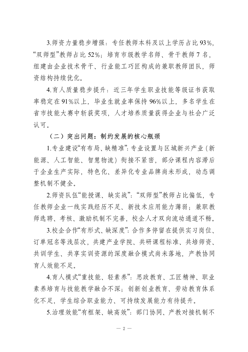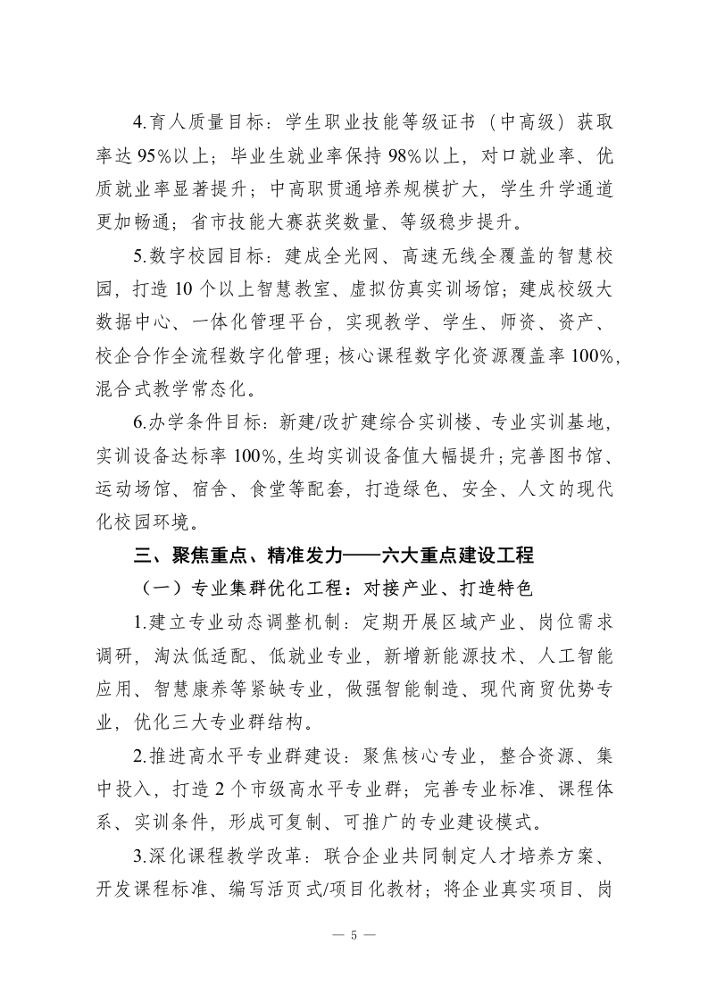 中等职业学校“十五五”高质量发展规划(2026一2030年)为全面落实国家职业教育类型定位与深化改革部署,精准对接区域新质生产力发展、产业迭代升级需求,破解办学堵点、补齐发展短板,全面提升办学品质与核心竞争力,培养更多适配产业、德技并修的高素质技术技能人才,结合本校办学实际,特制定本规划。一、认清现状、把握大势一发展基础、问题与机遇过去五年,学校坚持职教改革方向,稳步推进规范办学、内涵提升,完成从“规模增长”到“质量筑基”的转型,办学条件、专业布局、师资建设、育人成效均取得阶段性成果。但对照职业教育“职普融通、产教融合、科教融汇”新要求、产业升级对复合型技能人才的新标准、学生多元成长新期待,仍存在明显短板,必须抢抓机遇、攻坚克难,为“十五五”高质量发展筑牢根基。(一)发展基础:提质增效的坚实支撑1.办学条件持续优化:建成智能制造、现代商贸、康养护理三大专业群实训中心,实训设备达标率86%;建成智慧教学管理平台,多媒体教室、智慧实训室覆盖率100%,基本满足理实一体化教学需求。2.专业体系逐步完善:紧扣区域主导产业与新兴赛道,构建“先进制造、数字服务、民生康养”三大专业集群,5个专业获评市级特色/重点专业,专业与产业匹配度稳步提升。-1