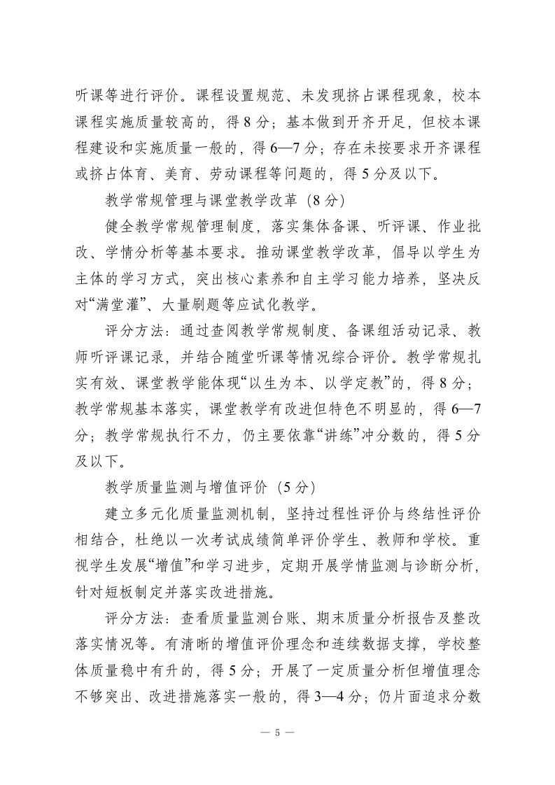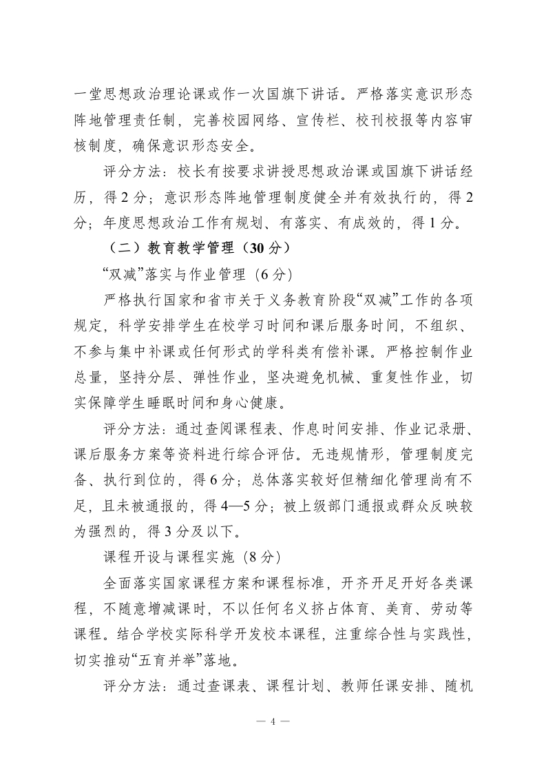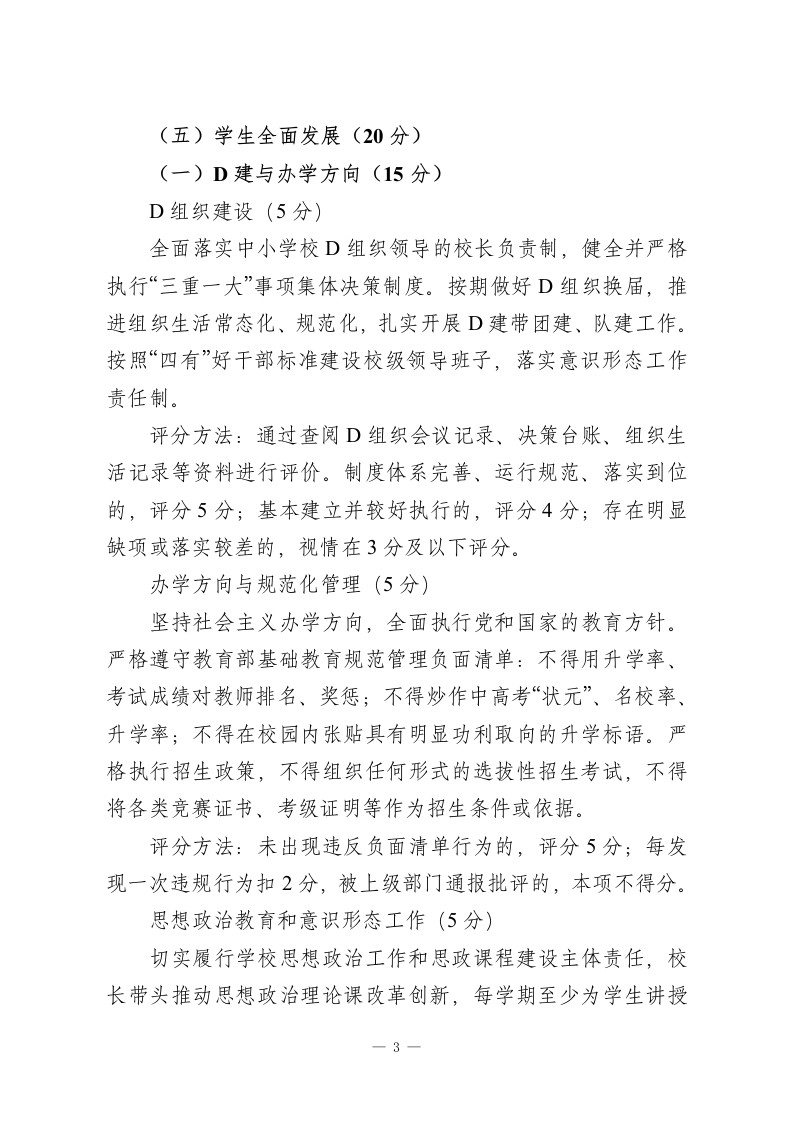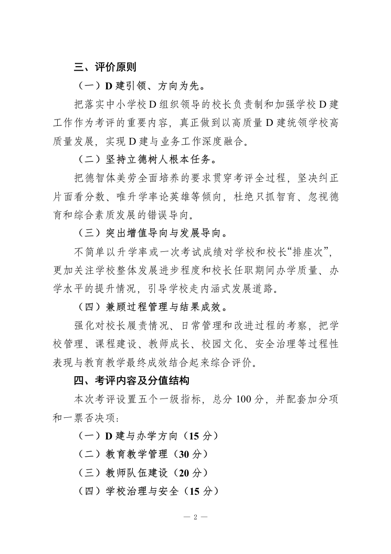 中小学校长工作目标管理考评实施方案(2026年修订版)为了深入贯彻《教育强国建设规划纲要(2024一2035年)》和教育部《义务教育质量评价指南》,全面落实《深化新时代教育评价改革总体方案》,呼应“基础教育规范化管理巩固年”的总体部署,进一步健全中小学校长目标管理与考评机制,推动全区基础教育高质量发展,特在既有制度基础上,对本方案作如下修订和完善。一、指导思想以习近平新时代中国特色社会主义思想为指导,全面贯彻党的教育方针和国家、省市有关文件精神,坚持为党育人、为国育才,牢固树立正确的政绩观和科学的教育质量观。通过改进校长考评,引导校长自觉抵制“唯分数、唯升学”的办学取向,把主要精力放在促进学生德智体美劳全面发展、规范办学行为、确保校园安全稳定、加强教师队伍建设和提升学校治理水平上,努力办好人民满意的教育。二、考评对象本方案适用于全区各类中小学校的校长(D组织书记),包括:一普通中学、中心小学、九年一贯制学校一区直学校;一实验小学、实验幼儿园、特殊教育学校等。各学校可参照本方案框架,结合实际情况,制定副校级领导干部及基层小学校长的考核细则,做到标准衔接、分类实施。-1