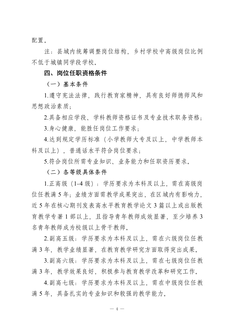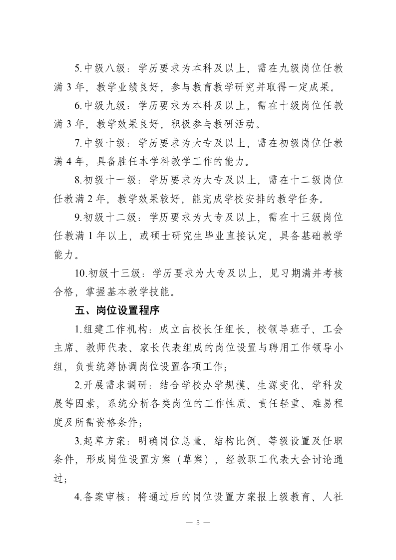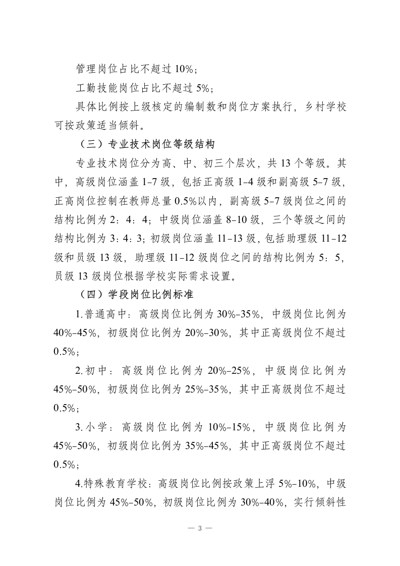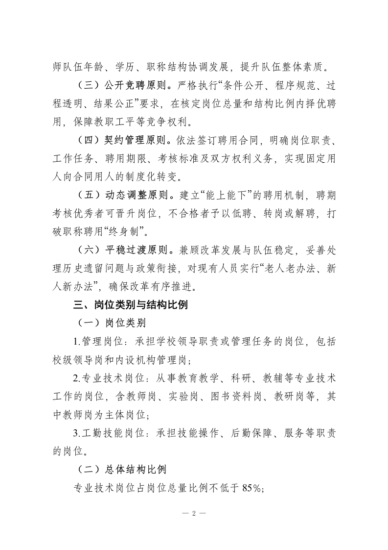 中小学专业技术岗位设置与聘用管理实施细则(2027年修订版)为深化新时代教育人事制度改革,构建科学化岗位管理体系,推动专业技术人员从身份管理向岗位管理转型,完善“科学设岗、公开竞聘、按岗聘用、契约管理”的用人机制,激发教职工教书育人活力,依据《事业单位人事管理条例》《教育强国建设规划纲要(2024一2035年)》《中共中央国务院关于弘扬教育家精神加强新时代高素质专业化教师队伍建设的意见》及省、市、县事业单位岗位设置管理相关规定,结合本校办学实际,制定本细则。一、指导思想以习近平新时代中国特色社会主义思想为指导,全面贯彻党的教育方针,落实立德树人根本任务,通过健全岗位设置与聘用管理制度,优化教师资源配置,构建人岗相适、动态调整、富有活力的用人机制,为学校教育教学高质量发展提供坚实的人才支撑和制度保障。二、基本原则(一)科学配置原则。坚持因事设岗、按需配置,结合学校编制总量、办学规模、学科布局和教育教学实际需求,合理确定岗位数量与层级,严禁因人设岗、超编设岗,确保岗位设置与教育教学任务相匹配。(二)结构优化原则。突出专业技术岗位主体地位,合理调控管理岗、专业技术岗、工勤技能岗三类岗位比例,促进教一1