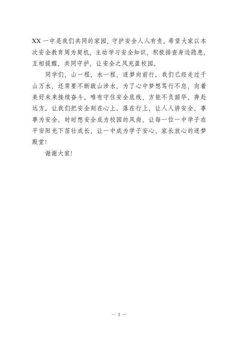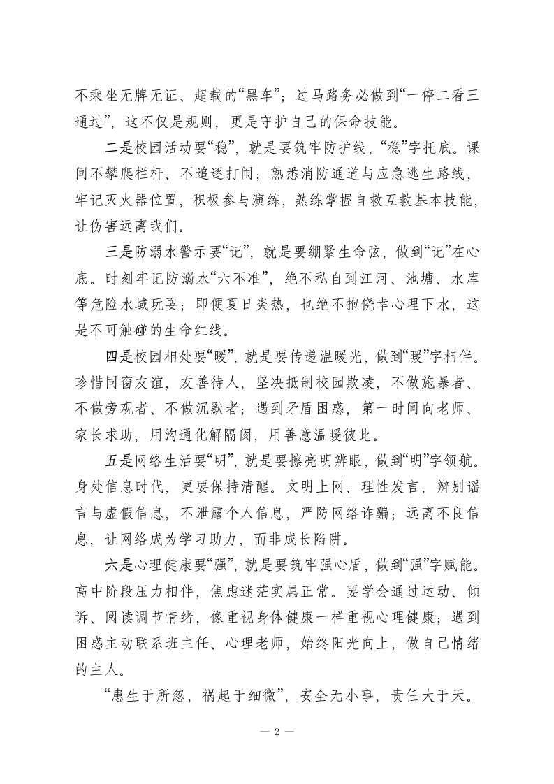中学党委副书记、校长在安全教育主题升旗仪式上的讲话:珍爱生命守底线,安全护航向未来尊敬的各位老师、亲爱的同学们:大家上午好!春风浩荡育桃李,安全护航筑梦行。今天,我们齐聚运动场,隆重举行安全教育主题升旗仪式活动,目的就是强化安全意识,加强安全教育。同学们,校园是求知问道的殿堂,是青春成长的沃土,而安全,正是这片沃土最坚实的根基,是我们逐梦前行的底气。生命至上,安全为天。“鲜衣怒马少年时,不负韶华行且知”你们怀揣梦想、意气风发,但必须清醒:没有安全作保障,再远大的理想都是空中楼阁。安全连着生命,系着家庭,容不得半点麻痹、一丝侥幸、一刻松懈。一直以来,我们始终把校园安全摆在首位,全力打造平安和谐校园。安全工作没有终点,只有连续不断的新起点。本次安全教育周,就是要推动安全从“被动提醒”走向“主动践行”,让每位同学都成为自身安全的第一责任人。在此,我向同学们提几点要求,希望大家入脑入心、落到实处:一是交通安全要“严”,就是要守好出门关,做到“严”字当头。上下学途中严格遵守交通规则,不闯红灯、不横穿马路,坚决