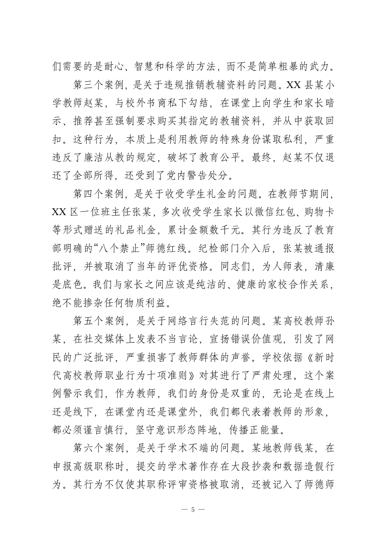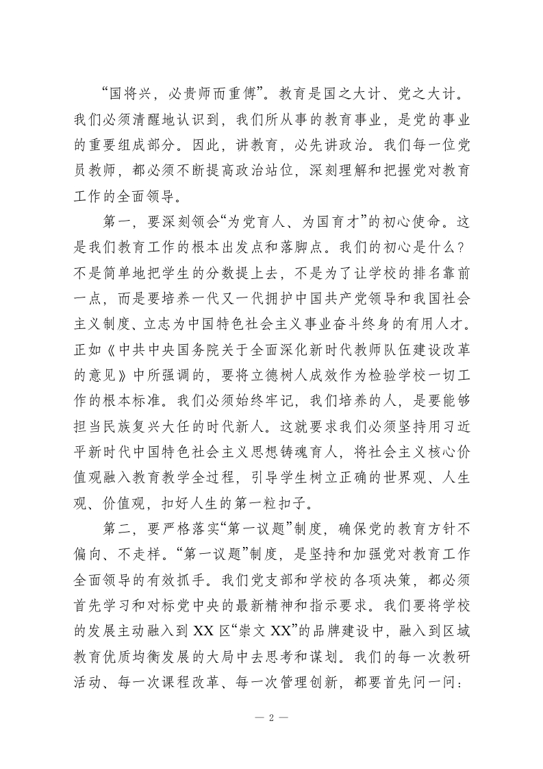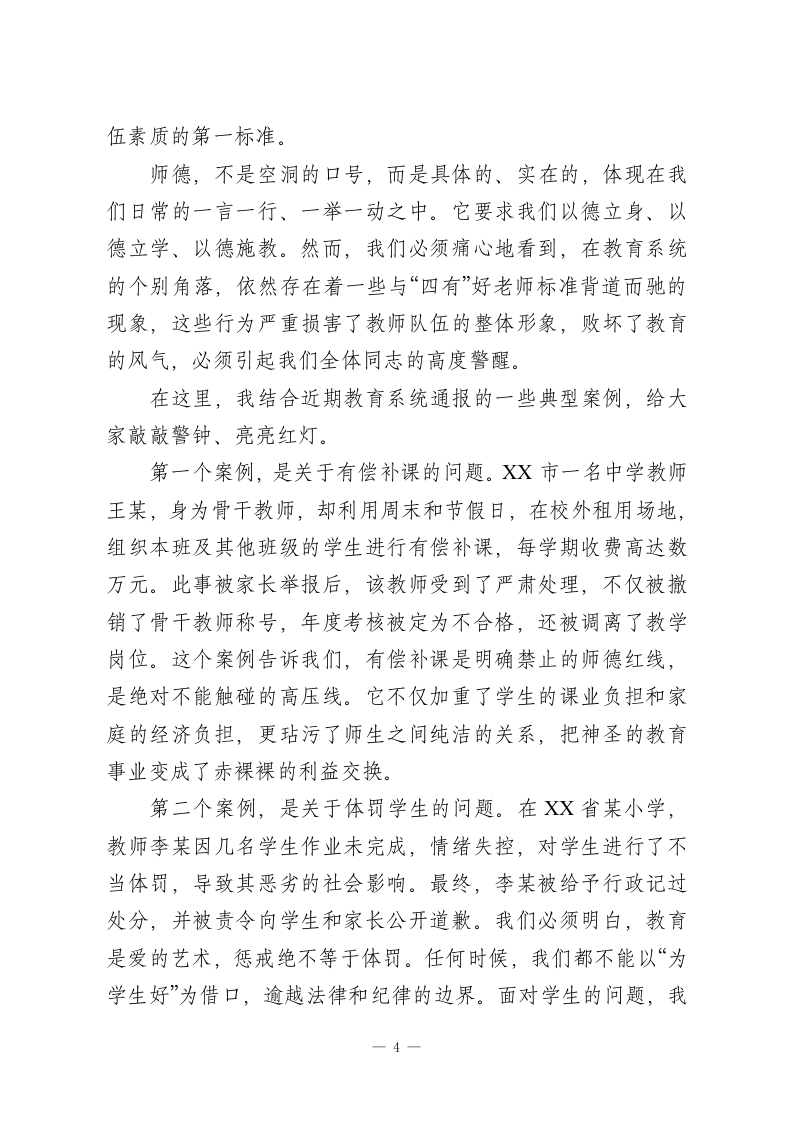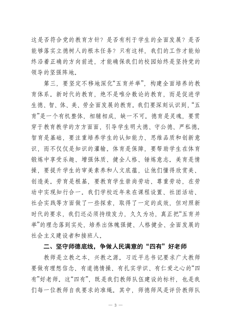 专题党课:守教育初心正师德师风担育人使命同志们:今天,我们支部全体党员教师汇聚一堂,举行四月份的主题党日活动。按照活动安排,由我为大家讲一堂专题党课。我想和同志们共同探讨的,是每一位教育工作者,尤其是我们党员教师,必须时刻自省、终身践行的根本性问题一一守教育初心,正师德师风,担育人使命。这既是我们一生事业的起点,也是我们走好未来每一步的新标尺。当前,我们正处在一个深刻变革的时代,科技日新月异,社会加速转型,对教育提出了前所未有的新挑战和新要求。我们学校的发展,也正处在爬坡过坎、提质增效的关键时期。在这样的背景下,重温初心、砥砺师德、明确使命,显得尤为重要和紧迫。作为党员教师,我们不仅是知识的传授者,更是学生思想的引领者、品格的塑造者。我们的一言一行,直接关系到学生的健康成长,关系到千家万户的期盼,更关系到国家和民族的未来。因此,今天的党课,我将紧密结合我们的教育工作实际,围绕四个方面,与同志们进行深入的交流和探讨:一是提高政治站位,把准立德树人的根本方向;二是坚守师德底线,争做人民满意的“四有”好老师;三是严守纪律规矩,筑牢清正廉洁的坚固防线;四是立足岗位实干,推动学校事业的高质量发展。一、提高政治站位,把准立德树人的根本方向1