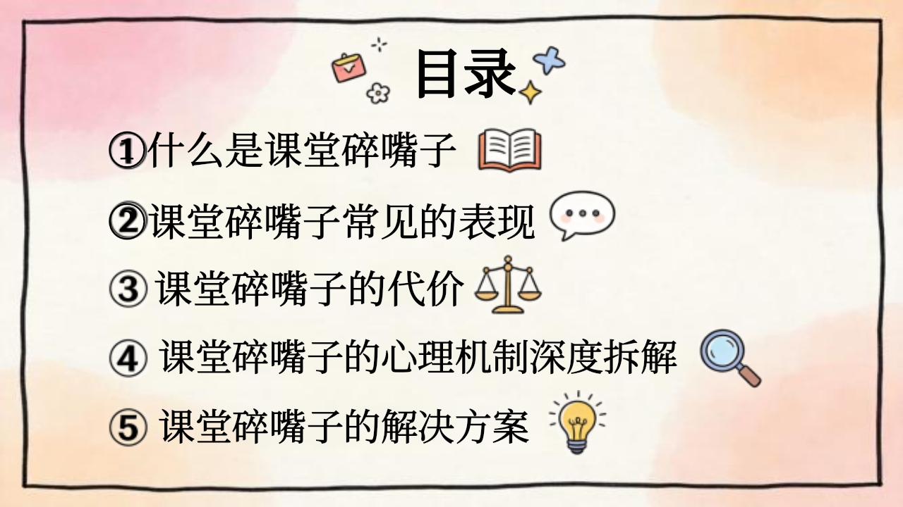 【中小学】【课堂纪律】主题班会:课堂碎嘴子的代价tangqi889小时前发布关注私信9.45MB27页04512 第1页 / 共27页 第2页 / 共27页 第3页 / 共27页 第4页 / 共27页 第5页 / 共27页 试读已结束,还剩22页,您可下载完整版后进行离线阅读 【中小学】【课堂纪律】主题班会:课堂碎嘴子的代价此内容为付费资源,请付费后查看¥9.9¥19.9VIP会员免费立即购买您当前未登录!建议登陆后购买,可保存购买订单付费资源© 版权声明本站是一个信息分享及获取的平台,不确保部分用户上传资料的来源及知识产权归属,资料由老师投稿,公开渠道整理,网友上传,如果侵犯到您的权益,请联系客服删除THE ENDPPT课件 文本预览 目课堂碎嘴子的代价⊙主题班会圓汇报人:班级成长系列主题班会 查看更多 收起部分 喜欢就支持一下吧点赞12 分享QQ空间微博QQ好友海报分享复制链接收藏