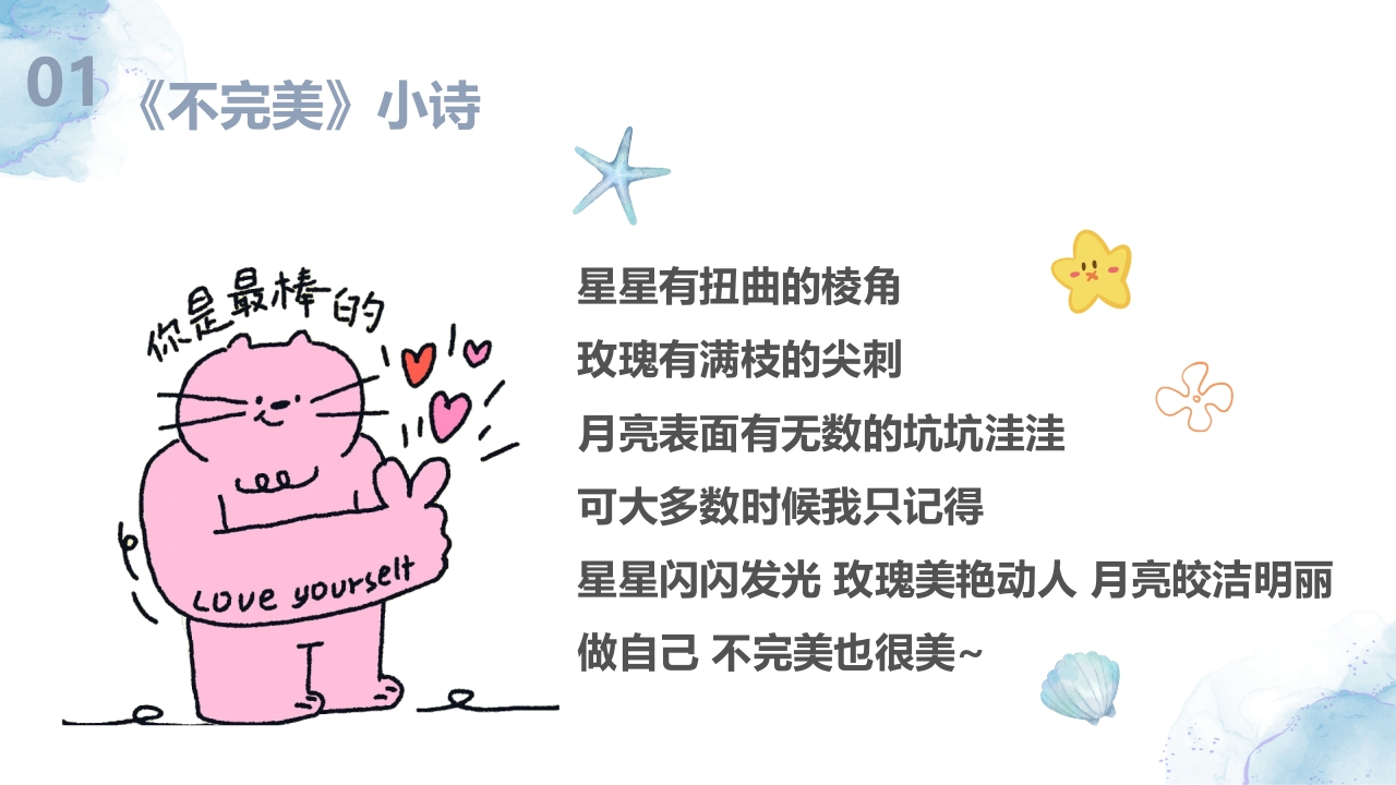 【心理健康课】主题班会:我很喜欢不完美的自己tangqi8813小时前发布关注私信43.02MB20页0508 第1页 / 共20页 第2页 / 共20页 第3页 / 共20页 第4页 / 共20页 第5页 / 共20页 试读已结束,还剩15页,您可下载完整版后进行离线阅读 【心理健康课】主题班会:我很喜欢不完美的自己此内容为付费资源,请付费后查看¥9.9¥19.9VIP会员免费立即购买您当前未登录!建议登陆后购买,可保存购买订单付费资源© 版权声明本站是一个信息分享及获取的平台,不确保部分用户上传资料的来源及知识产权归属,资料由老师投稿,公开渠道整理,网友上传,如果侵犯到您的权益,请联系客服删除THE ENDPPT课件 文本预览 我很喜欢大不完美的自己做一朵不内耗的花好好爱自己汇报人:XX★ 查看更多 收起部分 喜欢就支持一下吧点赞8 分享QQ空间微博QQ好友海报分享复制链接收藏