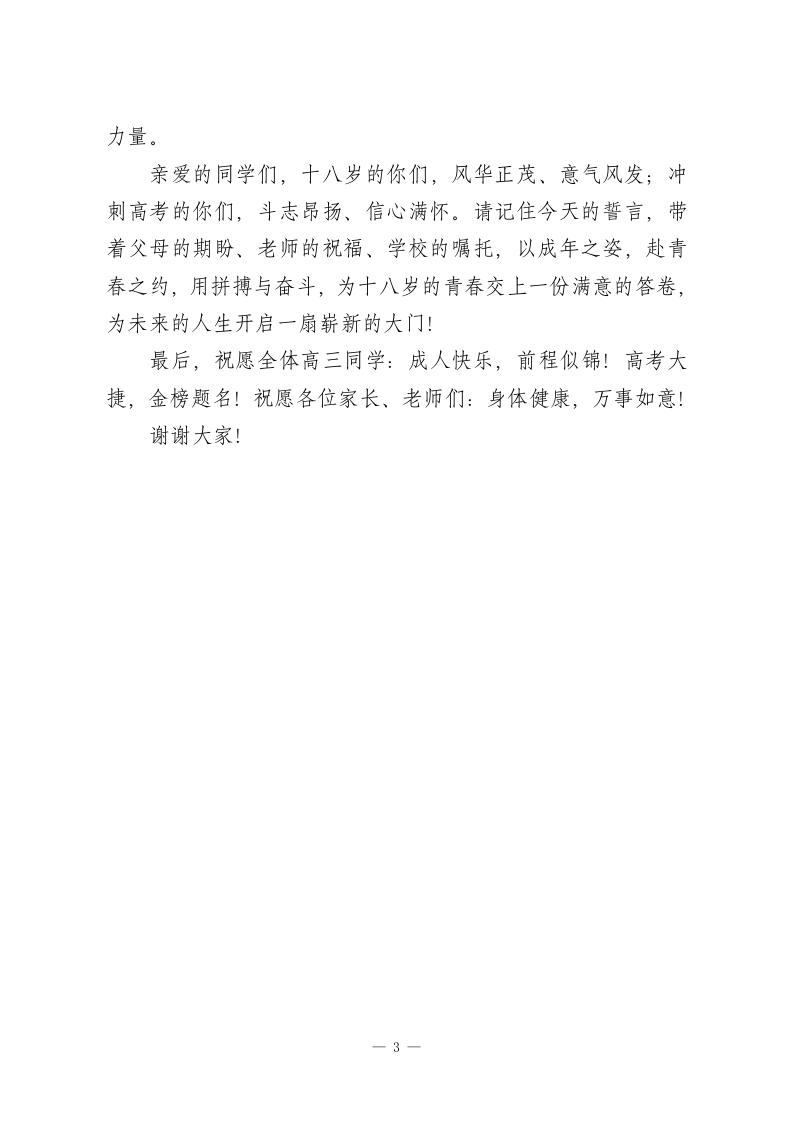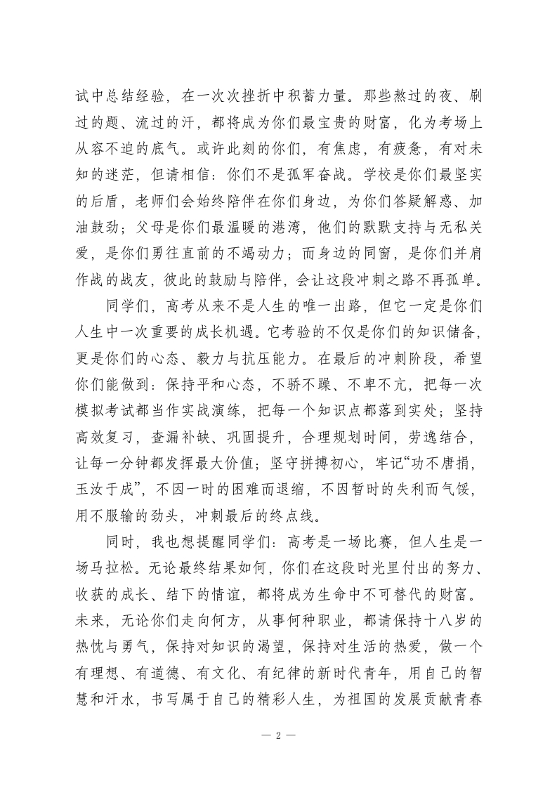 高三成人礼暨高考动员大会上,校长讲话:以成年之姿,赴青春之约亲爱的高三同学们、各位家长、老师们:大家上午好!今天,阳光正好,青春飞扬。我们齐聚在这里,为即将年满十八岁的同学们举行成人礼,也为冲刺高考的勇士们吹响冲锋的号角。十八岁,是人生的重要里程碑一一从今天起,你们将以法律意义上的成年人身份,肩负起责任与担当;而高考,正是你们成年后迎来的第一场人生硬仗,是青春最热烈的淬炼,是梦想最坚实的起点。同学们,十八岁是什么?是褪去稚气后的沉稳,是敢于担当的勇气,是对未来的无限憧憬。过去的十八年,你们在父母的呵护中成长,在老师的教海中前行,在亲友的陪伴中蜕变。从第一次握笔写字到如今驰骋题海,从懵懂孩童到风华少年,你们用坚持与努力,书写了属于自己的成长篇章。而今天,成人礼赋予你们的,不仅是“成年”的标签,更是一份沉甸甸的责任一一对自己的人生负责,对父母的期盼负责,对社会的培育负责,更对国家的未来负责。未来的路,有坦途也有坎坷,有鲜花也有荆棘,但请记住:成年意味着独立思考,意味着勇敢抉择,意味着无论顺境逆境,都能坚守初心、砥砺前行。站在高考倒计时的关键节点,我想对同学们说:高考是一场青春的战役,更是一次成长的修行。十二年寒窗苦读,十二载日夜兼程,你们在晨曦中诵读,在星光下刷题,在一次次考1