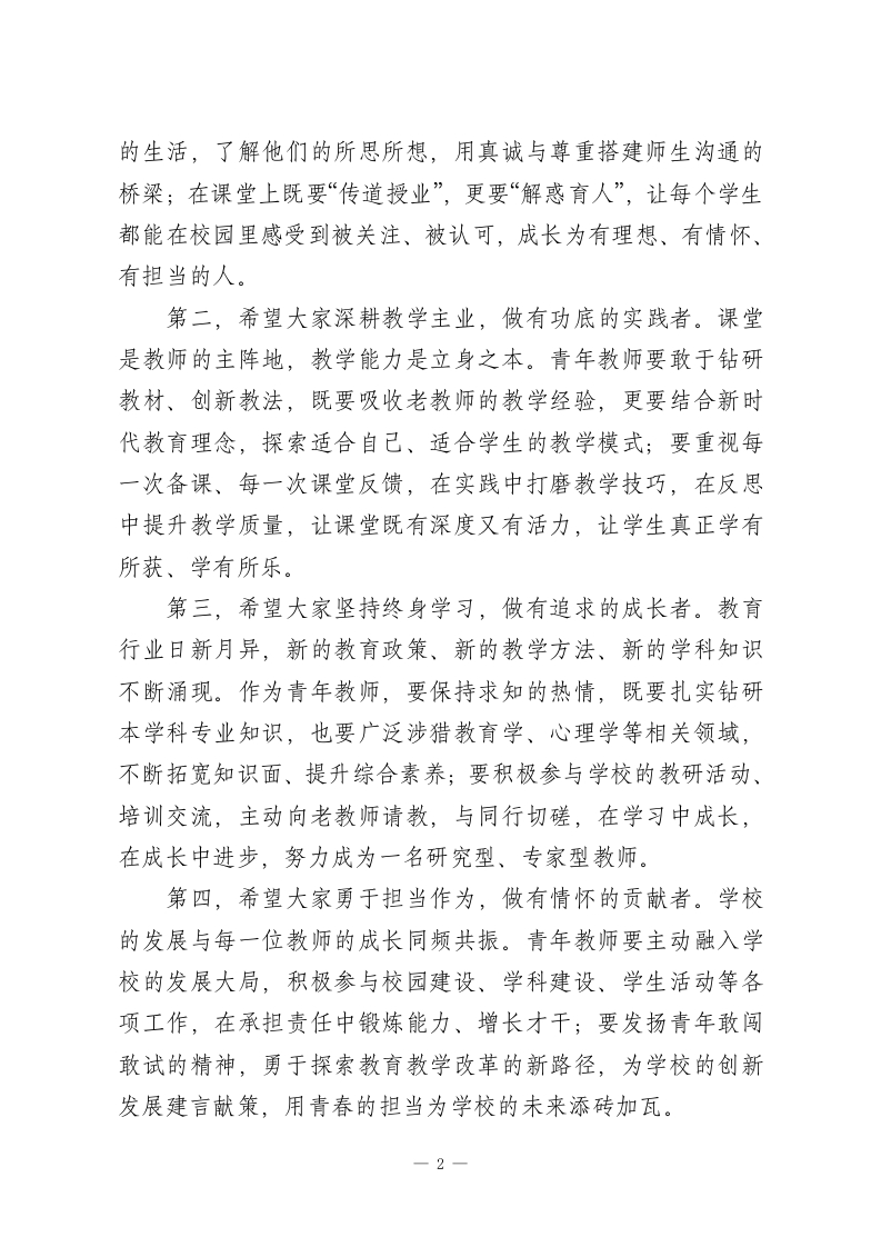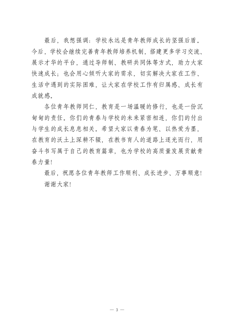 青年教师座谈会上,校长讲话:初心不改,成长同行各位青年教师同仁:大家下午好!今天能和咱们学校最有活力、最富朝气的青年教师们齐聚一堂,我由衷感到欣慰和振奋。首先,我代表学校,向各位青年教师为学校发展付出的辛勤努力,表示最诚挚的感谢!你们怀揣着对教育的热爱与初心,带着新鲜的理念、饱满的热情投身讲台,为学校的课堂教学、学生培养、校园文化注入了源源不断的生机,你们是学校教育事业的生力军,更是学校未来的希望所在。青年教师是教育传承与创新的核心力量。你们成长在教育改革不断深化的时代,既掌握着前沿的教育技术,又对新时代学生的特点有着天然的感知力一一你们用短视频记录学生的成长瞬间,用互动式教学打破课堂的沉闷,用平等沟通走进学生的内心世界,这些都是你们独有的优势。但同时,我们也清楚,青年教师在职业成长中难免会遇到困惑:比如如何平衡教学与科研的关系,如何应对不同类型学生的教育需求,如何在繁忙的工作中实现自我提升。今天的座谈会,就是想听听大家的真实心声,也和大家交流几点期望与共勉。第一,希望大家坚守教育初心,做有温度的教育者。教育的本质是心灵的唤醒。作为青年教师,既要传授知识,更要涵养学生的品格、守护学生的梦想。希望大家多花时间走进学生一1
