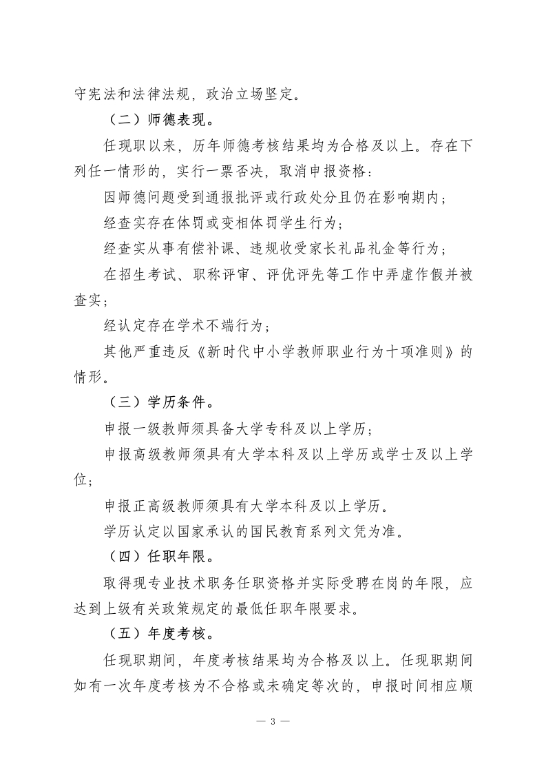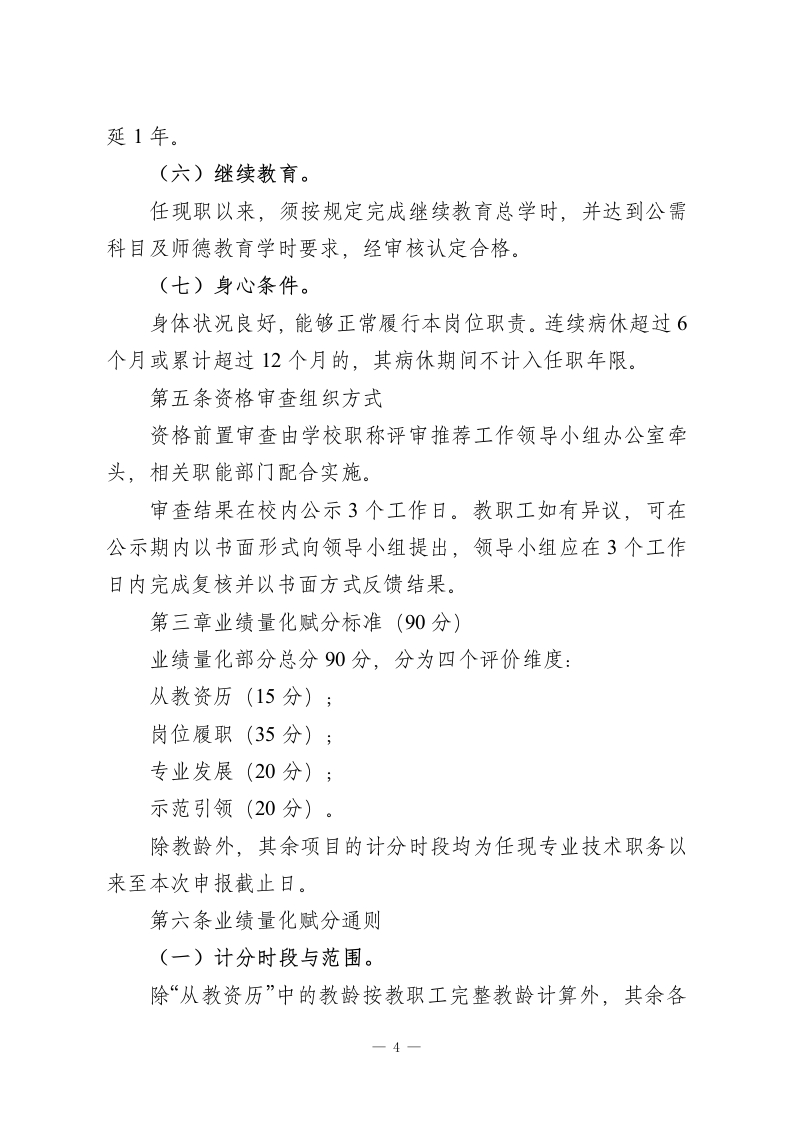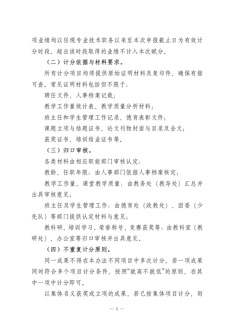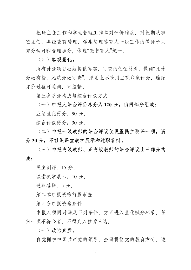 中小学教师中高级专业技术职务任职资格申报推荐综合评价量化赋分实施办法为进一步规范我校中高级专业技术职务任职资格的申报与推荐工作,构建科学、公正、透明的量化评价体系,充分发挥职称评审的激励导向功能,根据国家及省、市、区关于中小学教师职称评审的有关政策精神,结合学校实际,特制定本办法。第一章总则第一条适用范围本办法适用于本校在编在岗教师,申请一级教师(中级)、高级教师(副高级)和正高级教师专业技术职务任职资格时,学校内部开展的业绩量化评分及推荐排序工作。三级教师、二级教师实行考核认定,不纳入本办法调整范围。第二条量化赋分基本原则(一)师德前置。师德师风作为申报的首要条件,实行资格前置审核,不计入量化分值,但实行一票否决。凡师德审查未通过者,直接终止申报程序。(二)实绩导向。坚持以教育教学实际业绩为核心权重,突出课堂教学质量和育人效果,真正反映教师在一线岗位上的贡献,坚决防止片面强调学历、资历、论文或奖项的“唯”倾向。(三)育人为本。一1