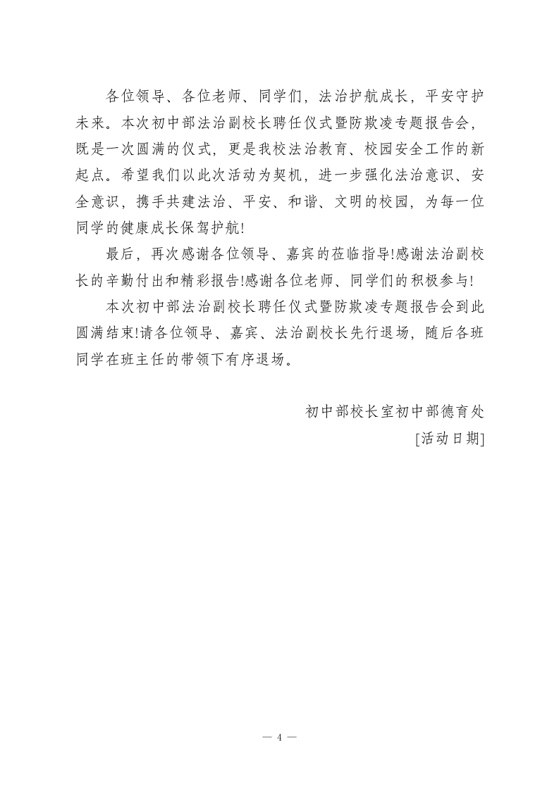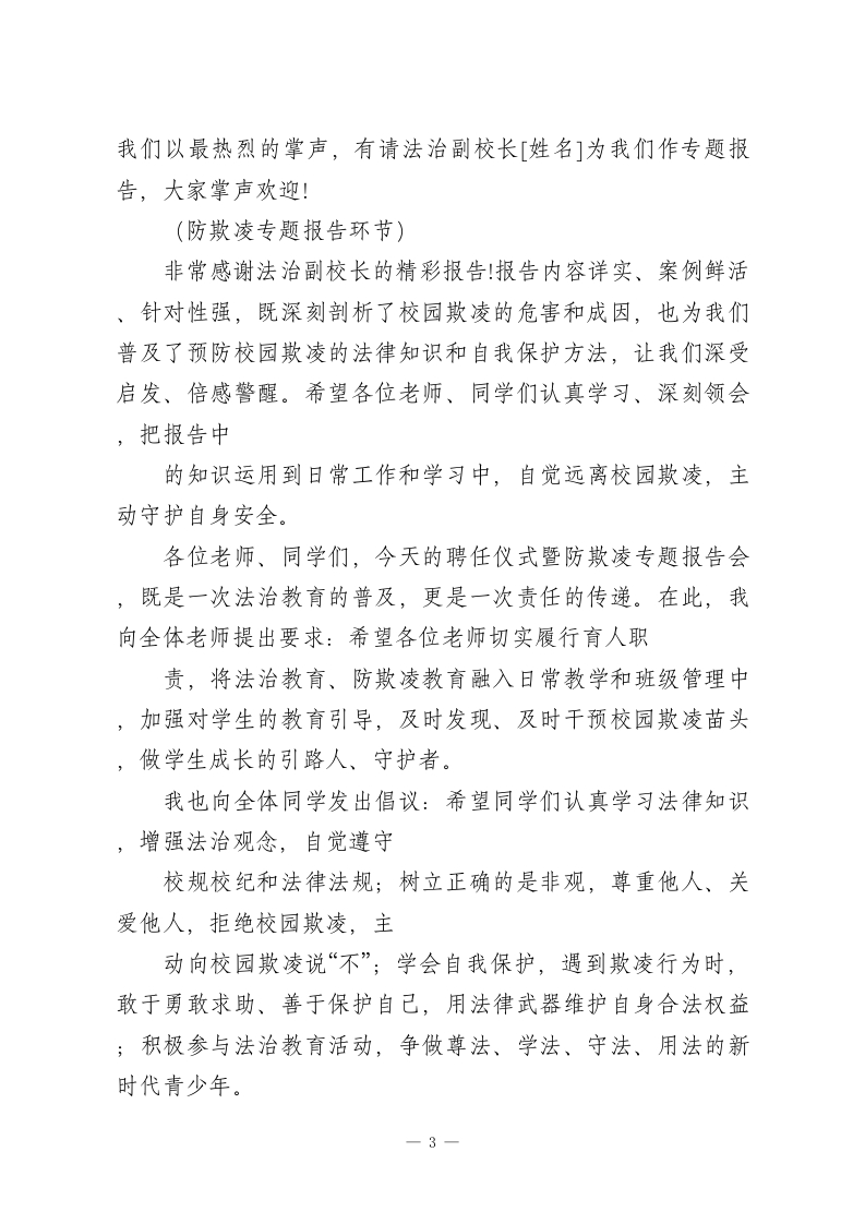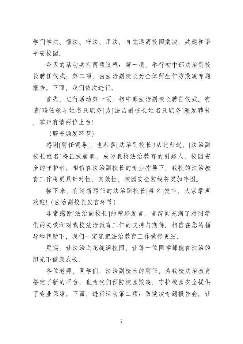 初中部法治副校长聘任仪式暨防欺凌专题报告会校长主持词尊敬的各位领导、法治副校长、各位老师、亲爱的同学们:大家上午好!法治是成长的基石,安全是幸福的保障。为深入贯彻落实法治教育进校园工作要求,进一步强化我校法治教育,筑牢校园安全防线,有效预防和遏制校园欺凌行为,守护全体学生健康快乐成长,今天,我们齐聚一堂,隆重举行初中部法治副校长聘任仪式暨防欺凌专题报告会。这既是我校推进法治校园、平安校园建设的重要举措,也是落实立德树人根本任务、护航学生成长的具体实践。首先,请允许我代表初中部全体师生,向百忙之中莅临本次活动的各位领导、各位嘉宾表示最热烈的欢迎!向即将接受聘任的法治副校长,表示最诚挚的敬意!向长期以来关心、支持我校法治教育和校园安全工作的各位同仁,表示衷心的感谢!出席今天活动的领导和嘉宾有:[依次介绍出席领导、嘉宾,可根据实际情况补充]。让我们再次以热烈的掌声,欢迎各位的到来!校园欺凌是影响学生身心健康、破坏校园和谐秩序的突出问题,而法治教育是预防校园欺凌、守护学生安全的根本途径。聘任法治副校长,是搭建校园法治教育桥梁、强化校园安全管理的重要举措,能够为我校法治教育注入专业力量,帮助同学们树立正确的法治观念,增强自我保护意识和能力,引导同1