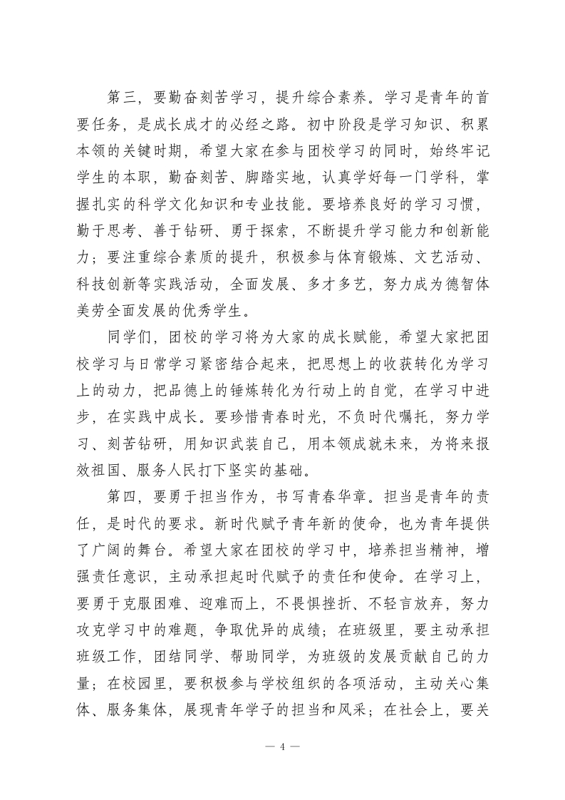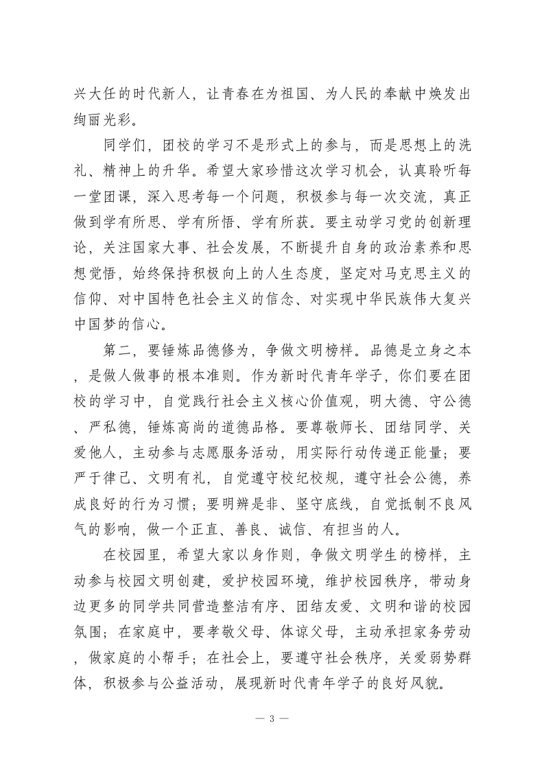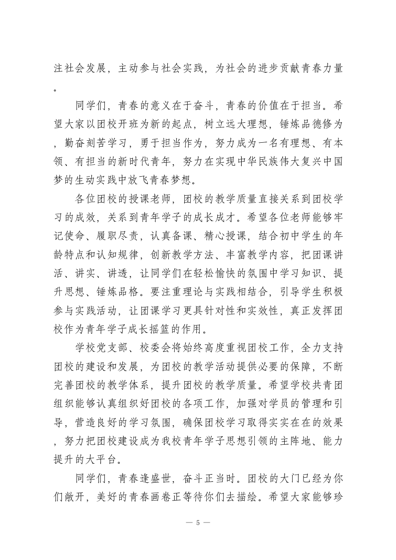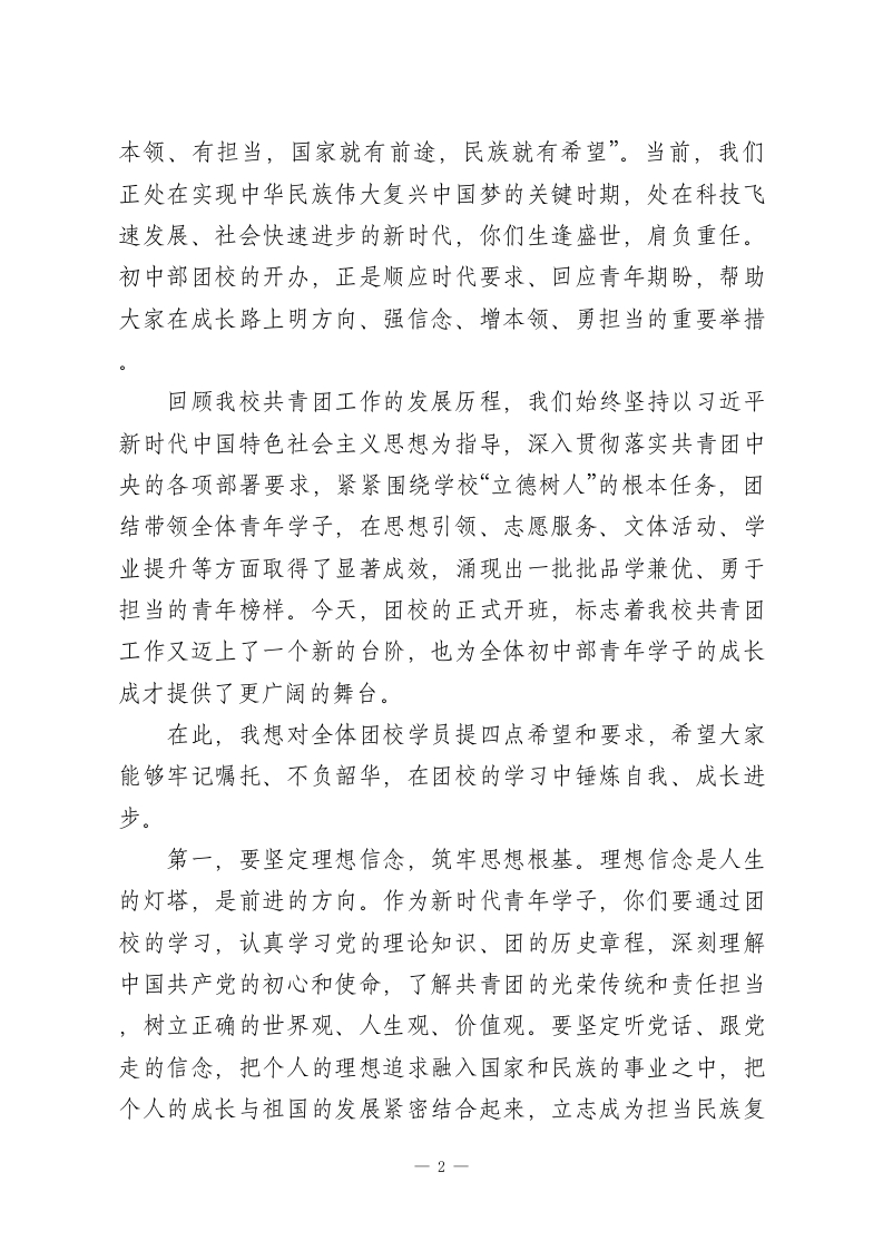 初中部团校开班仪式暨首场团课校长讲话尊敬的各位老师、亲爱的同学们:大家上午好!今天,我们怀着无比激动和崇敬的心情,齐聚在这里,隆重举行初中部团校开班仪式暨首场团课活动。这是我校共青团工作的一件大事,更是全体初中部青年学子政治生活中的一件盛事。在此,我谨代表学校党支部、校委会,向初中部团校的正式开班表示最热烈的祝贺!向担任团校授课任务的各位老师表示最衷心的感谢!向踊跃报名、主动参与团校学习的全体学员们,致以最诚挚的问候和最殷切的期望!中国共产主义青年团是中国共产党领导的先进青年的群众组织,是广大青年在实践中学习中国特色社会主义和共产主义的学校,是中国共产党的助手和后备军。初中阶段,是青年学子世界观、人生观、价值观形成的关键时期,是树立理想信念、锤炼品德修为、提升综合素养的黄金阶段。开办初中部团校,就是要为广大青年学子搭建一个学习党的理论、了解团的历史、锤炼思想品格、提升能力素质的重要平台,引导大家扣好人生第一粒扣子,树立远大理想,坚定信念追求,努力成长为有理想、有道德、有文化、有纪律的新时代青年,为将来加入中国共产主义青年团、成为合格的社会主义建设者和接班人奠定坚实基础。同学们,青年兴则国家兴,青年强则国家强。习近平总书记多次对青年一代提出殷切期望,强调“青年一代有理想、有1
