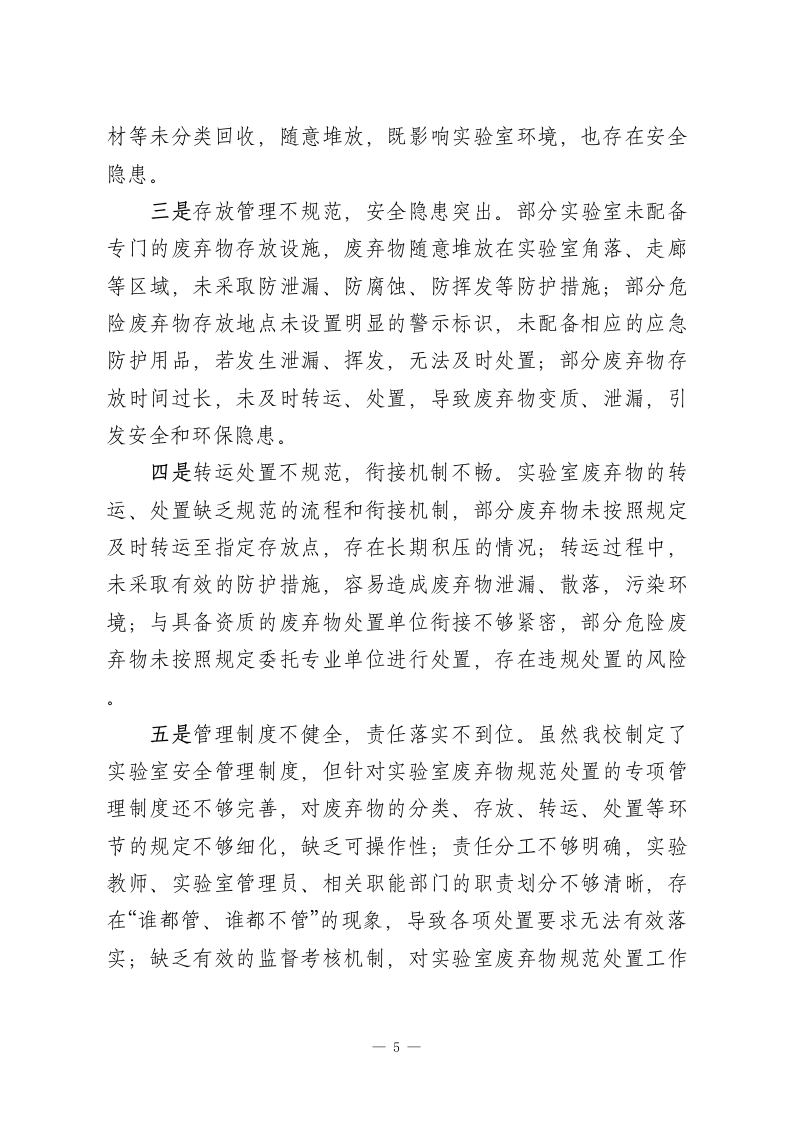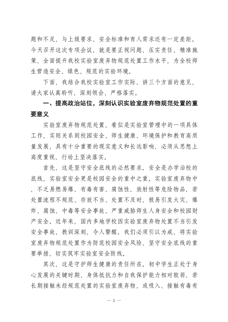 初中副校长在实验室废弃物规范处置专项会议讲话各位老师、各位工作人员:大家下午好!今天,我们专门召开实验室废弃物规范处置专项会议,主要任务是深入学习贯彻国家、省、市关于实验室安全管理和环境保护的相关法律法规及政策要求,全面排查我校实验室废弃物处置工作中存在的问题和隐患,部署下一阶段实验室废弃物规范处置各项工作,进一步强化责任意识、规范处置流程、筑牢安全防线,切实保障全体师生身体健康、校园环境安全和实验室工作有序开展。实验室是我校开展科学教学、培养学生实践能力和创新思维的重要场所,也是校园安全管理的重点区域。初中阶段的实验教学,涉及物理、化学、生物等多个学科,实验过程中会产生一定数量的废弃物,包括化学废液、实验废渣、废弃试剂、废弃实验器材、生物废弃物等。这些废弃物若处置不当,不仅会污染校园环境,破坏生态平衡,还可能引发火灾、腐蚀、中毒等安全事故,严重威胁全体师生的人身安全和身体健康,也不符合教育系统实验室安全管理的相关要求。近年来,我校高度重视实验室安全管理工作,不断完善实验室管理制度,规范实验操作流程,在实验室废弃物处置方面做了一些工作,取得了一定成效。但我们必须清醒地认识到,当前我校实验室废弃物规范处置工作还存在一些不容忽视的问1