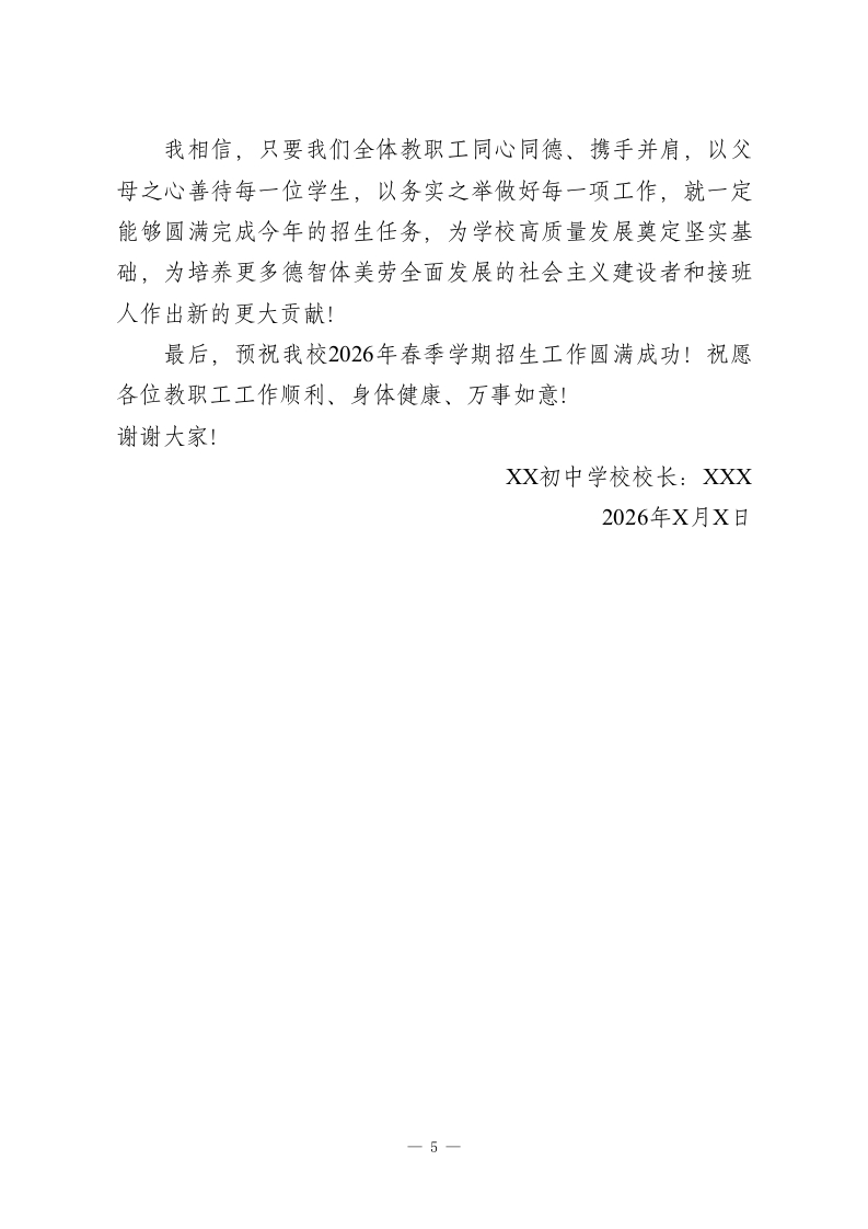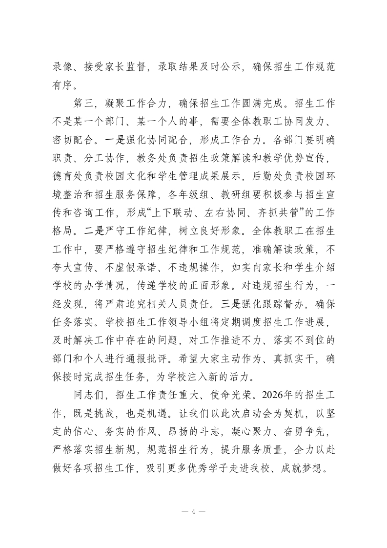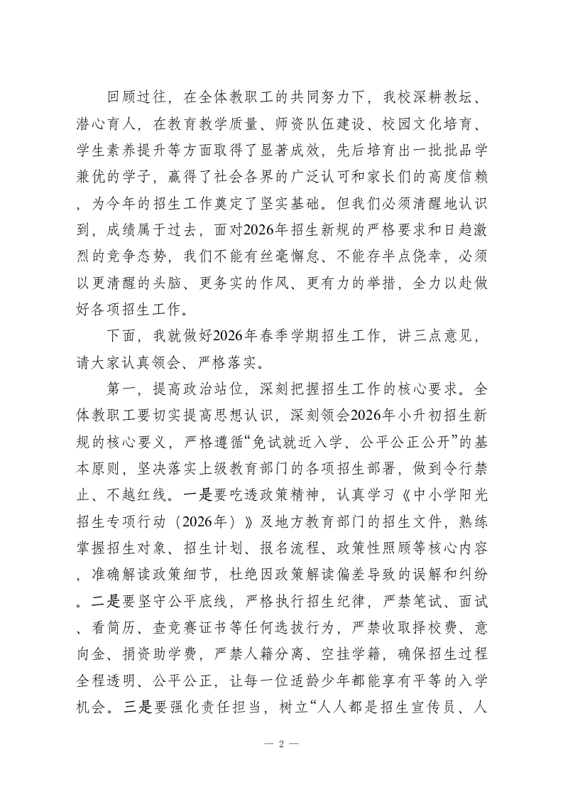 初中校长在2026年春季学期学校招生工作启动会上的讲话各位教职工、同志们:大家上午好!春潮涌动启新程,凝心聚力促发展。今天,我们隆重召开2026年春季学期学校招生工作启动会,主要任务是深入学习贯彻教育部《中小学阳光招生专项行动(2026年)》通知要求,全面部署我校今年的招生工作,统一思想、明确目标、压实责任、凝聚合力,确保招生工作平稳、有序、规范推进,为学校高质量发展储备优质生源、筑牢坚实根基。在此,我代表学校领导班子,向即将投身招生工作的全体教职工,致以诚挚的问候和衷心的感谢!感谢大家始终坚守教育初心、主动担当作为,多年来为学校招生工作付出的辛勤努力和无私奉献。招生工作是学校发展的“生命线”,是关乎学校生存与发展的头等大事,更是践行“办人民满意教育”宗旨的重要体现。2026年是义务教育招生政策全面优化的关键一年,教育部明确要求从秋季学期起,全国统一执行小升初新规定,公办、民办初中一视同仁,全面落实免试就近入学、均衡编班等要求,彻底终结择校、快慢班乱象,这对我们的招生工作提出了更高、更严的要求。当前,招生形势日趋复杂,各学校竞争愈发激烈,加之政策调整带来的新变化、新挑战,做好今年的招生工作,不仅考验着我们的责任与担当,更关乎每一位适龄少年的成长未来,关乎学校的长远发展。一1