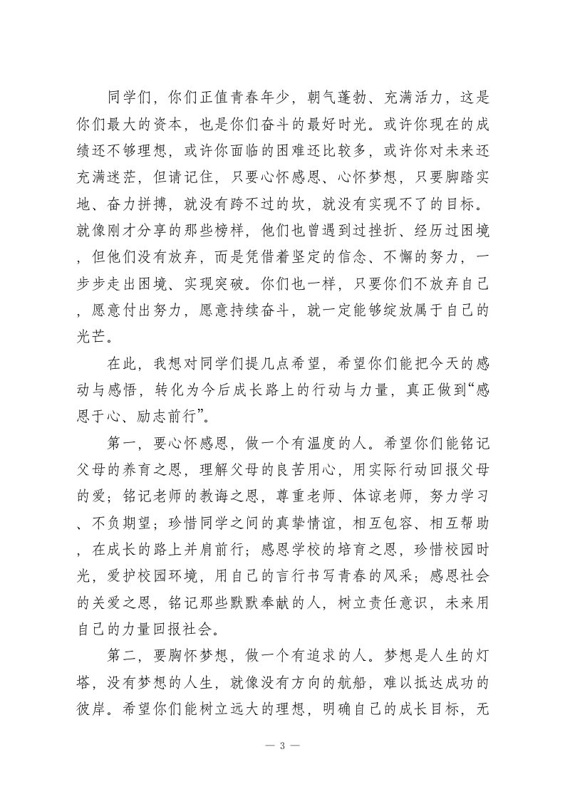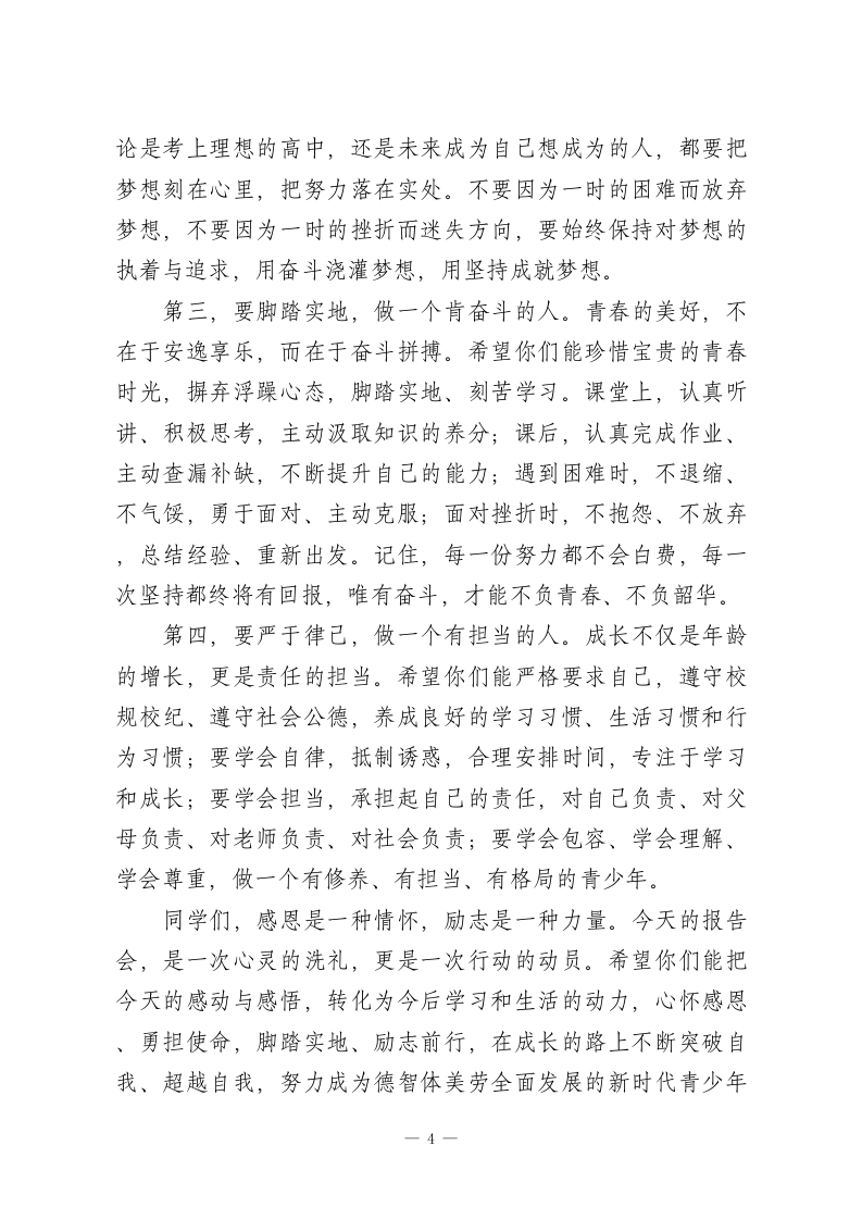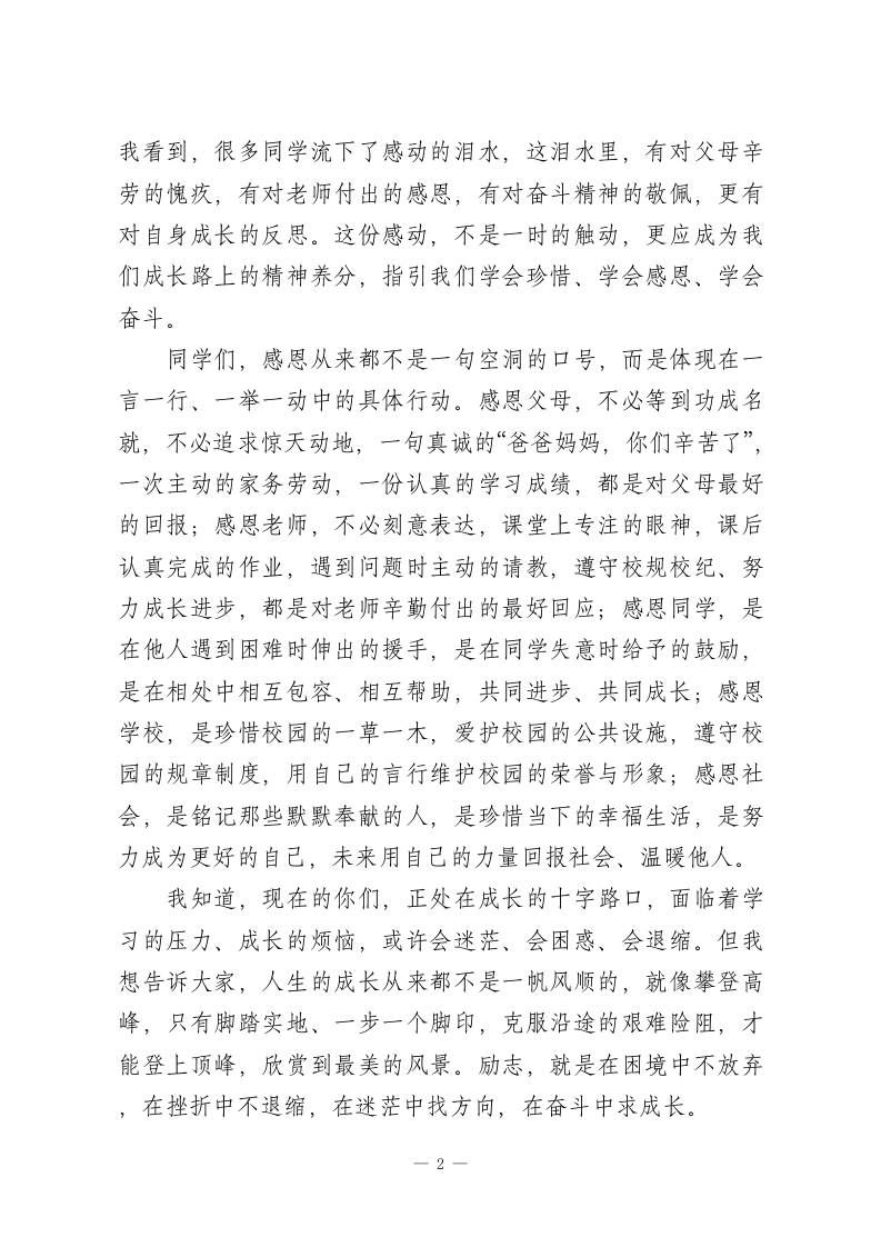 初中校长在感恩励志主题报告会上的总结陈词各位老师、同学们:大家下午好!今天,我们齐聚一堂,隆重举行本次感恩励志主题报告会。刚才,我们聆听了感人至深的分享、观看了触动心灵的画面、参与了温暖人心的互动,相信每一位老师、每一位同学,心中都充满了感动与震撼,也收获了启发与力量。在此,我谨代表学校,向为本次报告会辛勤付出的各位老师、分享嘉宾表示最衷心的感谢,也向认真聆听、用心感悟的每一位同学,致以最诚挚的肯定与期许。感恩,是中华民族的传统美德,是融入我们血脉的文化基因;励志,是青少年成长的精神动力,是成就人生梦想的必经之路。初中阶段,是你们世界观、人生观、价值观形成的关键时期,也是你们学会感恩、学会担当、学会奋斗的黄金阶段。本次主题报告会,我们以“感恩于心、励志前行”为核心,就是希望引导每一位同学,懂得感恩身边的温暖与陪伴,汲取成长的力量与勇气,树立远大理想,脚踏实地奋斗,努力成长为有温度、有担当、有追求的新时代青少年。刚才,分享嘉宾用朴实的语言、真实的事例,为我们讲述了感恩的故事、奋斗的历程。他们中有感恩父母含辛茹苦养育的学子,有感恩老师悉心教诲栽培的榜样,有在困境中坚守梦想、奋力拼搏的强者。这些故事没有惊天动地的壮举,却有着直抵人心的力量;没有华丽的辞藻,却有着打动灵魂的温度。1
