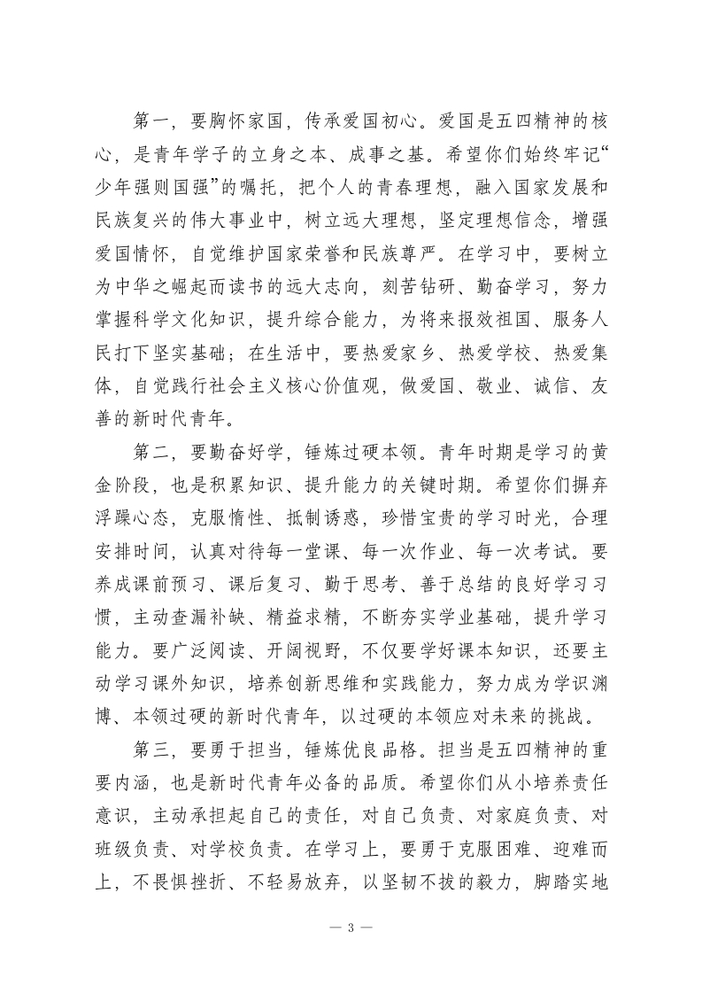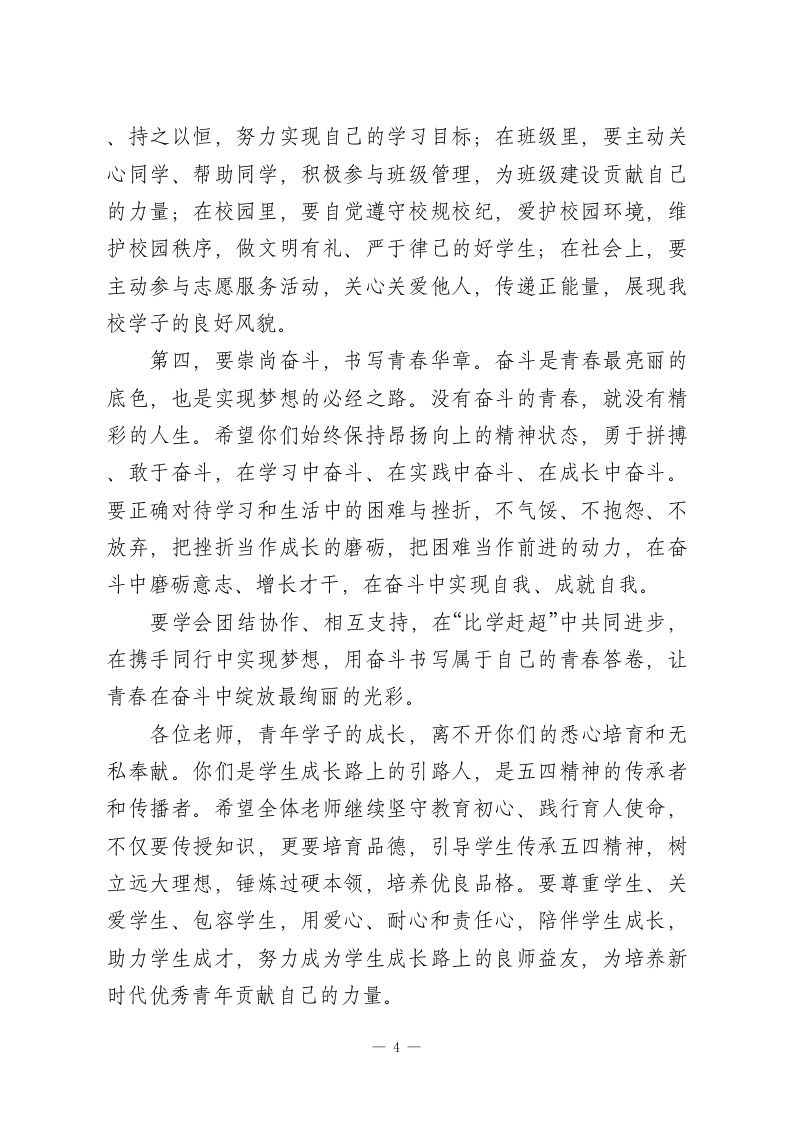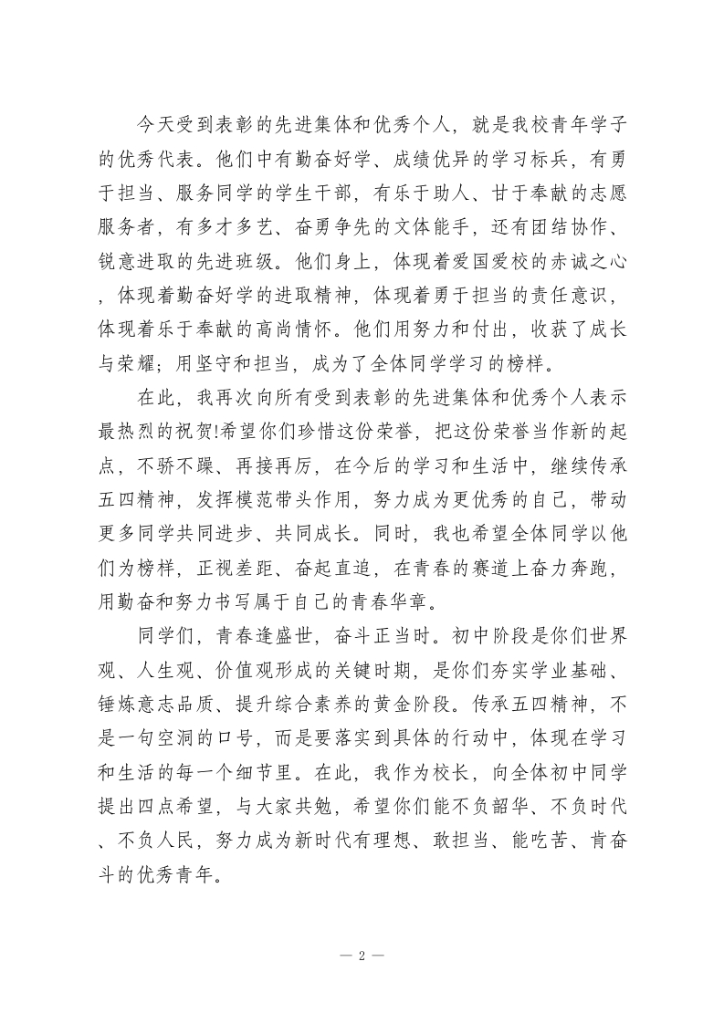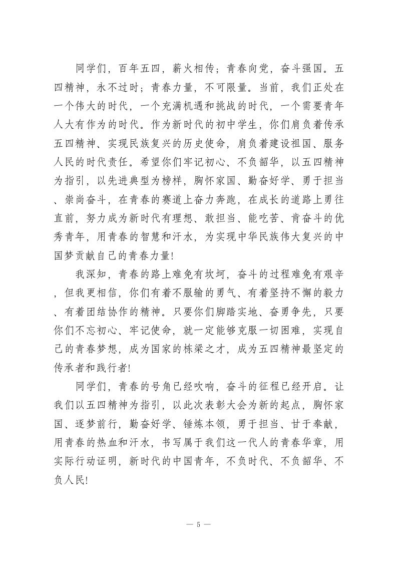 初中校长在五四表彰大会上的总结讲话尊敬的各位老师、亲爱的同学们:大家下午好!五月榴花照眼明,青春奋进正当时。在这充满激情与荣耀的日子里,我们齐聚一堂,隆重举行我校五四表彰大会,共同纪念五四运动,传承五四精神,表彰在过去一年里表现突出、勇于担当的先进集体和优秀个人。首先,我谨代表学校全体领导班子,向受到表彰的先进集体和优秀个人,致以最热烈的祝贺和最崇高的敬意!向辛勤耕耘在教育一线、悉心培育青年学子的全体老师们,致以最衷心的感谢!向全体初中同学,致以节日的问候和美好的祝愿!百年前,一群热血青年高举民主与科学的旗帜,挺身而出、奋勇抗争,用青春的热血和生命,开启了中国近代史上波澜壮阔的反帝反封建斗争,铸就了“爱国、进步、民主、科学”的五四精神。百年薪火相传,五四精神早已融入中华民族的血脉,成为一代又一代中国青年奋勇前行的精神旗帜,成为激励我们不忘初心、奋勇争先的精神动力。作为新时代的初中学生,你们生逢盛世、肩负重任,是五四精神的传承者,更是国家未来的建设者和接班人。过去一年里,我校全体青年学子牢记初心使命,传承五四精神,在学习上勤奋刻苦、奋勇争先,在品德上严于律己、坚守底线,在活动中积极参与、勇于担当,用实际行动诠释了新时代青年的责任与担当,展现了我校学子朝气蓬勃、奋发向上的青春风采。1