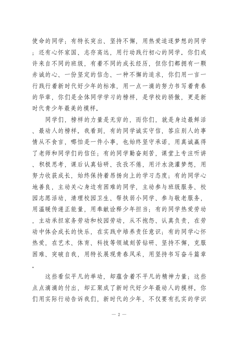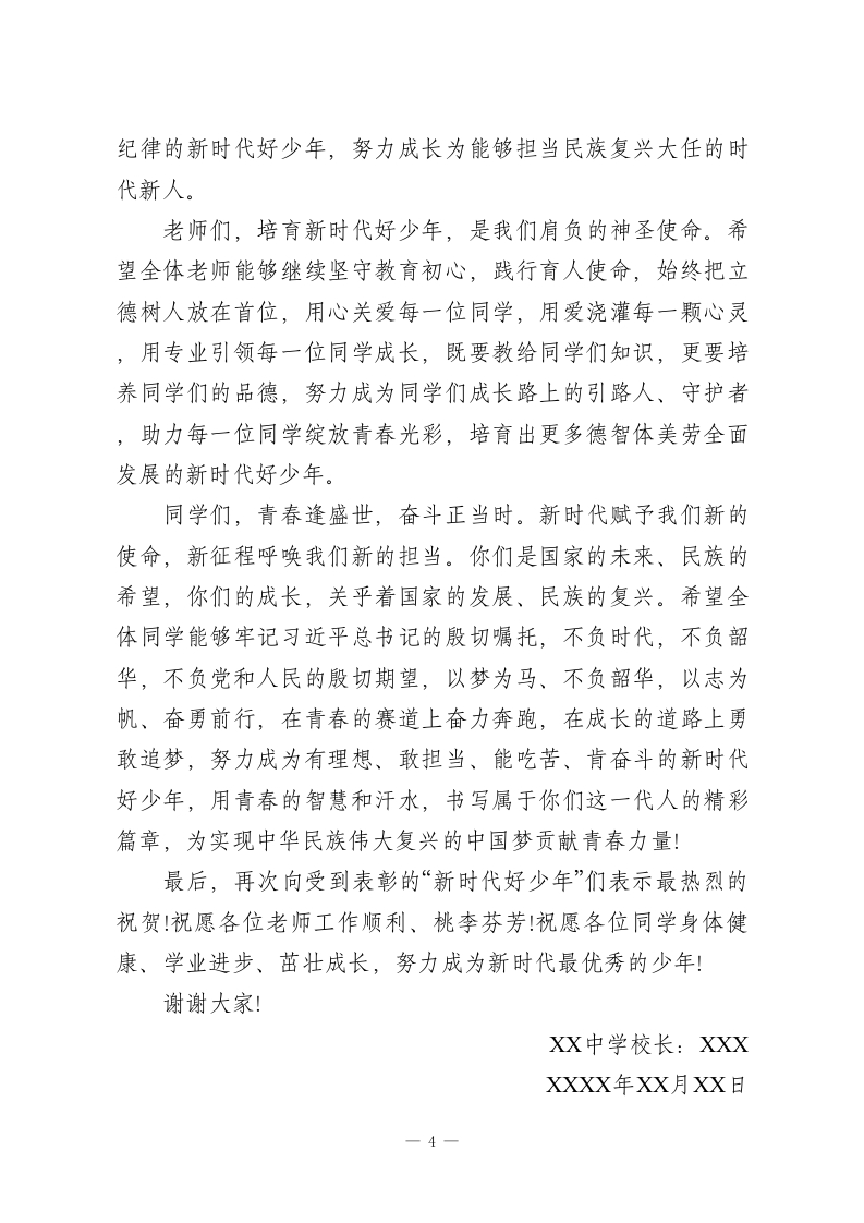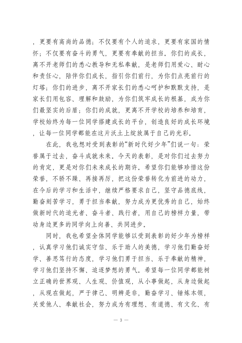 初中校长在新时代好少年颁奖仪式致辞尊敬的各位老师、亲爱的同学们:大家上午好!春山可望,向阳生长;少年有志,逐梦前行。在这充满生机与希望的美好时节,我们齐聚一堂,隆重举行我校新时代好少年颁奖仪式,共同见证榜样的力量,共同致敬青春的担当。首先,我谨代表学校全体师生,向受到表彰的“新时代好少年”们,表示最热烈的祝贺和最崇高的敬意!向辛勤培育他们的各位老师、悉心陪伴他们的各位家长,致以最衷心的感谢!少年兴则国兴,少年强则国强。习近平总书记曾深情寄语青少年:“新时代中国少年要以实现中华民族伟大复兴为己任,增强做中国人的志气、骨气、底气,不负时代,不负韶华,不负党和人民的殷切期望!”这既是嘱托,更是指引,为当代青少年的成长成才指明了方向。我校始终坚持“立德树人”的根本任务,以培育德智体美劳全面发展的社会主义建设者和接班人为目标,深耕校园文化,厚植育人沃土,鼓励每一位同学向上向善、向阳而生,在品德修养、学习成长、社会实践、志愿服务等方面锤炼自我、提升自我,涌现出了一批批品德优良、勤奋好学、乐于奉献、勇于担当的新时代好少年。今天受到表彰的各位同学,就是我校少年群体中的杰出代表。你们当中,有诚实守信、严于律己,用行动诠释美德的同学;有勤奋好学、善思笃行,用努力书写成长的同学;有乐于助人、关爱他人,用温暖传递善意的同学;有热爱劳动、勇于担当,用责任扛起1