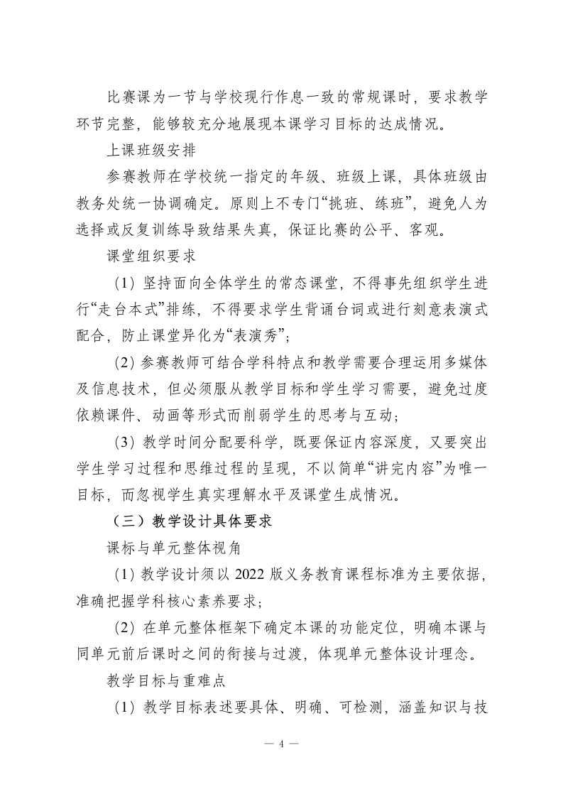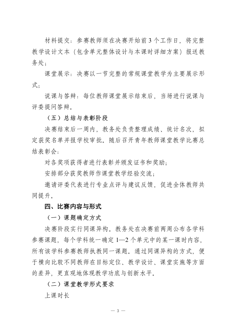 青年教师课堂教学比赛活动方案完整版(含附件)一、活动目的依托《义务教育课程方案和课程标准(2022年版)》,以课堂教学竞赛为载体,为青年教师搭建一个展示课堂风采、交流教学思路、锤炼教学能力的实践平台。通过有组织的比赛,引导青年教师深入研读课标、吃透教材内容、把握学生学情,推动他们实现由“能上台讲课”向“善于上好课”的专业提升。同时,通过本次活动发现并培育一批教学潜质突出、发展后劲充足的青年教师,为学校学科带头人和骨干教师梯队建设储备人才。二、参赛对象与条件(一)参赛对象教龄在5年及以下(含第5年)、且年龄不超过35周岁的在岗专任教师。教龄与年龄两项指标需同时符合方可报名参赛。(二)参赛条件参赛教师须同时满足以下四项基本条件:本学期参加集体备课的出勤率达到90%及以上;本学期听课任务完成进度不少于规定节次的60%;最近一次学校组织的备课检查结果为合格及以上等级;无教学事故记录或教学责任事故。符合以上条件的教师可自行报名参加,各教研组亦可根据本组实际情况推荐符合条件且教学态度端正、发展意愿强的青年教师参赛。