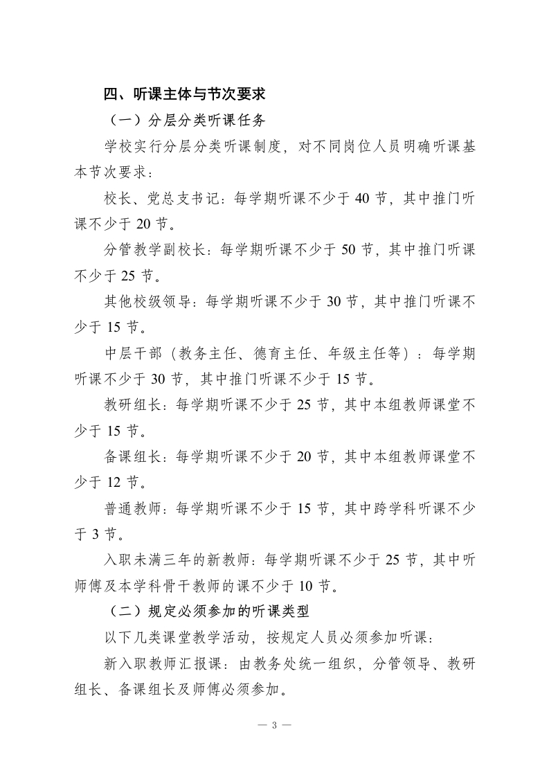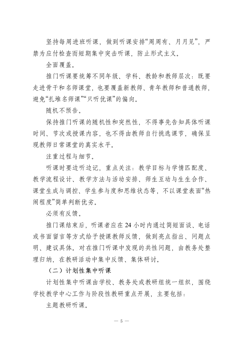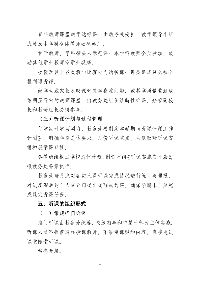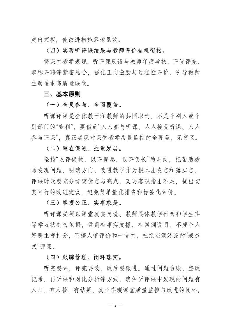 学校听课评课制度实施方案:听有标准,评有量表,改有跟踪,考有挂钩一、指导思想以立德树人为根本任务,以提高课堂教学实效为核心,以课堂教学改革和教师专业成长为主线,把听课评课作为推动“向课堂要质量、向课堂要发展”的重要抓手。通过建立常态化、规范化、科学化的课堂教学质量监控与改进机制,引导全体教师沉下心来研究课堂、打磨课堂、优化课堂,持续提升课堂教学品质,促进教师教育教学能力稳步发展。二、工作目标通过完善和落实学校听课评课制度,重点实现以下四个方面的目标(一)构建课堂教学质量的常态监控体系。形成覆盖全员、贯穿全程、数据可查的课堂质量监测网络,真实、全面地掌握学校课堂教学运行状况,为管理决策和改进教学提供依据。(二)搭建教师专业学习与交流平台。以听课评课为纽带,促进教师之间相互观摩、相互借鉴、共同研讨,营造开放、合作、共享的教研氛围,推动教师团队整体专业水平提升。(三)形成课堂改进的闭环运行机制。坚持问题导向,构建“听课发现问题一评课诊断归因一制定整改方案一跟踪回访提升”的闭环模式,切实破解课堂教学中的1