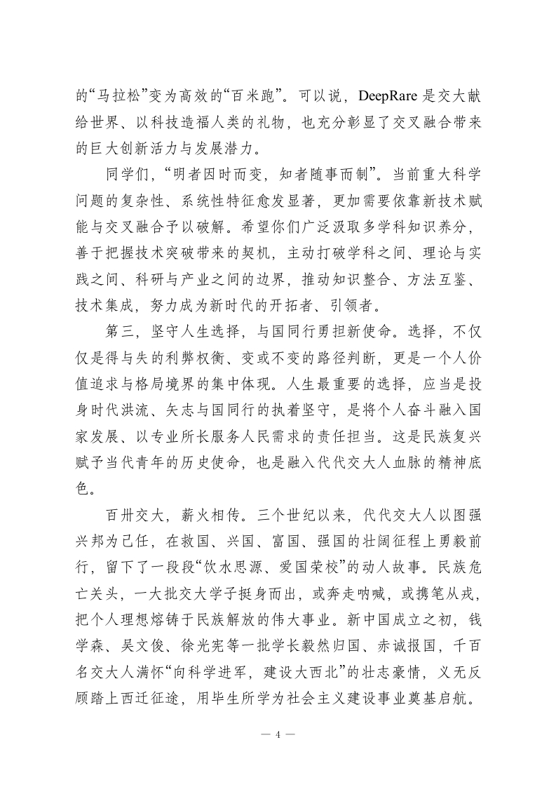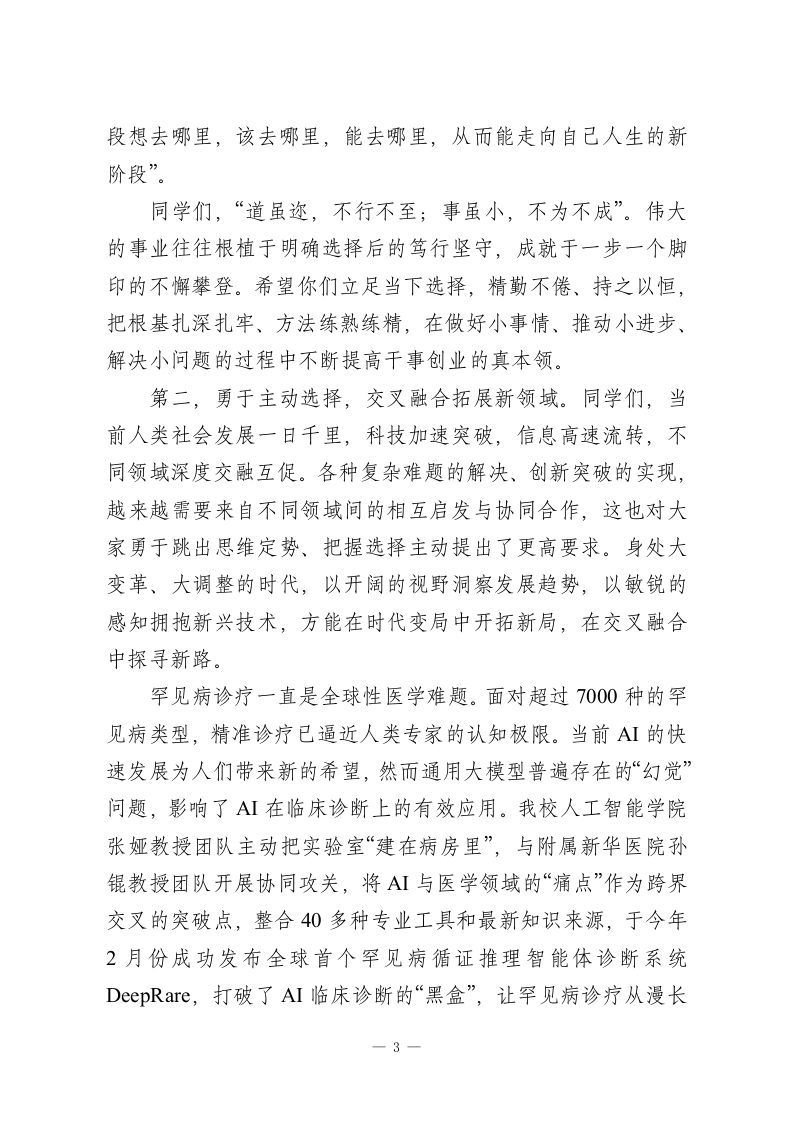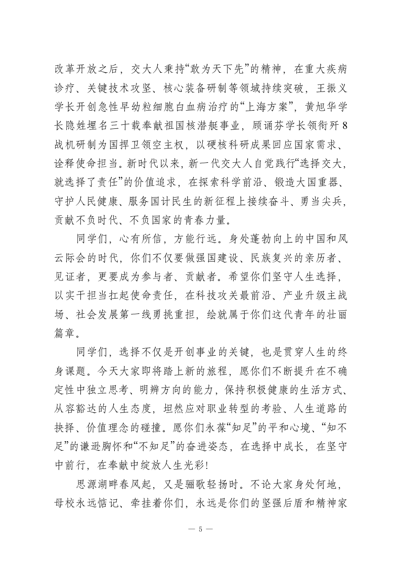 在2026年研究生毕业典礼上的讲话:把握选择向新而行亲爱的同学们:大家好!今天,我们相聚于春日校园,隆重举行上海交通大学2026年研究生毕业典礼,共同见证你们人生中的重要时刻。首先,我代表学校向圆满完成学业、奔赴人生新征程的你们表示热烈的祝贺,向一路陪伴大家成长的老师和亲友们致以衷心的感谢!光阴流转,逐梦前行。交大求学的时光如白驹过隙,你们在浩瀚文献中涵养科学思维,在实验求证中锤炼学术素养,在组会交流中碰撞思维火花,在深入实践中感悟社会责任,逐步构建起自己的知识体系、专业能力和价值坐标,这成为大家把握人生选择、奔赴星辰大海的底气与信心。即将迎来130周年校庆的交大,陪伴见证了你们的成长蜕变,也将与大家一起迈上新起点、书写新篇章。在不久前闭幕的全国两会上,曾毓群学长关于“中国的新能源产业为什么能迅速崛起”的回答令人深思。他说,首先是国家政策的战略定力,让全行业得以锚定清晰方向;此外要始终坚持自主创新,这也是宁德时代多年来的发展秘诀。正是因为坚守战略选择、深耕创新实践,才有了中国新能源产业波澜壮阔的发展图景。当下,全球科技创新进入空前密集活跃期,人工智能技术加速迭代,科技革命与大国博弈相互交织。今日中国科技创新成果丰硕,新质生产力加速形成,中国式现代化迈出1