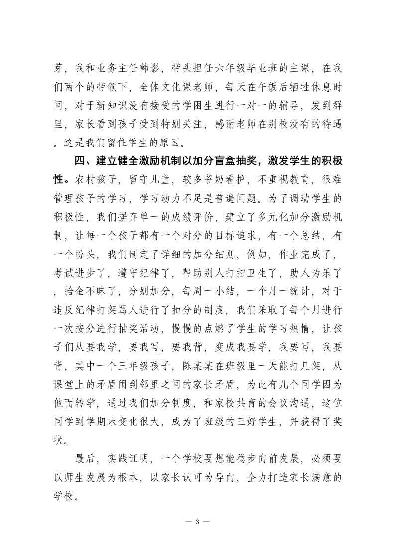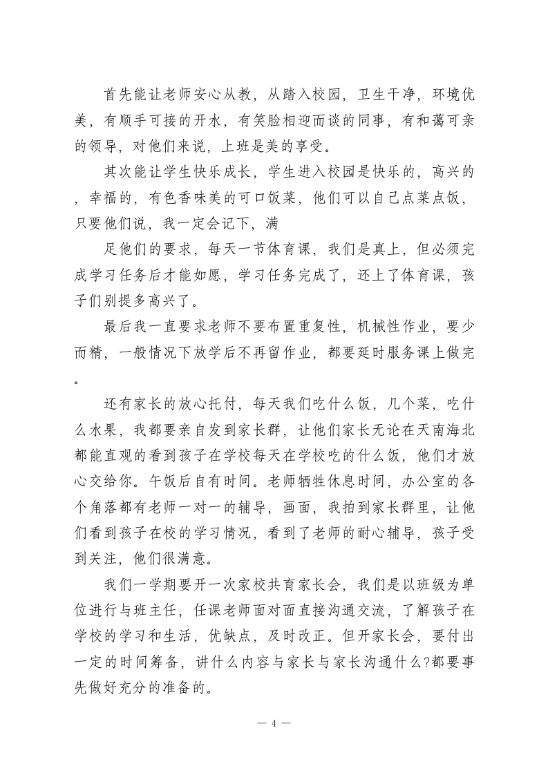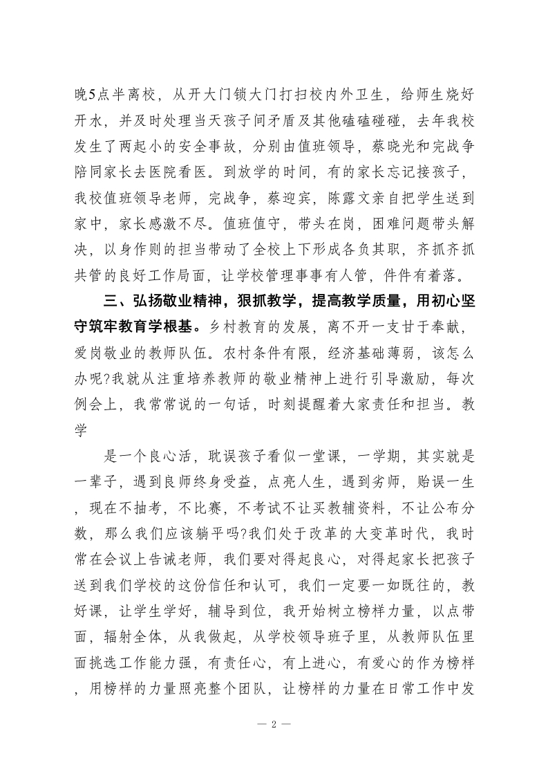 做一名凝聚人心、敬业乐群的好校长在全镇“强管理促教学提质量”推进会上的讲话尊敬的各位领导,各位校长同仁:大家好!感谢领导给我这个机会,让我和大家坐在一起交流分享学校教学的心得与感悟。其实各位同仁管理学校大同小异,都有自己独特的管理方法和制度,今天我结合自己的学校管理方法和做法,给大家交流一下。学校管理就是关好门,管好人,求生存,狠抓核心目标,提高教学质量,管好一所学校,没有捷径可走关键在管理,核心在人心,唯有用心用情用爱把责任扛在肩上,把教师,把学生放在心上。现在我就围绕校园安全,班子分工,教师敬业,学生激励,狠抓教学,提高质量四个方面分享一下我们学校的做法。一、筑牢安全防线,把校园安全作为安全办学第一底线。从进学校大门的护学岗到封闭管理,课间值守,食堂卫生,领导带班,紧盯课间活动,重点开展防溺水安全,交通安全,防火,防电,防欺凌安全活动,开展主题班会,落实“1530”安全培训。二、明确班子分工,以责任落实撬动管理实效。领导班子是学校发展的核心动力,要做到分工明确,各负其责,协同努力,负责对接上级布置的各口任务进行分工,推进各项工作任务完成。我们学校一位领导带两位值班老师,从早8点到校,1