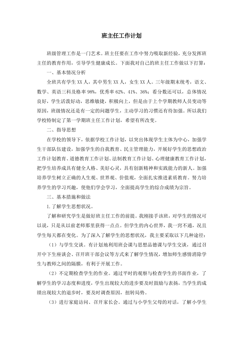 班主任工作计划班级管理工作是一门艺术。班主任要在工作中努力吸取新经验,充分发挥班主任的教育作用,引导学生健康成长。下面我对自己的班主任工作做以下打算:一、基本情况分析全班共有学生XX人,其中男生XX人,女生XX人。三年级期末统考,语文、数学、英语三科及格率98%,优秀率62%、41%、36%:看分数还可以,总体情况良好,学生活泼好动,思维敏捷,积极向上,但是由于上个学期教师人员变动等原因,班级情况还是有一定的问题学生,主动学习的习惯还有待加强。所以我们学校特制定了第一学期班主任工作计划,希望有所改变。二、指导思想在学校的领导下,依据学校工作计划,以突出体现学生主体为中心,加强学生干部队伍建设,加强学生的自我教育、民主管理能力,开展好学生的思想政治工作计划教育、道德教育工作计划、法制教育工作计划、心理健康教育工作计划,把学生培养成具有健全人格、美好心灵,具有创新精神和实践能力的新人。加强培养学生树立正确的人生观、世界观、价值观,全面扎实推进素质教育。努力培养学生的学习兴趣,使他们学会学习,全面提高学生的综合成绩为宗旨。三、基本措施和做法1.了解学生思想状况。了解和研究学生是做好班主任工作的前提。我刚接手该班,对学生的情况可以说,只是从以前老师那里获得一点点。但学生的内心世界,我一窍不通,况且学生每天都在变化。为了深入了解学生的思想状况,我主要采取以下几种途径:(1)与学生交谈。有计划地利用班会课与思想品德课与学生交谈,通过召开中下生座谈会、召开班干部会议等方式来了解学生情况,增加师生感情消除学生与教师之间的隔膜,有利于开展工作。(2)不定期检查学生的作业。通过平时的观察与检查学生的书面作业,了解学生的学习态度和进度,学生出现较大的进步要及时鼓励与表扬,当学生的成绩出现较大的退步时,要及时调查原因,扭转局势。(3)进行家庭访问、召开家长会。通过与小学生父母的对话,了解小学生